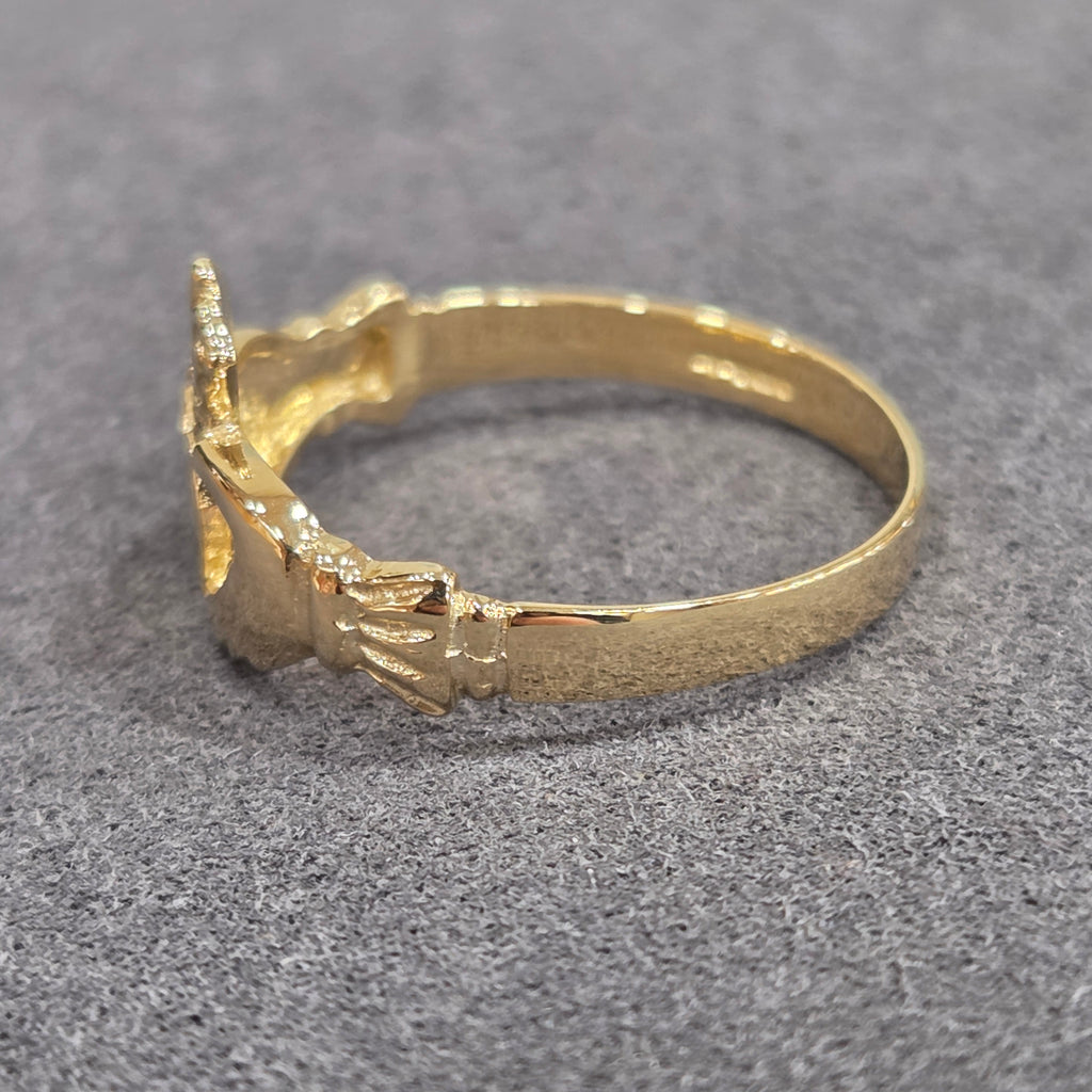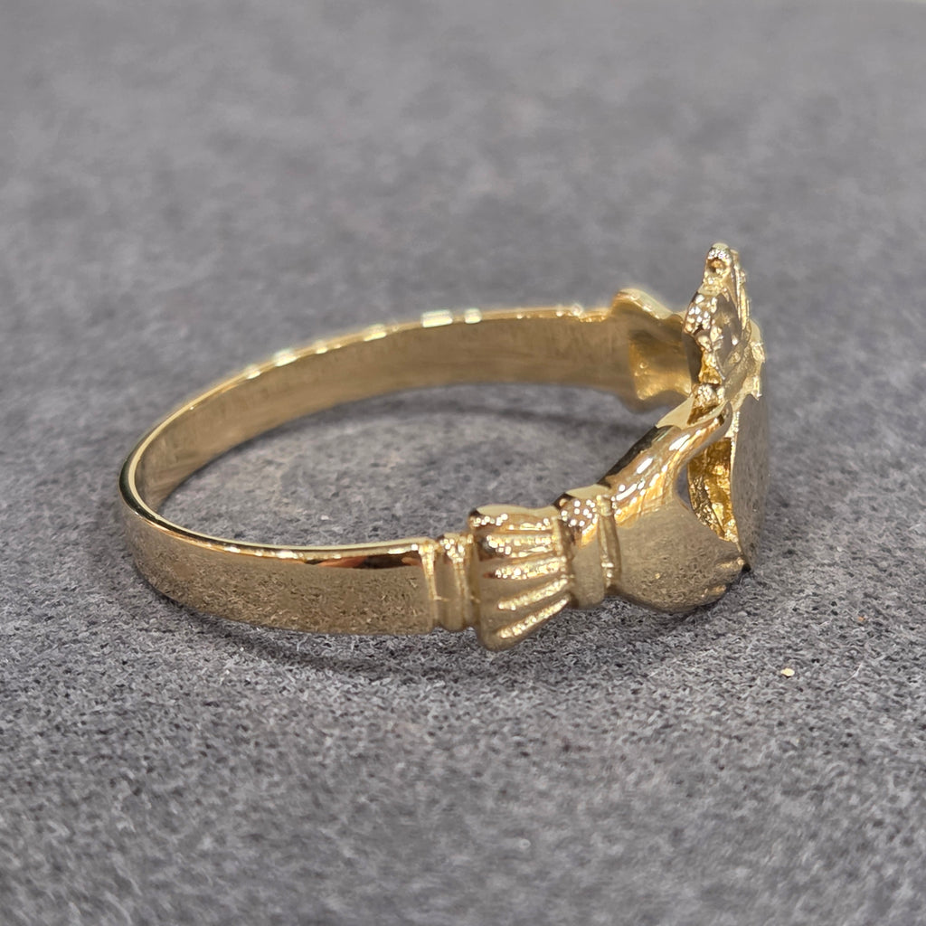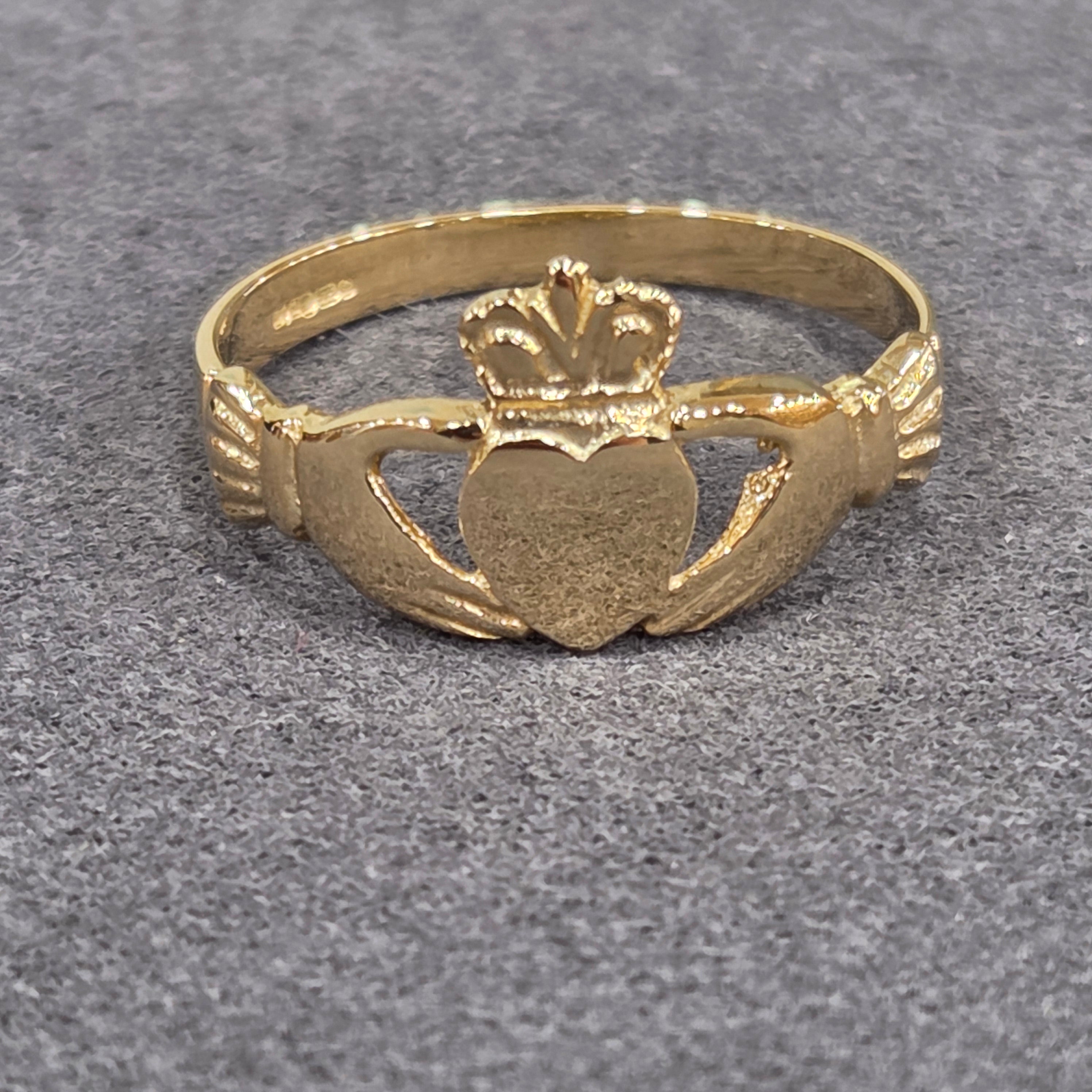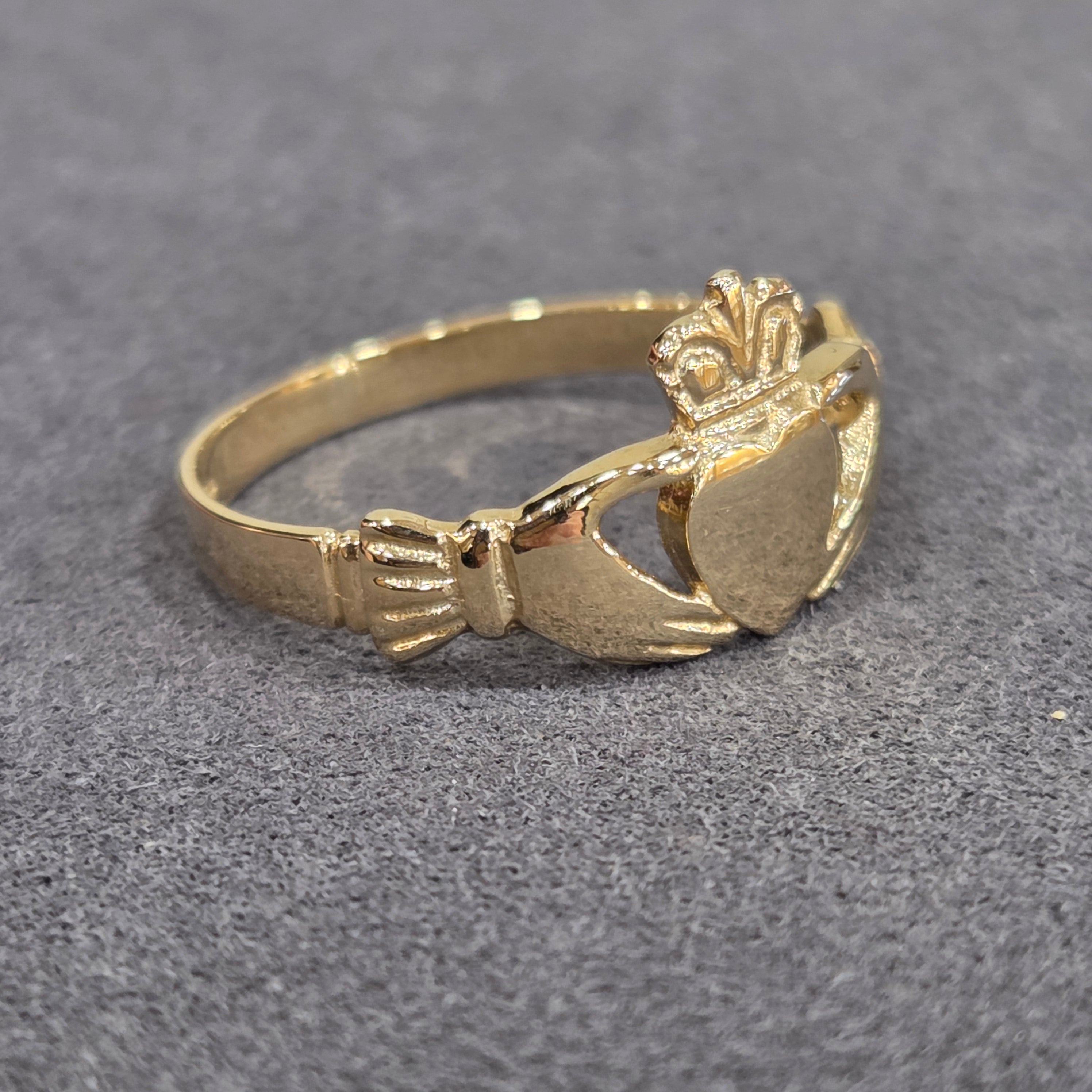 The Claddagh ring is a timeless emblem of Irish heritage, beautifully crafted in 9ct gold. This traditional design features a delicate heart cradled by two hands, crowned with a symbol of loyalty and commitment. Each element carries profound meaning—the heart represents love, the hands symbolise friendship, and the crown embodies fidelity. Whether worn as a cherished heirloom, a meaningful gift, or a personal connection to Irish culture, this elegant ring brings warmth and significance to any jewellery collection. A piece that tells a story with every wear.