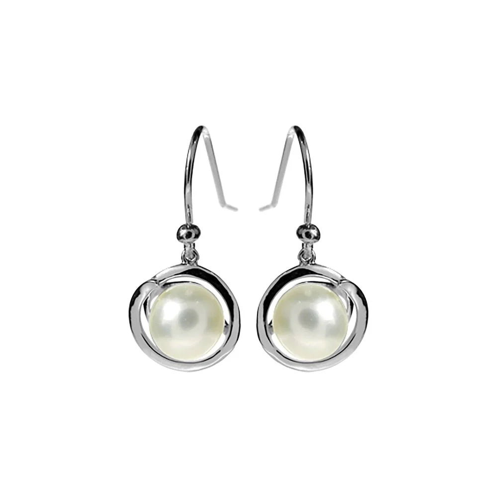 Delicate round pearl earrings featuring abstract silver detailing, perfect for everyday elegance. These petite drops showcase lustrous pearls set within contemporary metalwork, offering a versatile addition to any jewellery collection. Pair them with the matching pendant for a coordinated look that transitions effortlessly from day to evening wear.