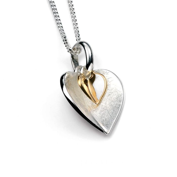 This pendant showcases a silver heart with a subtle scratch finish, topped by a smaller, gold-plated heart for an elegant layered effect.  Pair with then matching drop earrings for a finished look.