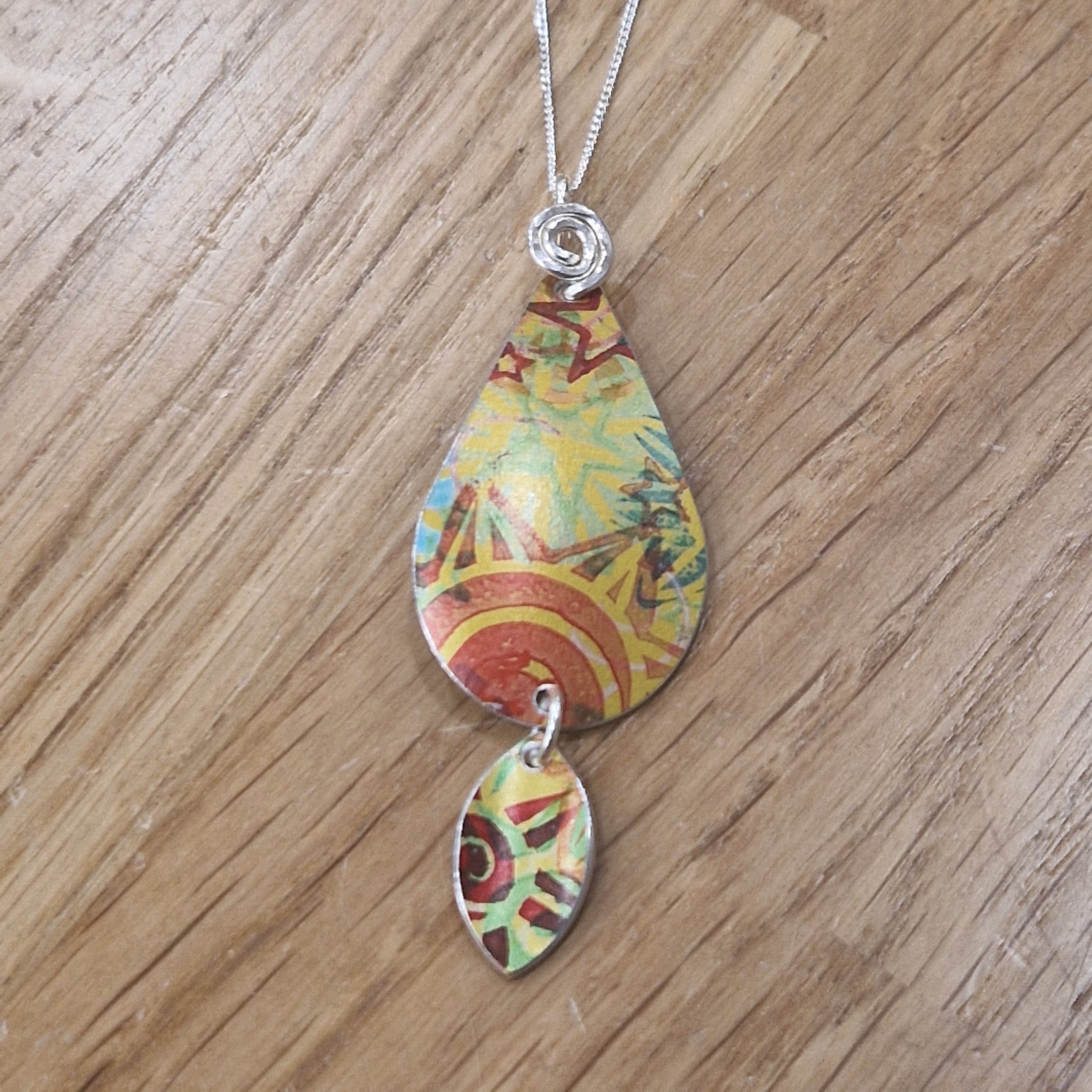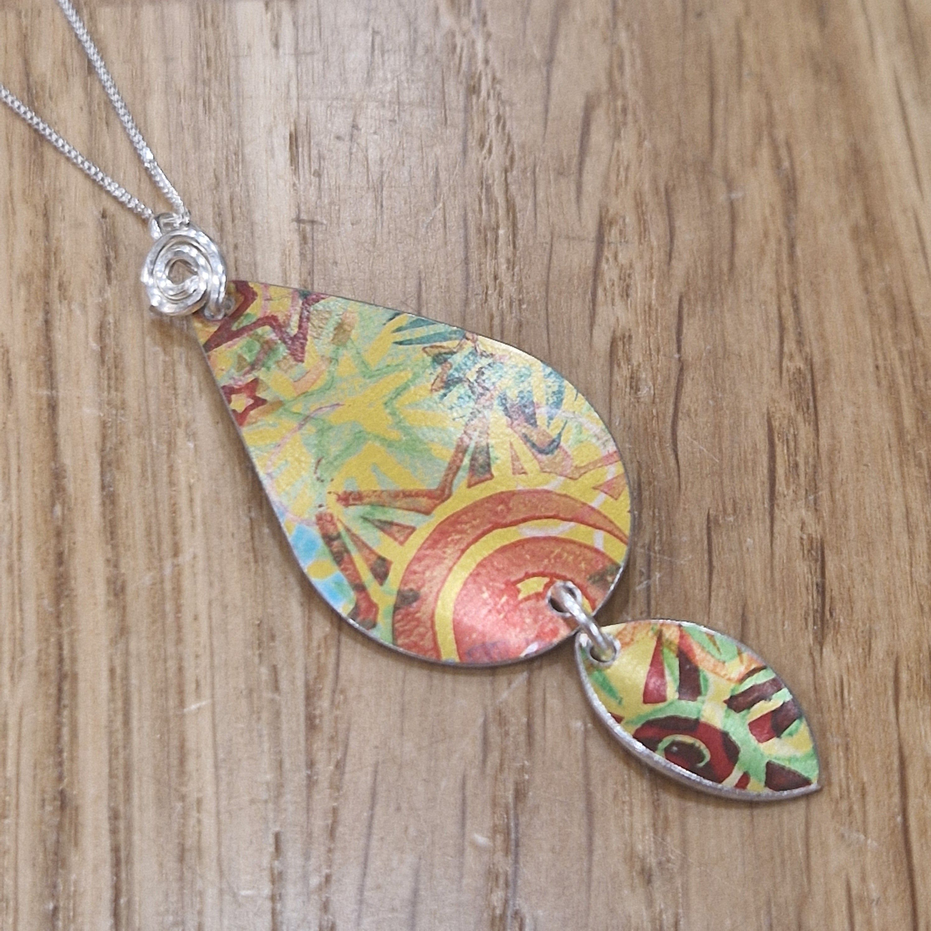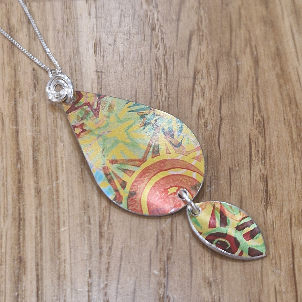 Handmade anodised aluminium teardrop pendant in the pattern Squib, a bright yellow background with an explosion of colours in reds, greens, pink and purple, with spirals and stars, just like and firework in action.
