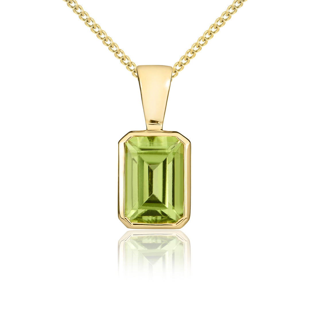 A fancy 7mm x 5mm octagonal cut peridot pendant set in 9ct yellow gold, comes complete on an 18" gold chain. Why not pair it with the matching stud earrings for a co-ordinated look.