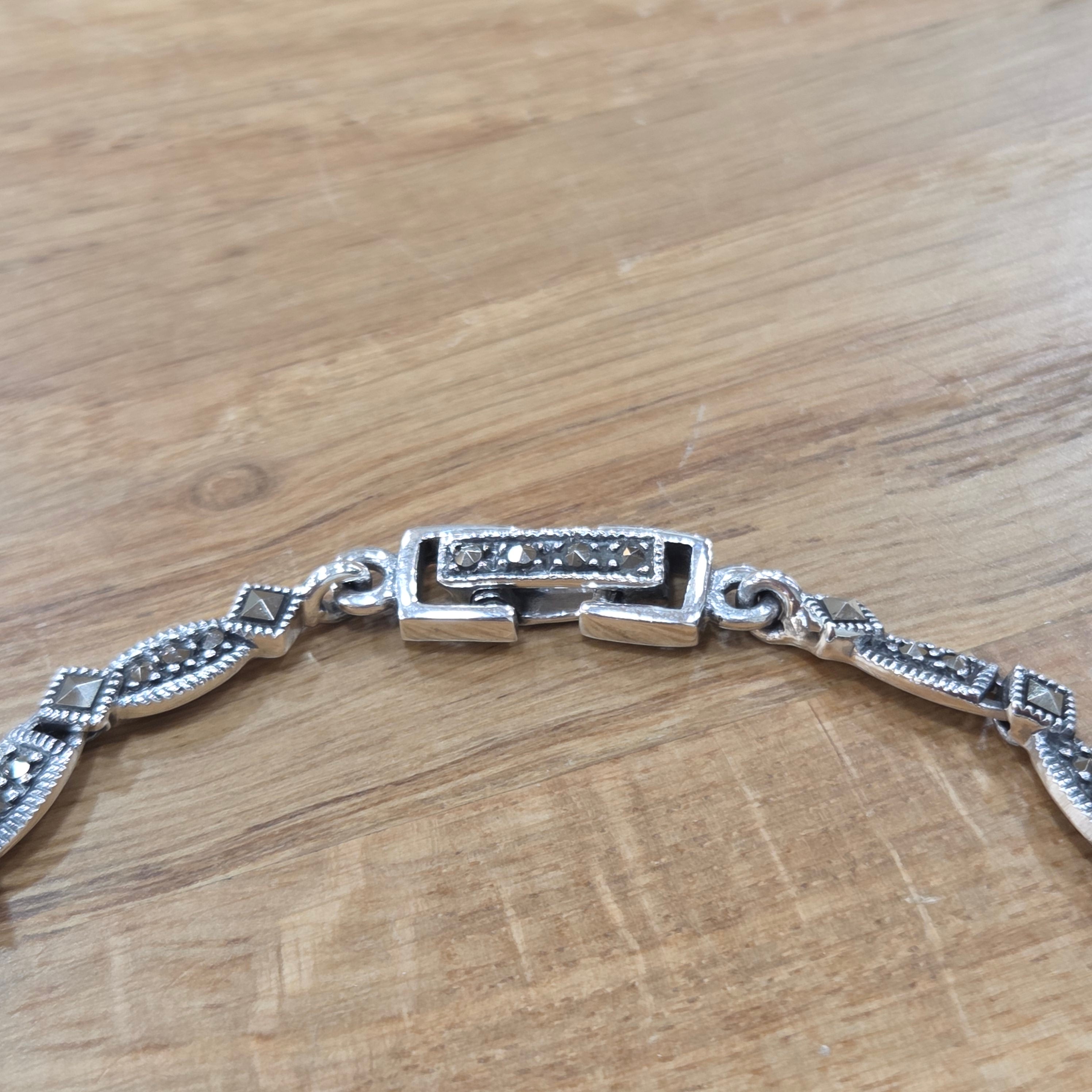 This striking silver bracelet features shimmering marcasite stones that catch the light beautifully, creating an elegant accessory perfect for any occasion. The sparkling gemstones add a touch of sophistication and timeless charm to your jewellery collection.