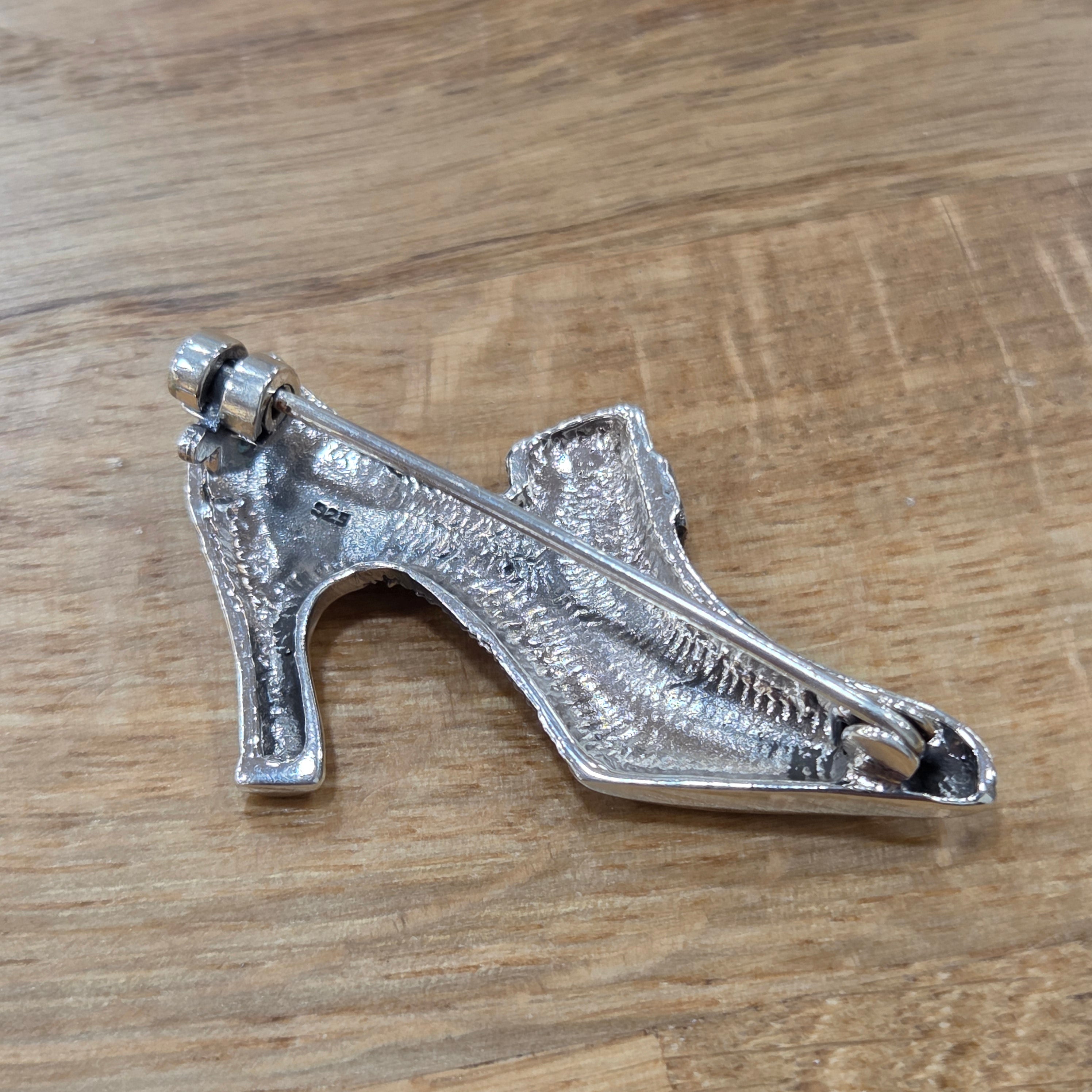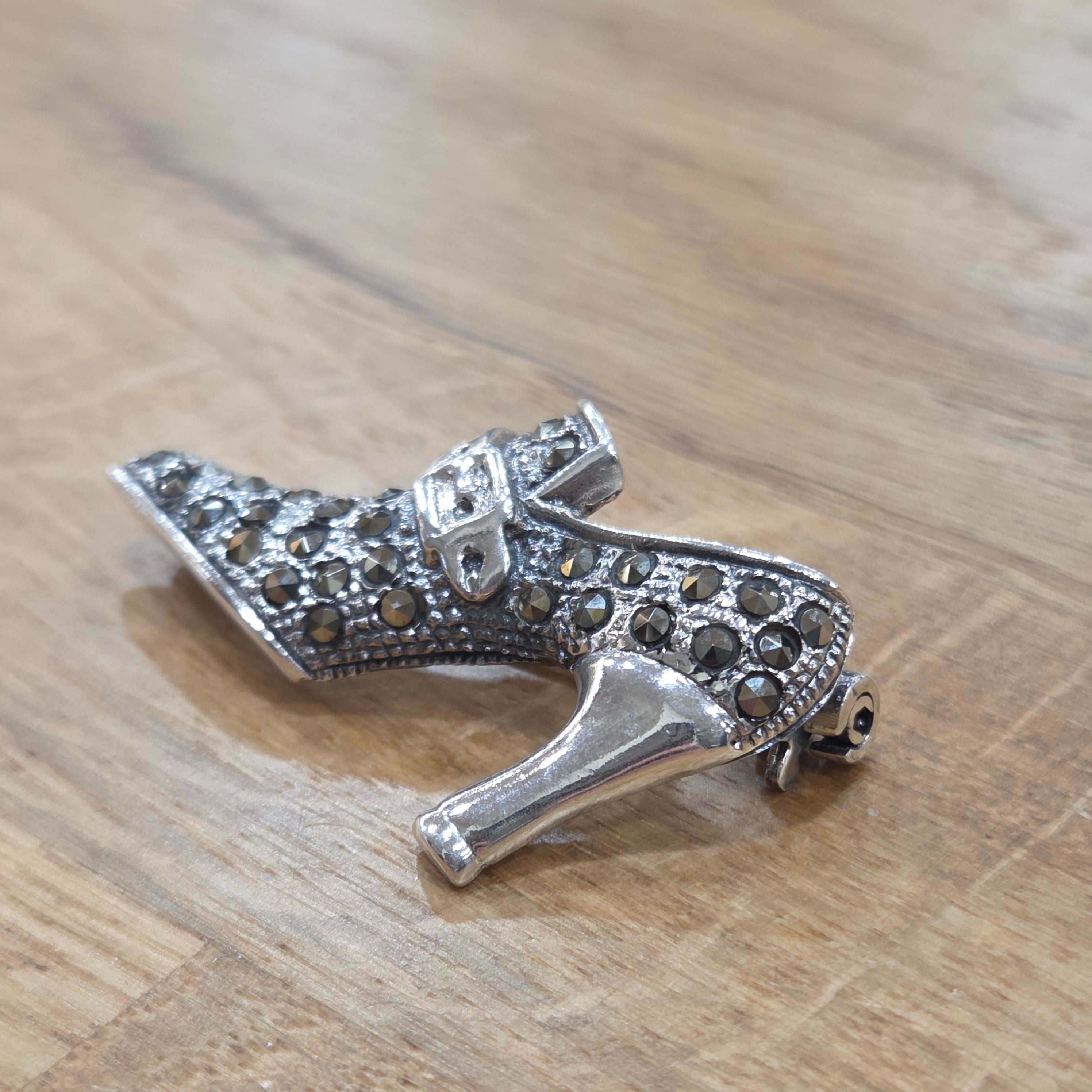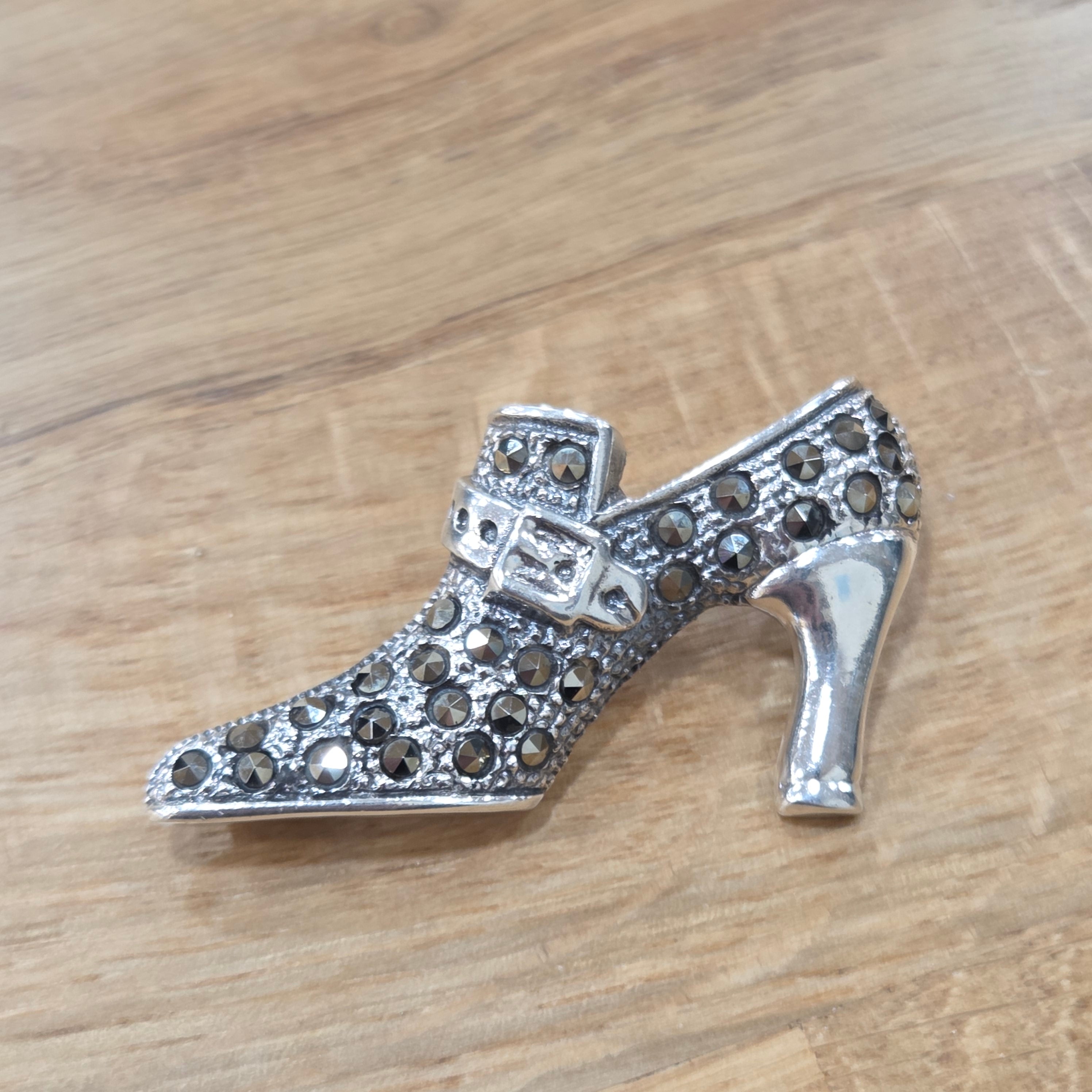 This striking shoe brooch combines gleaming silver with shimmering marcasite for a truly eye-catching accessory. The intricate detailing extends to every element, including an elegant silver buckle design that adds authentic charm. A wonderfully distinctive piece that brings personality and sparkle to any outfit.
