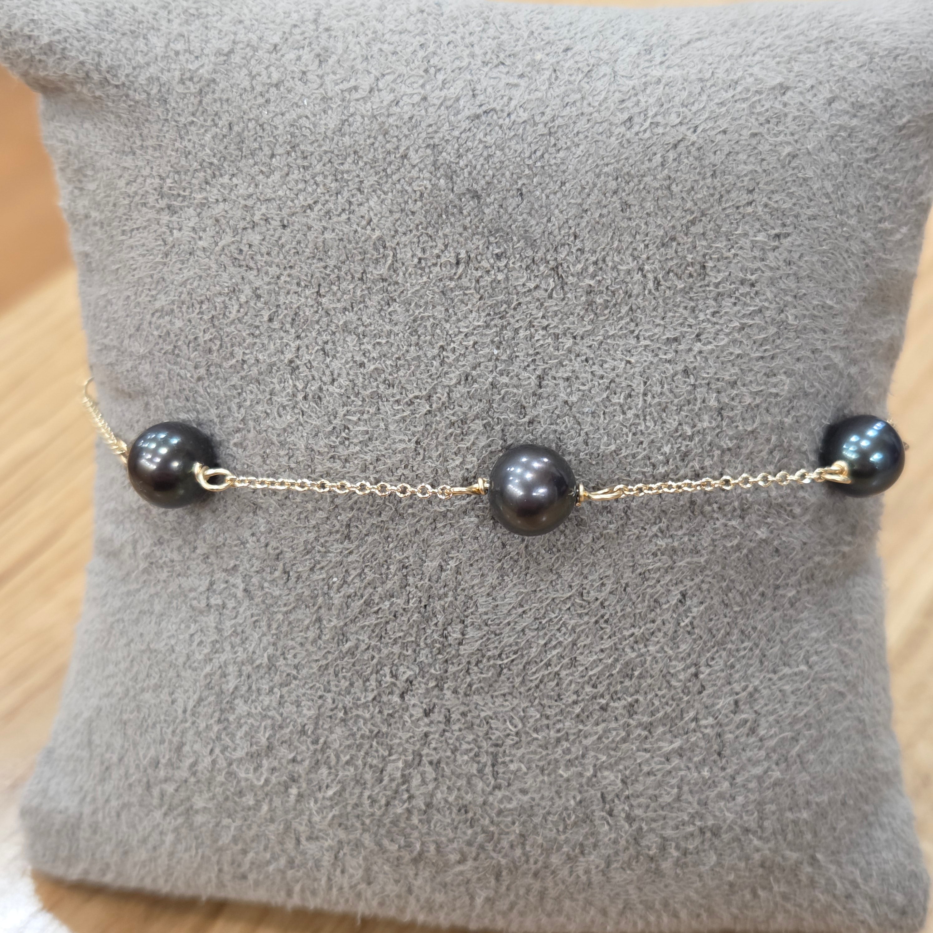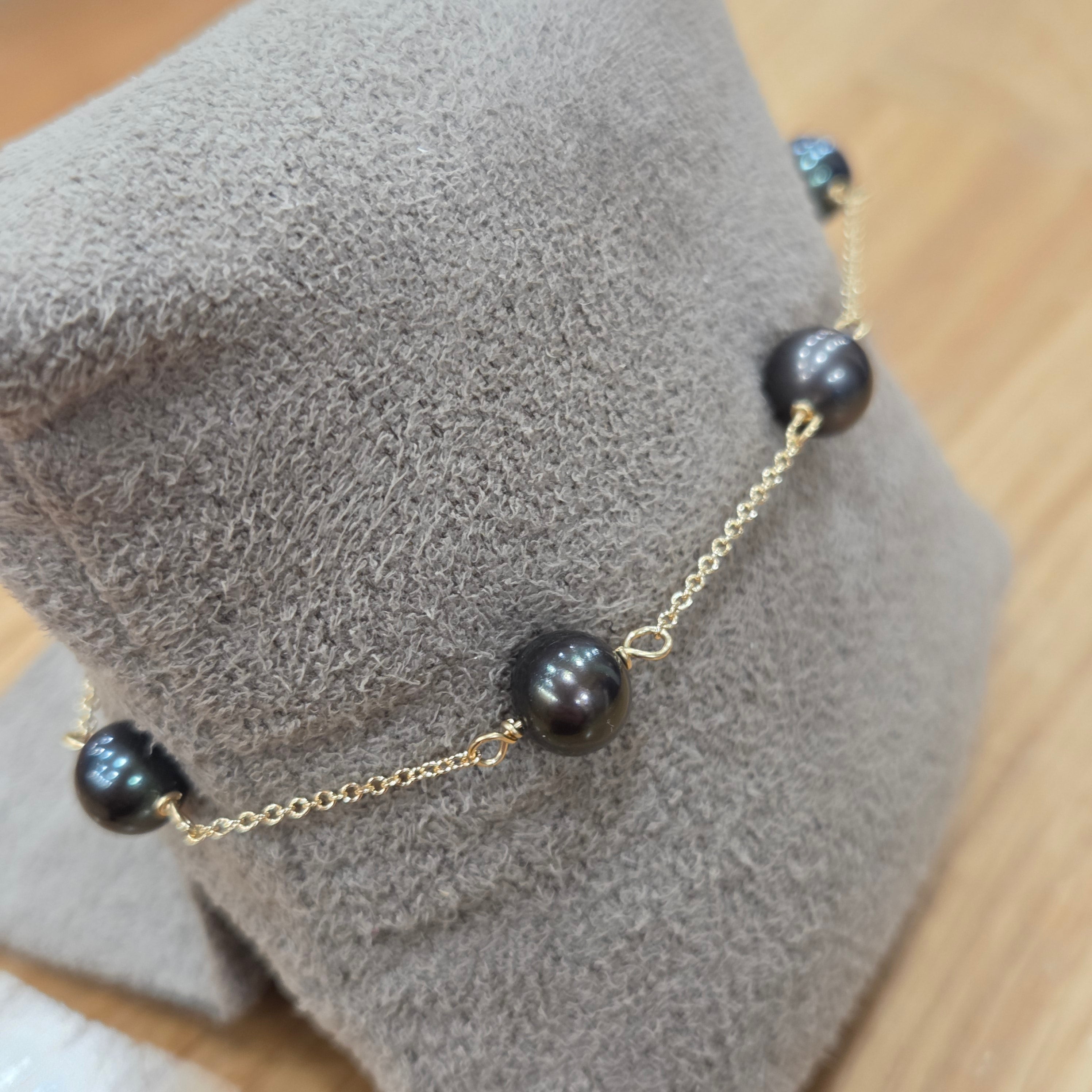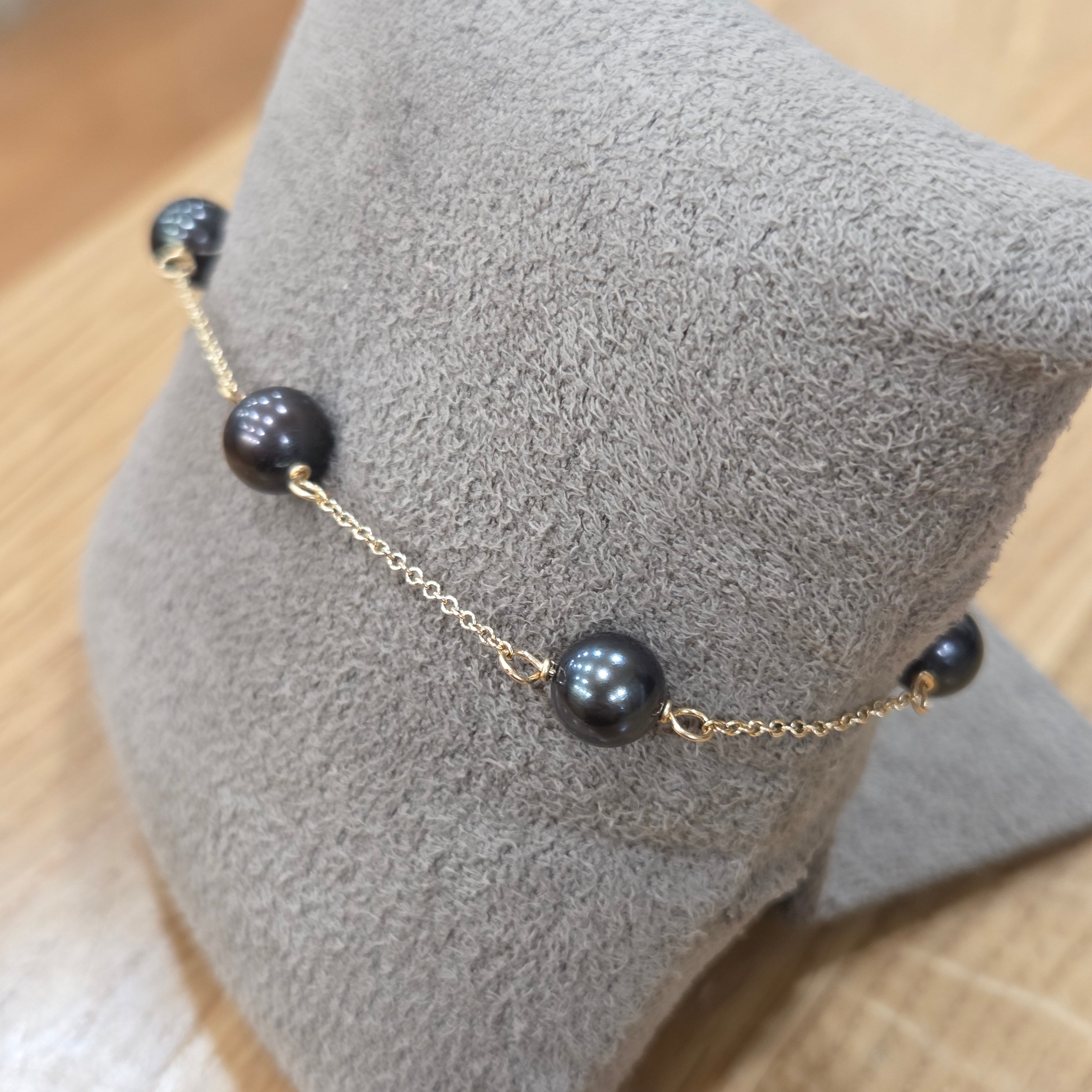 Elegant gold plated chain bracelet featuring lustrous black pearls spaced evenly along the length. Each pearl measures approximately 6-7mm and sits almost perfectly round, creating a sophisticated rhythm of colour and shine. Secured with a reliable gold plated lobster clasp for easy fastening. Approximately 7.5 inches in length, ideal for most wrist sizes. A timeless piece that transitions effortlessly from day to evening wear. Pair with the co-ordinating necklace to complete the look.