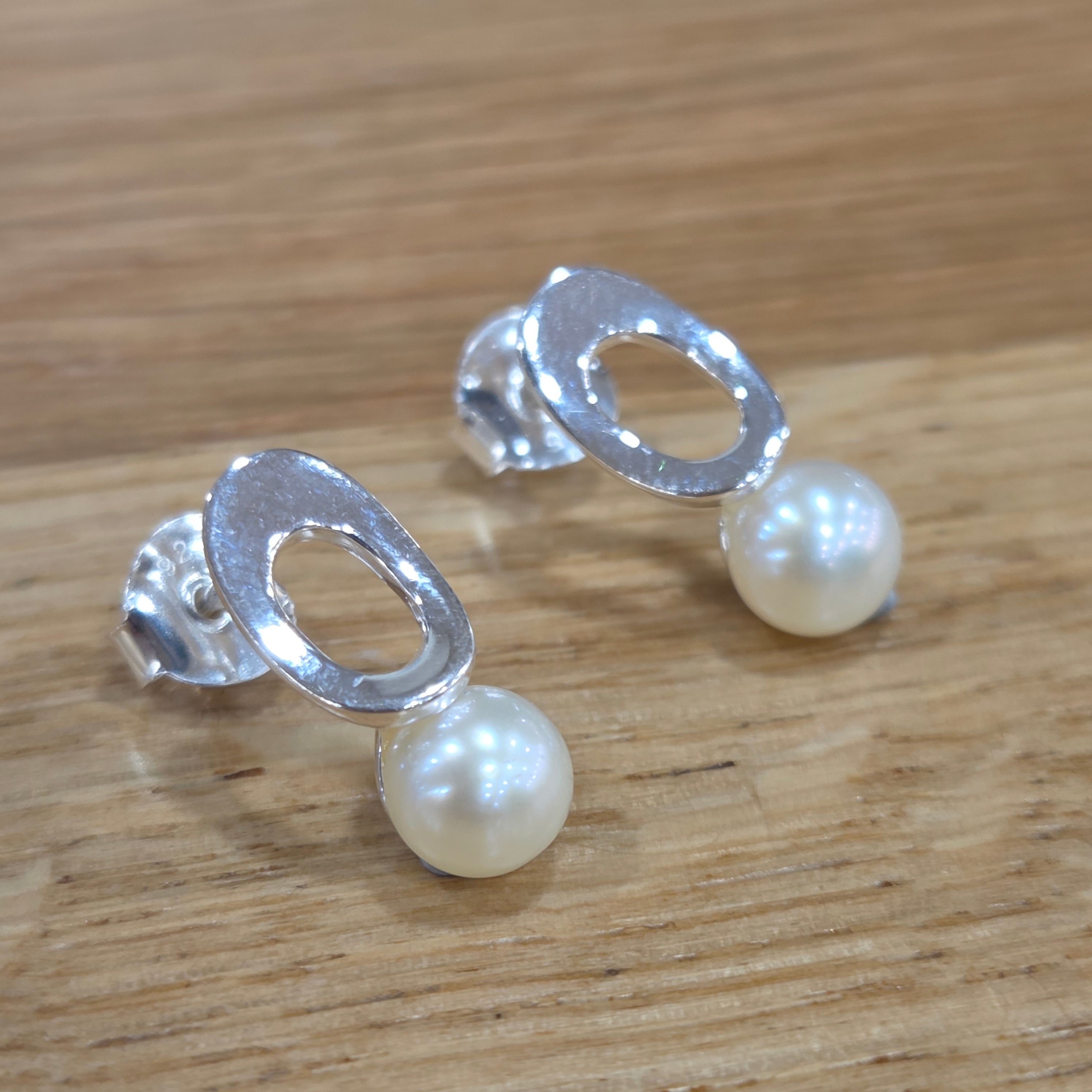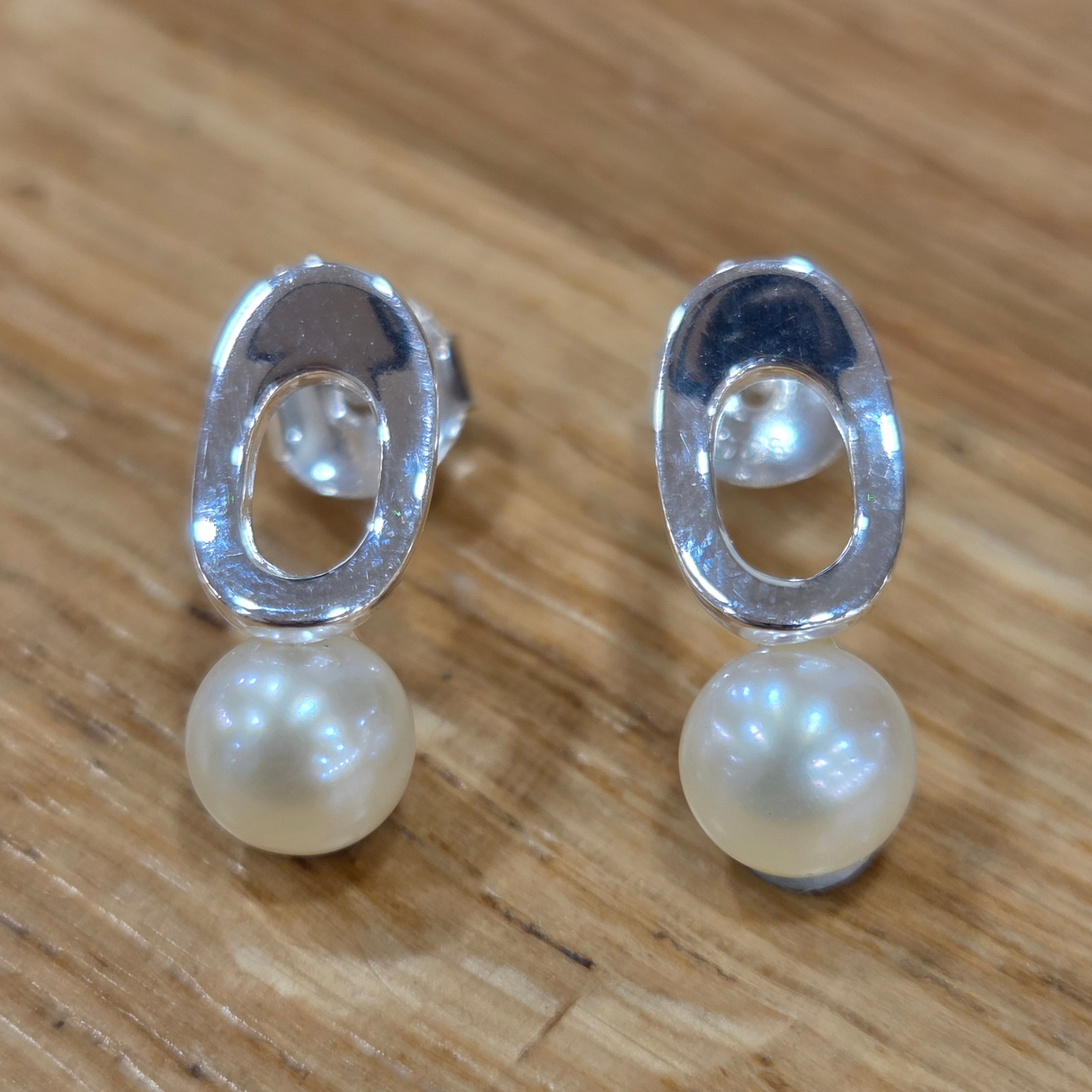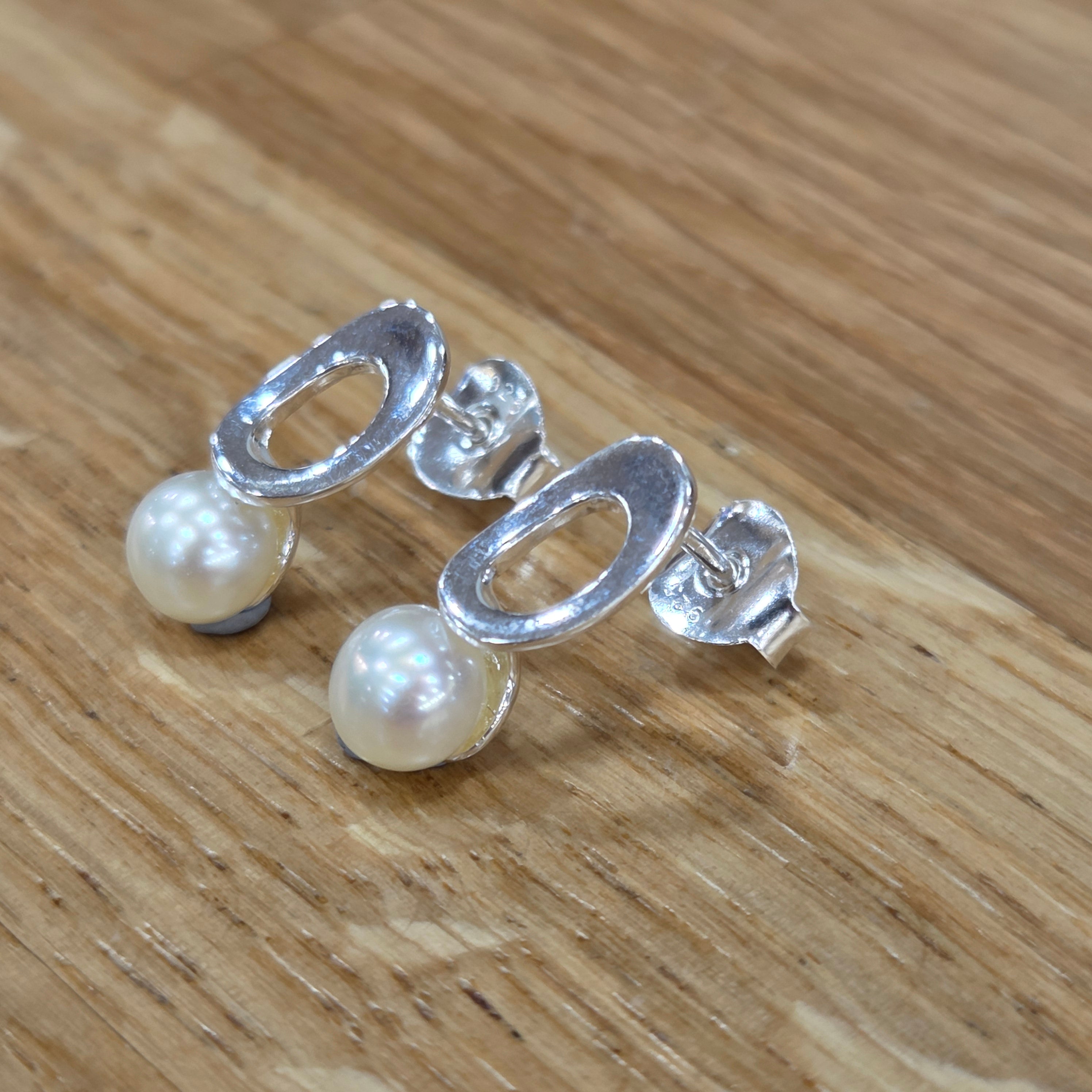 Discover understated luxury with these striking silver studs, showcasing delicate white freshwater pearls set in an open framework design.