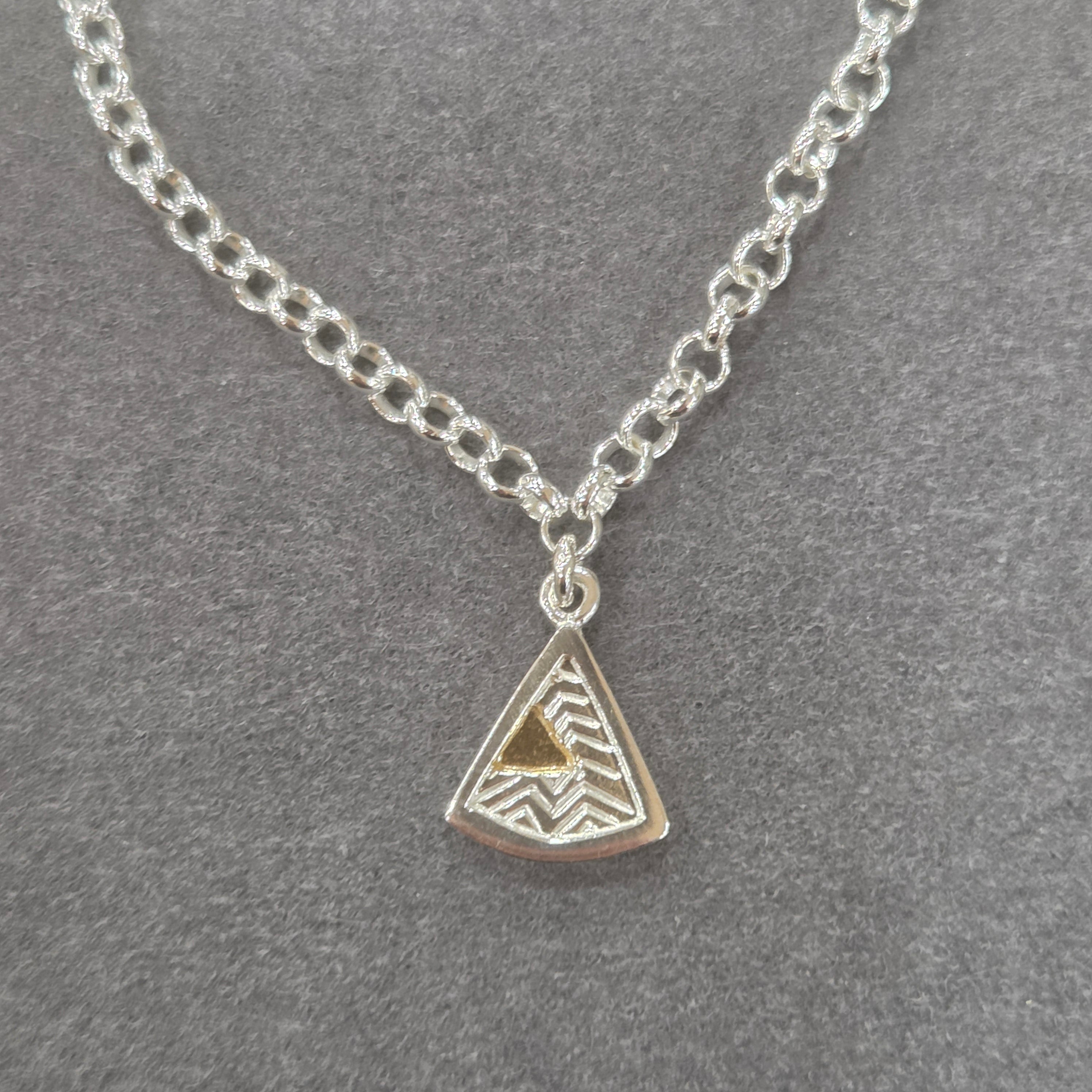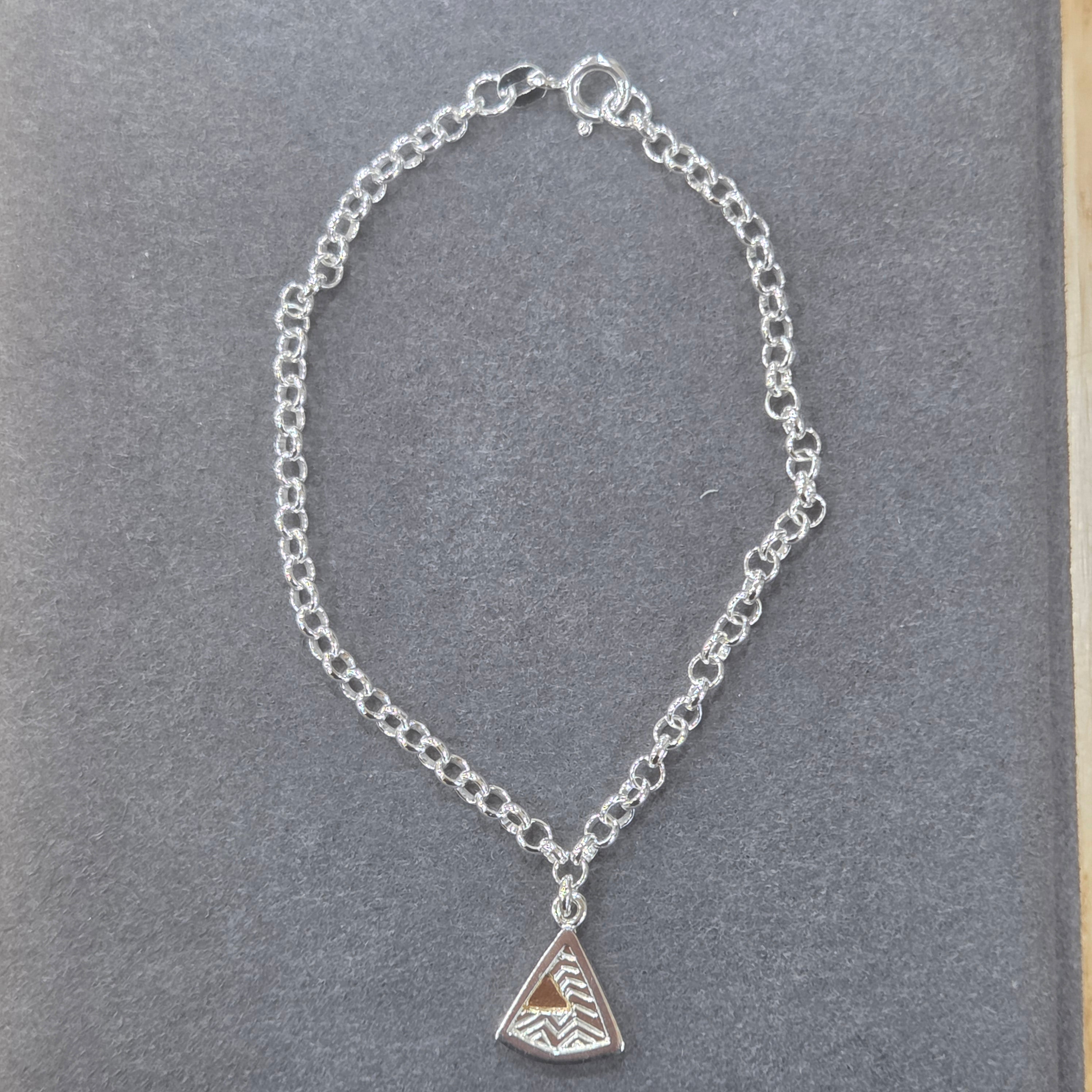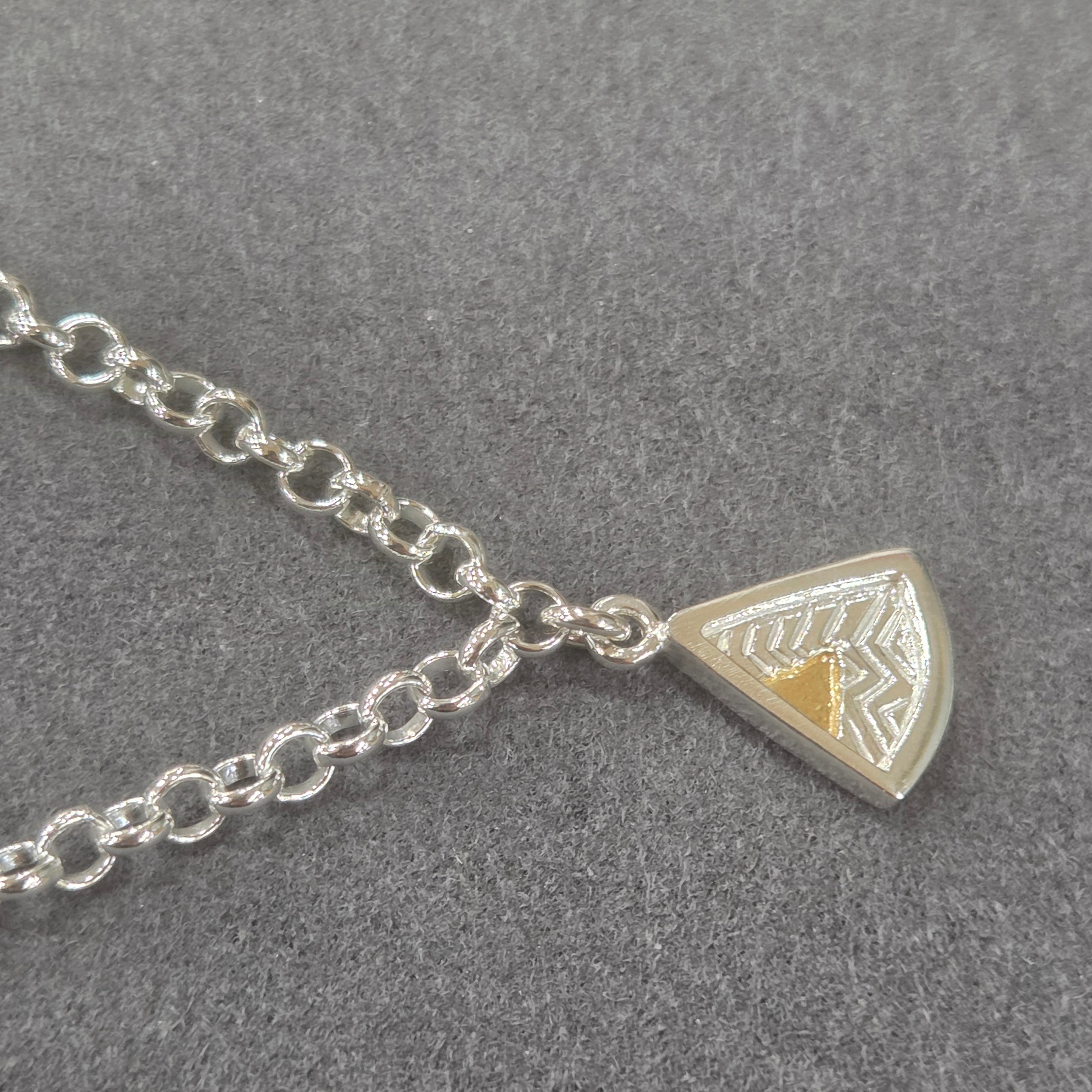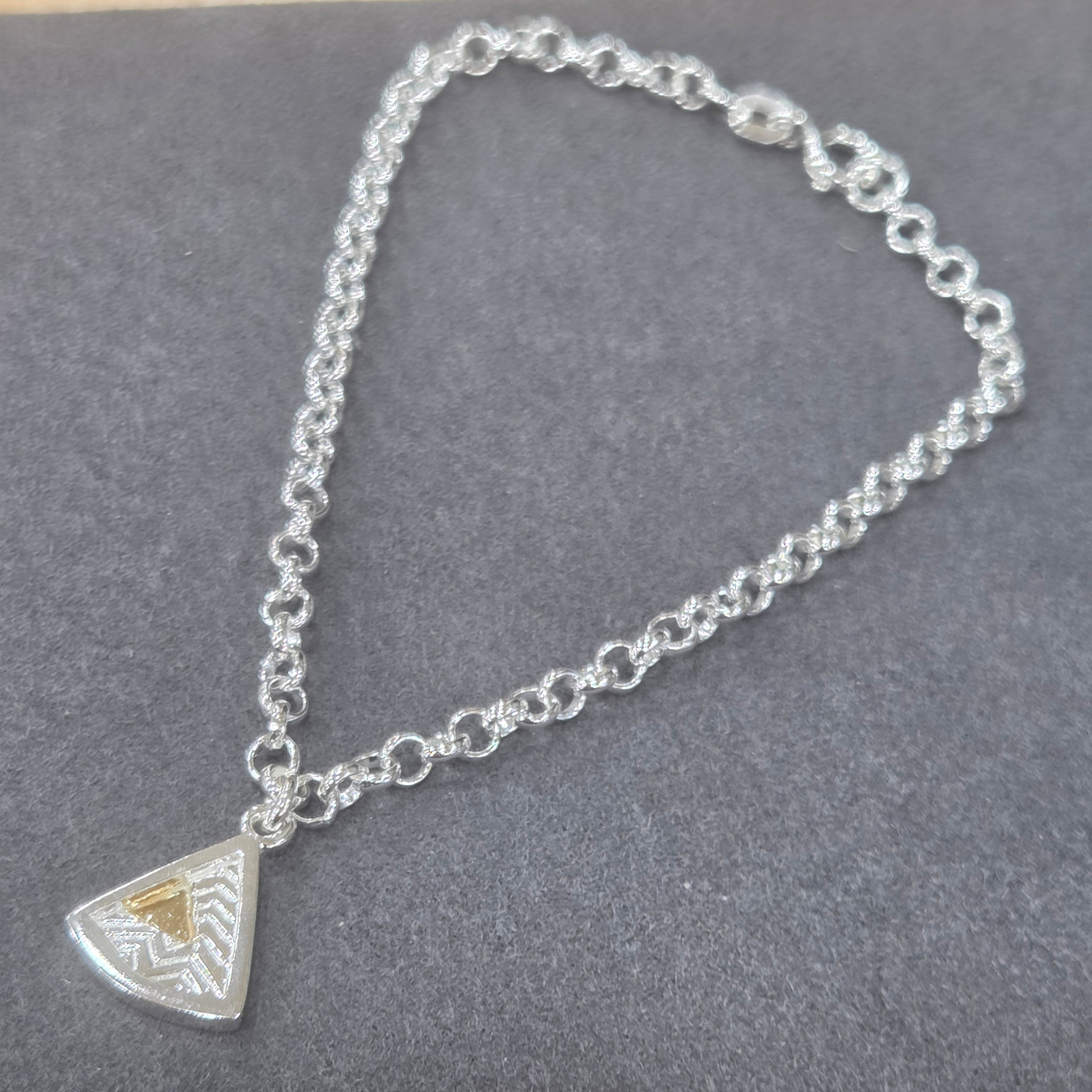 Elevate your everyday style with this handcrafted Tri Chosan bracelet, featuring a sterling silver belcher chain paired with a striking triangular charm. The charm showcases a subtle textured finish complemented by luxurious 18ct gold vermeil accents, creating a sophisticated blend of precious metals. Perfect for layering or wearing solo, this versatile piece combines contemporary design with timeless craftsmanship, making it an essential addition to any jewellery collection.