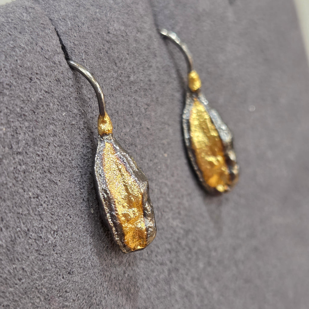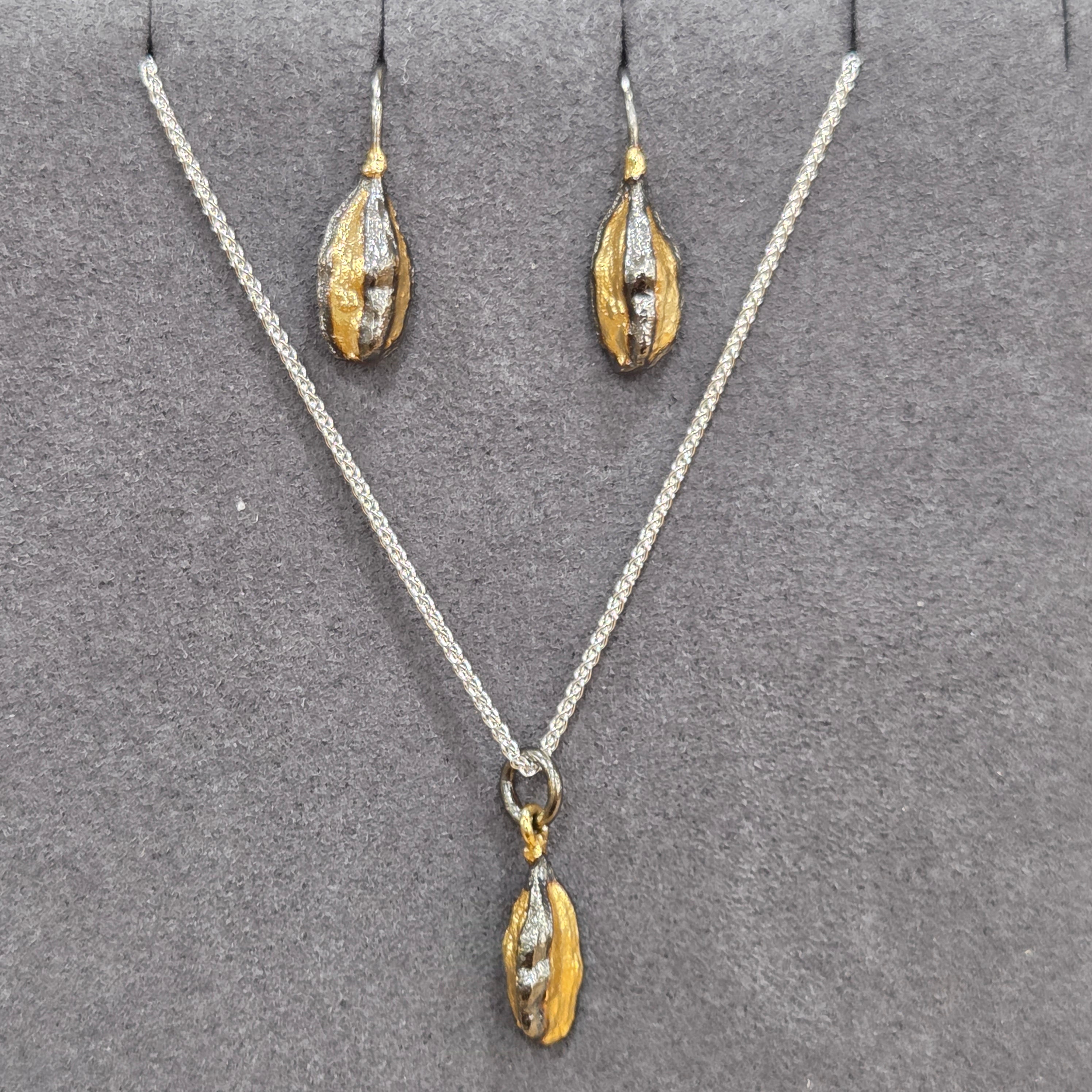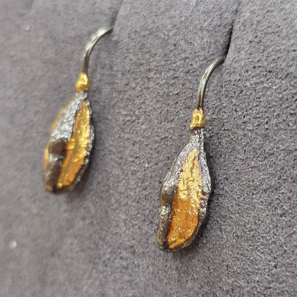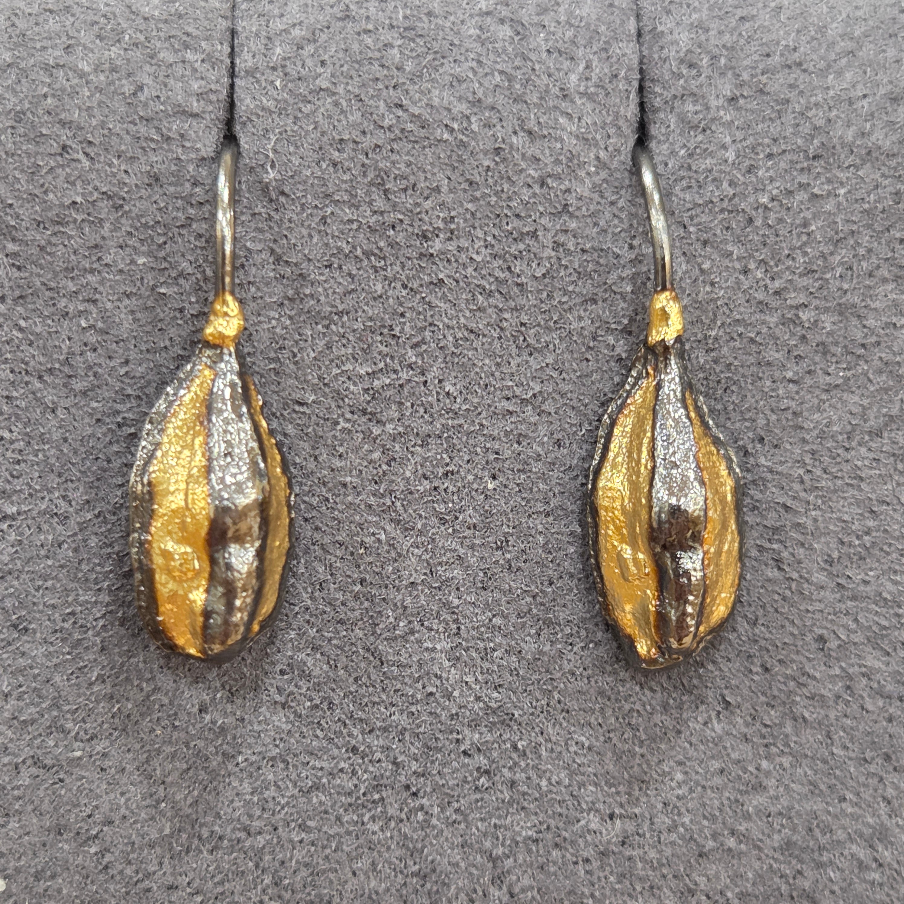 Crafted from sterling silver, these striking drop earrings showcase a two-tone cardamom pod design with a gold-plated and oxidised textured finish. Wear them alongside the matching pendant to create a playful and distinctive style.