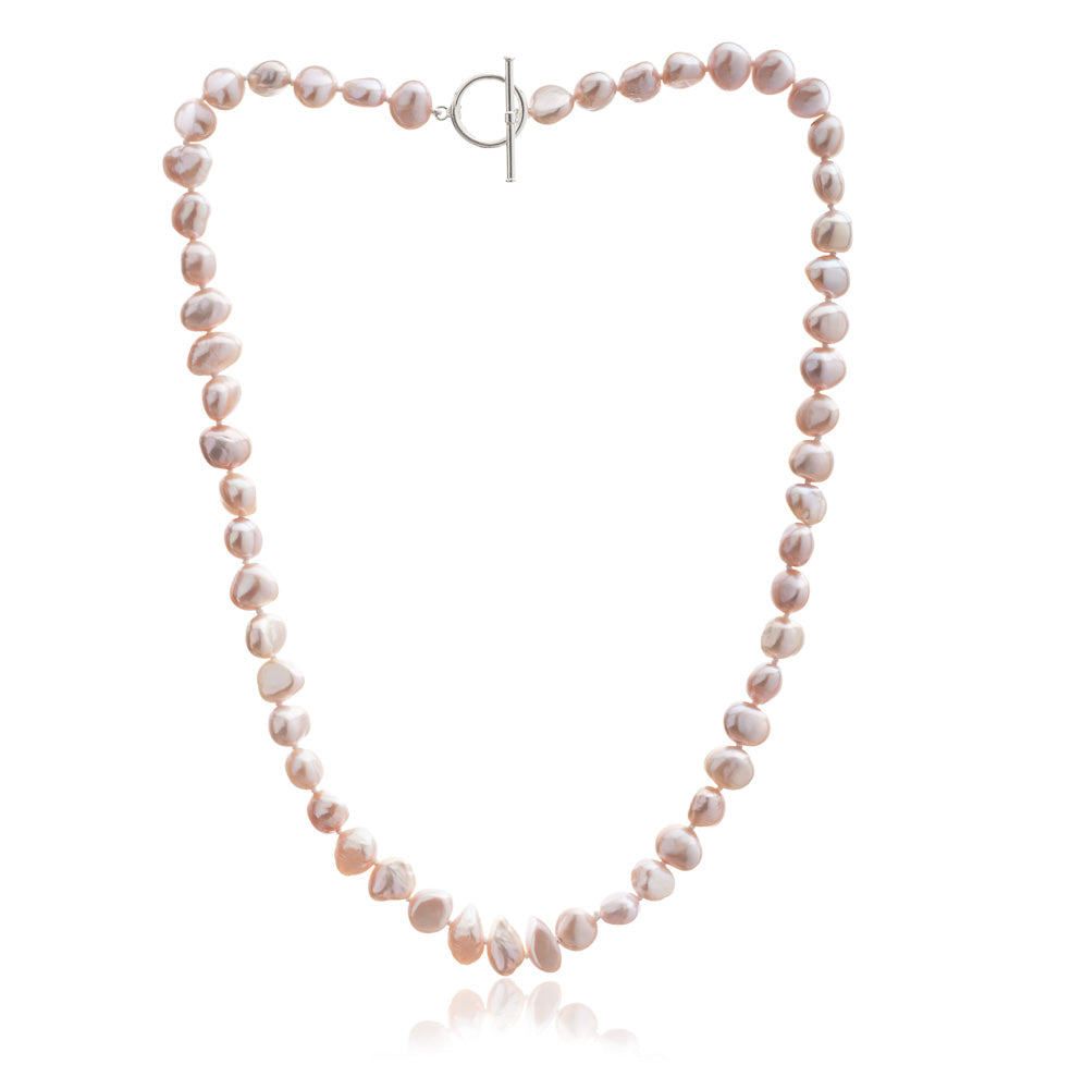 18" Single strand pink potato pearl necklace with sterling silver toggle clasp.