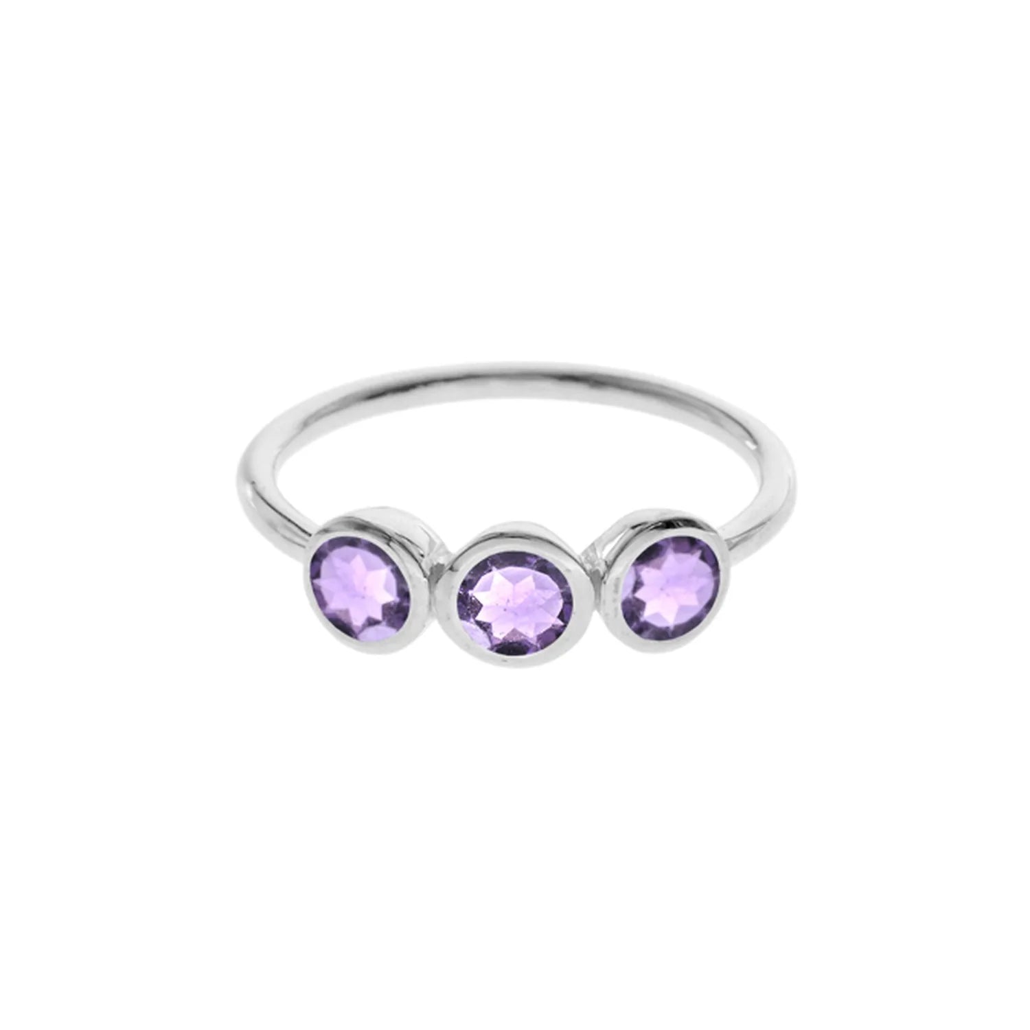 Sterling silver ring set with 3 brilliant cut amethyst stones.