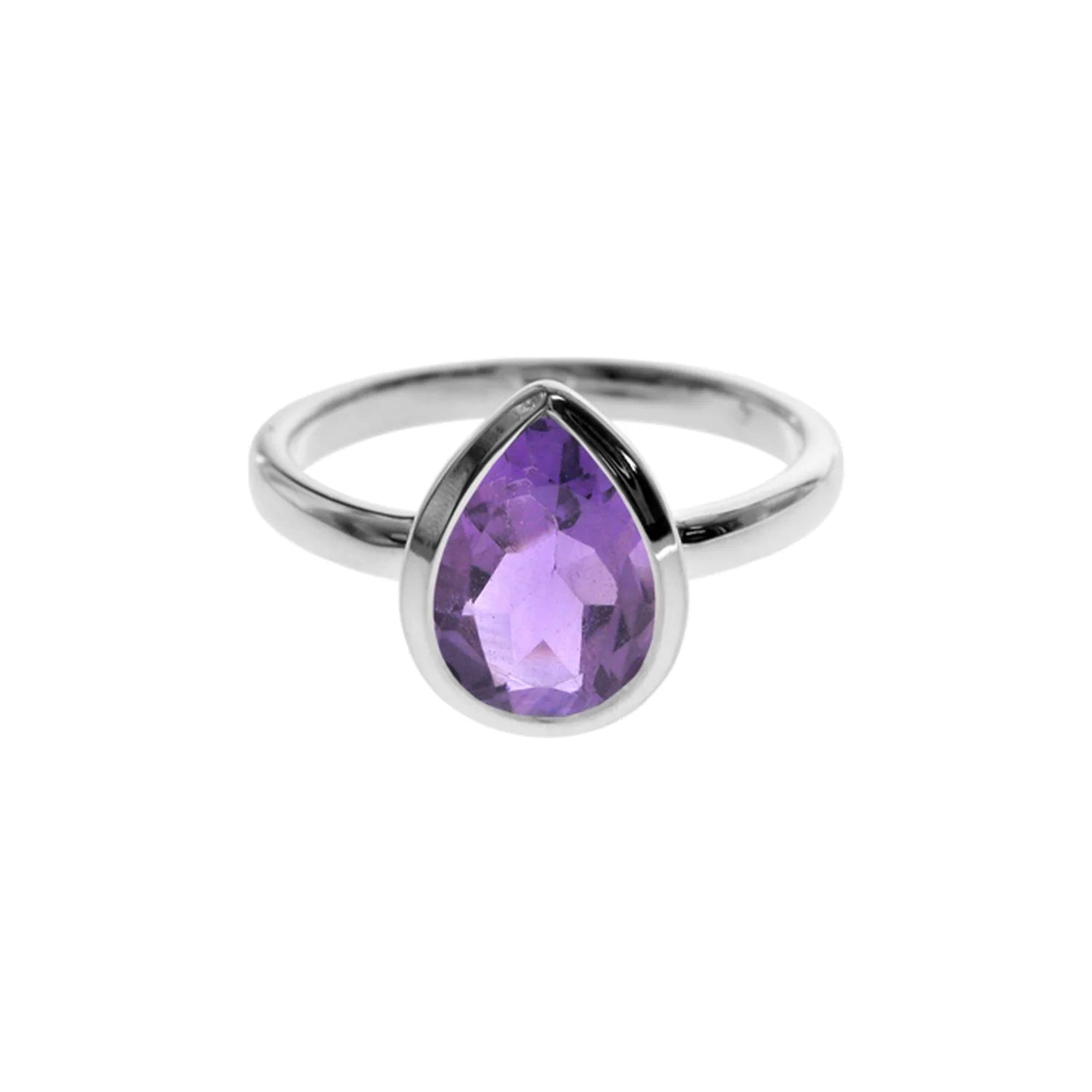 Sterling silver ring with a bezel set large faceted teardrop amethyst stone sitting proud, a statement ring that lets the stone speak for itself.