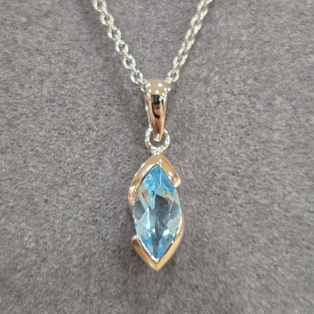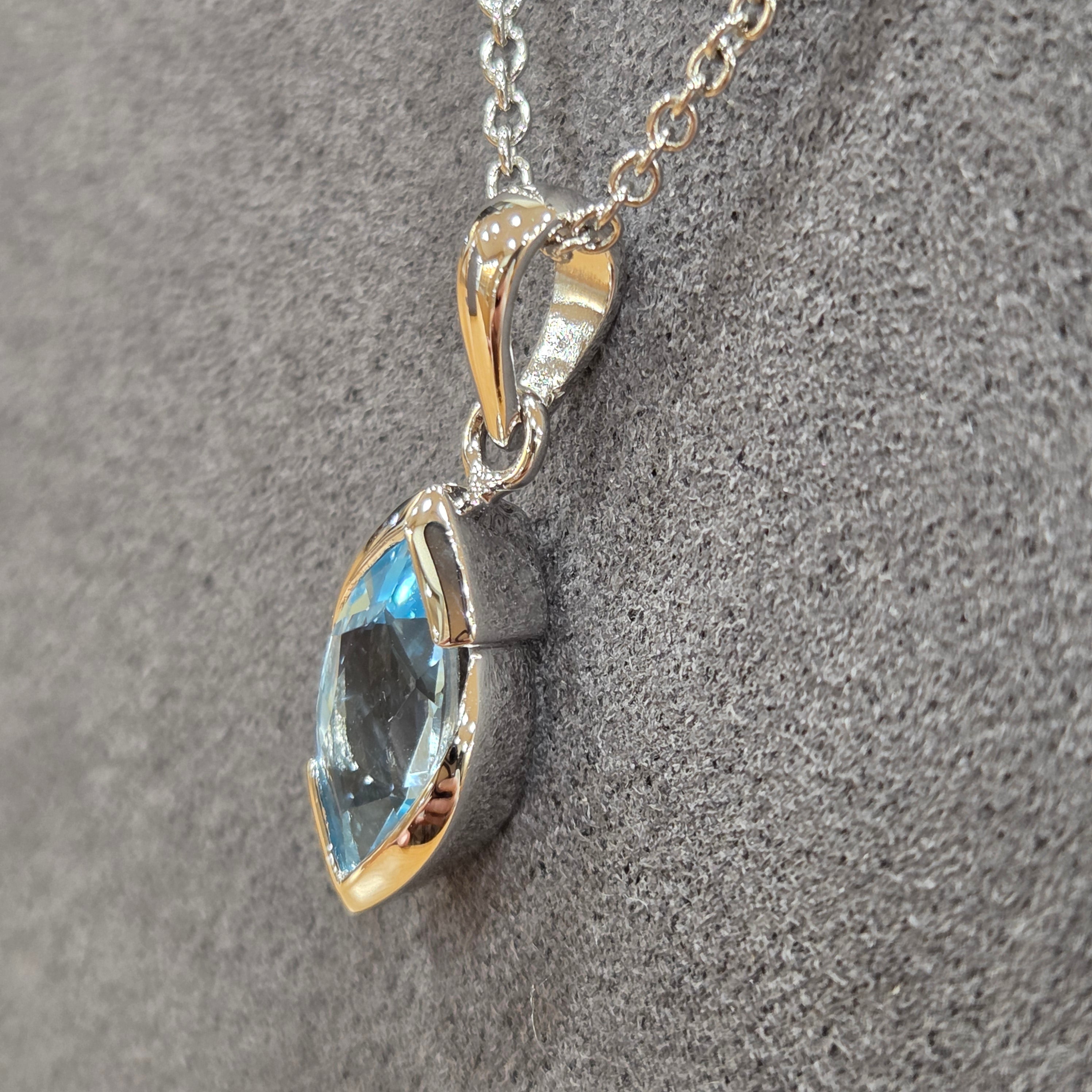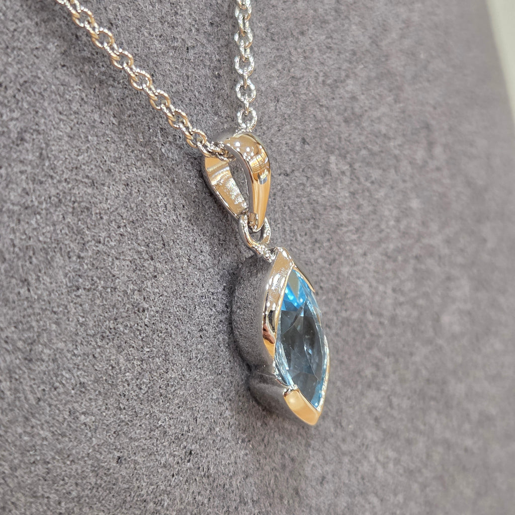 Elevate your style with this sleek sterling silver pendant featuring a marquise-cut blue topaz and a polished rhodium finish. It arrives on a 16" silver chain with a 1" extender for the perfect fit. Complete your ensemble by pairing it with the matching drop earrings for a sophisticated, coordinated look.