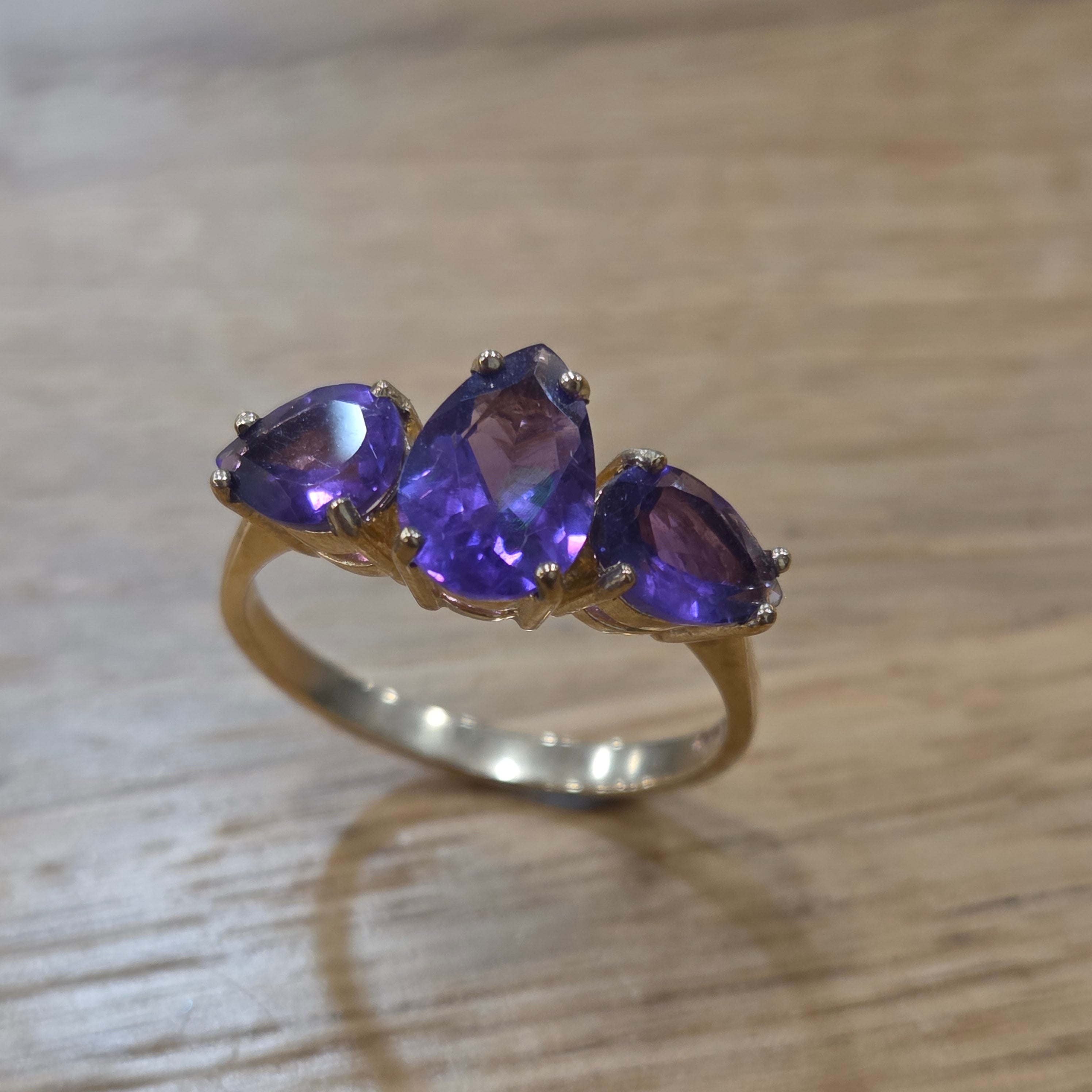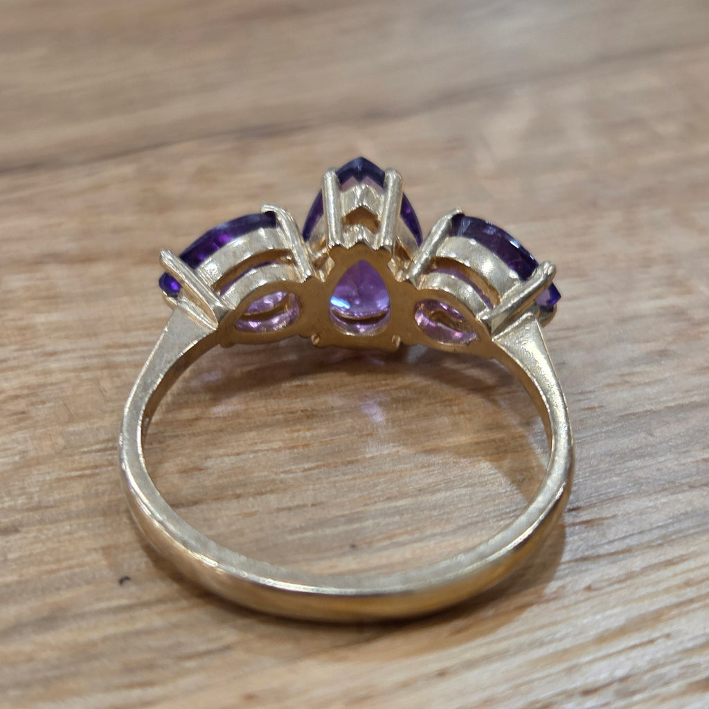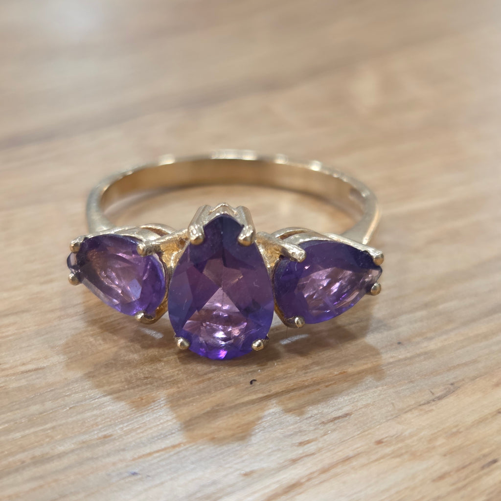 9ct Gold and rich amethyst teardrop shape 3 stone ring