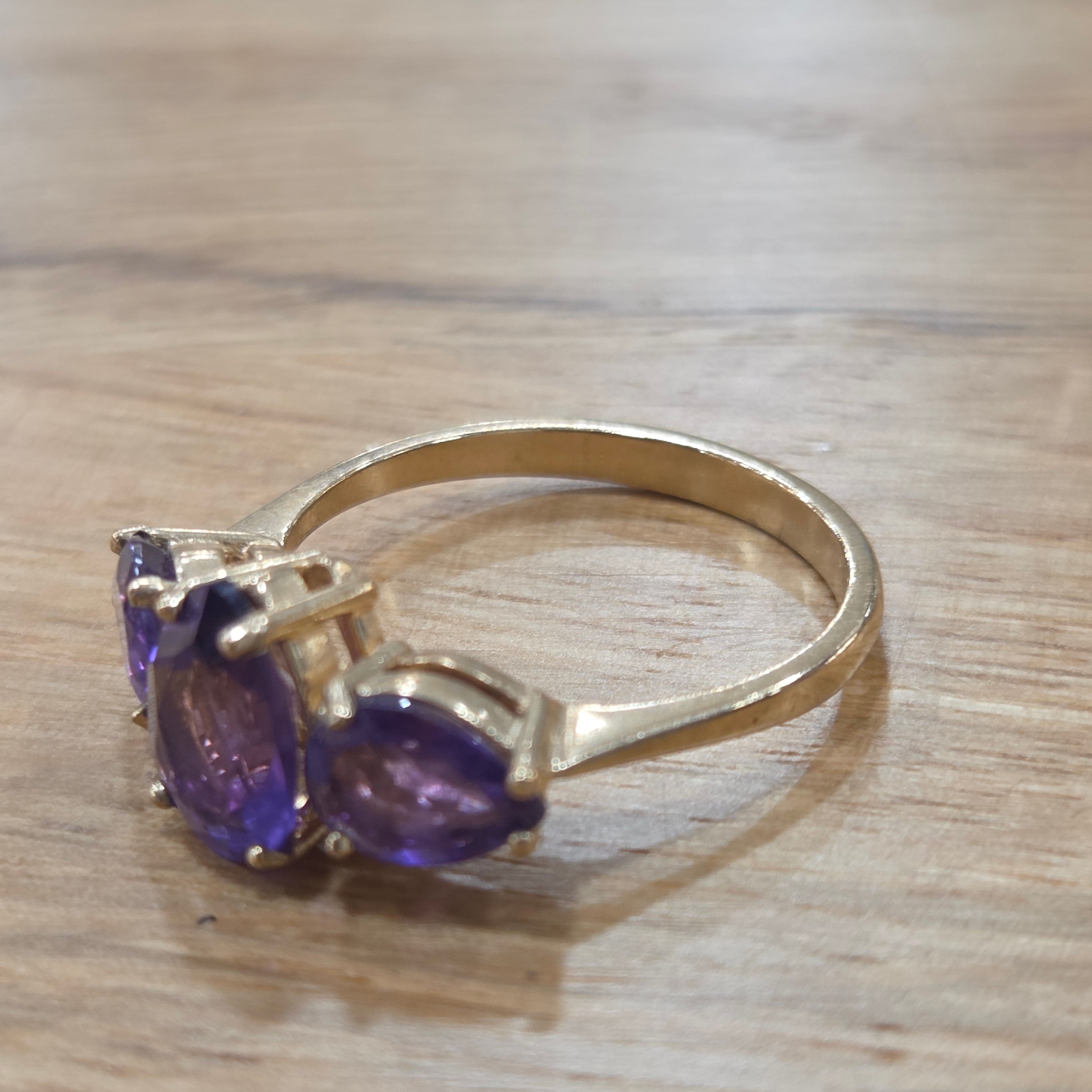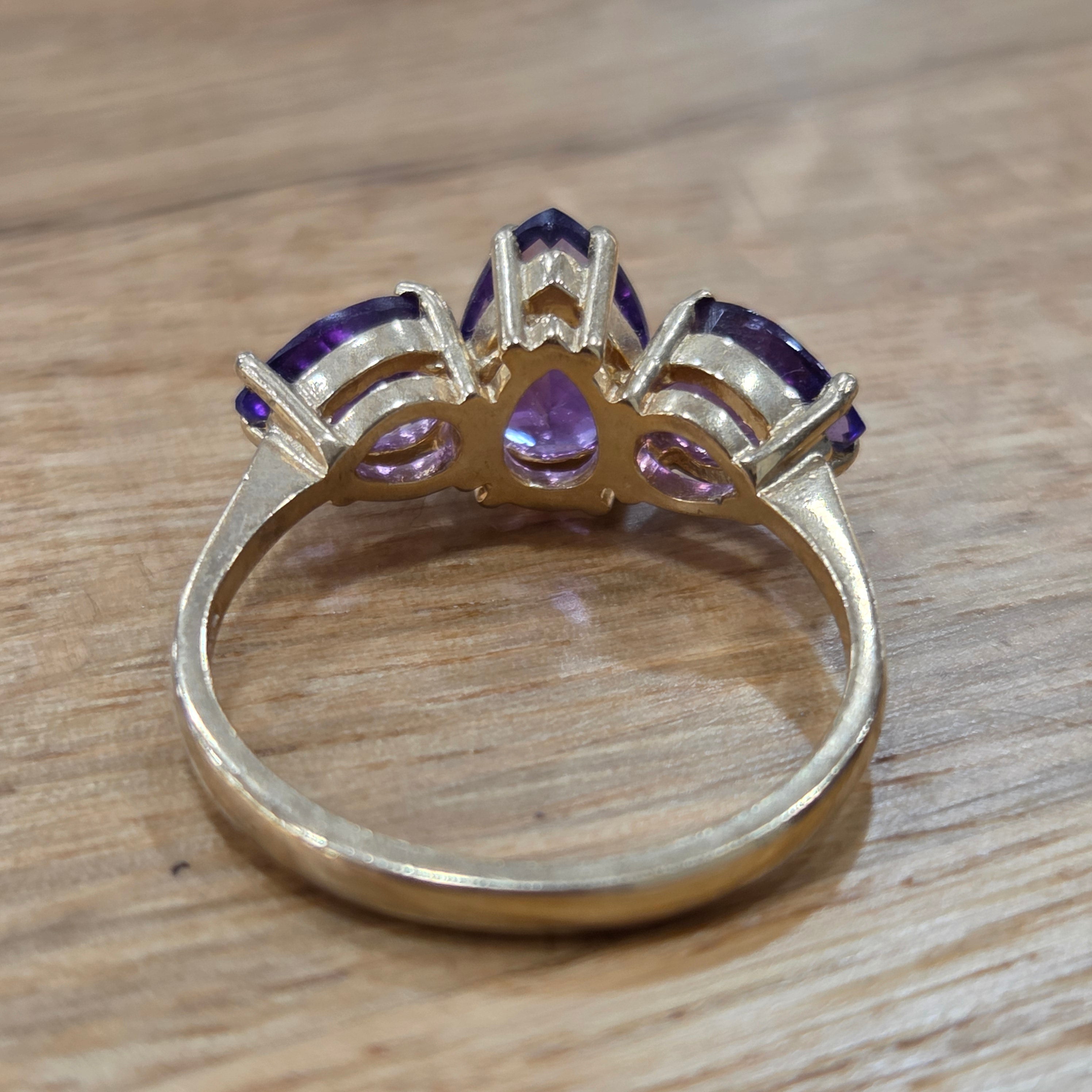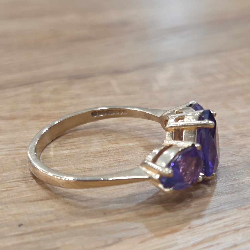 9ct Gold and rich amethyst teardrop shape 3 stone ring