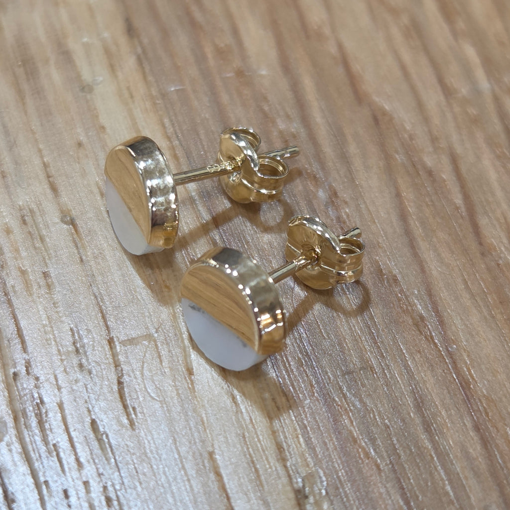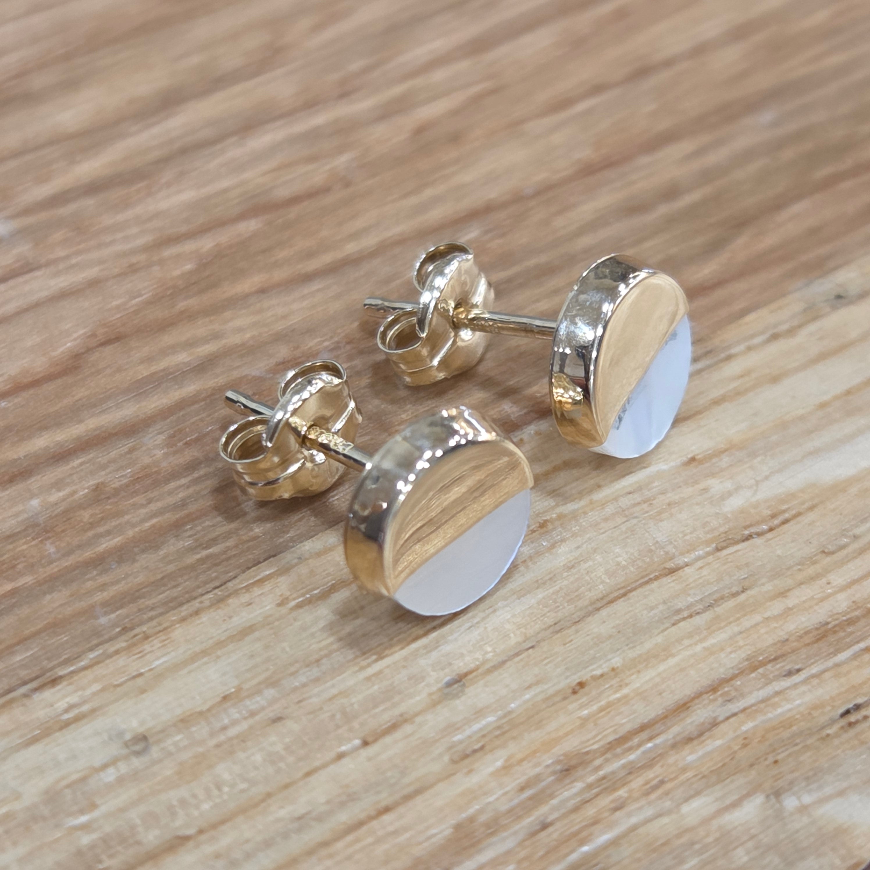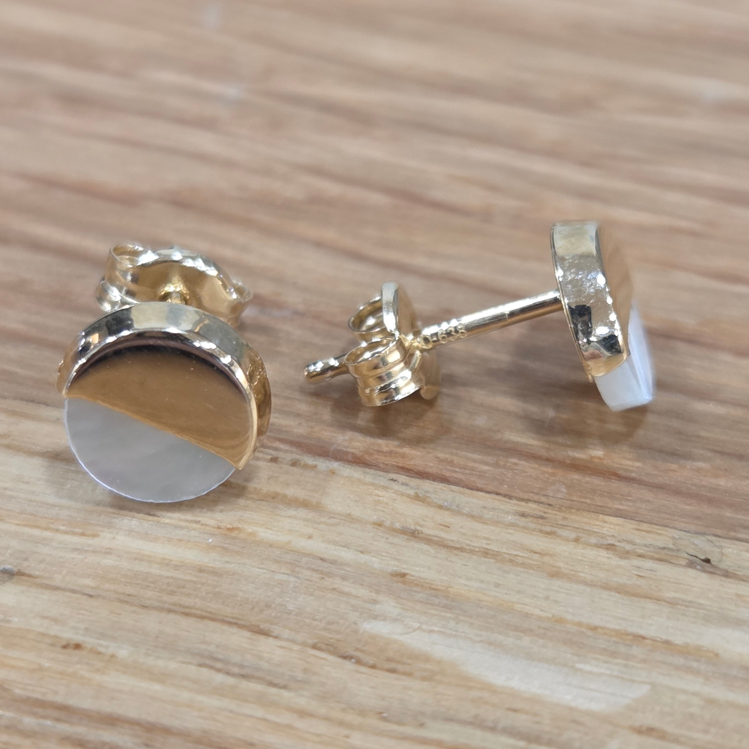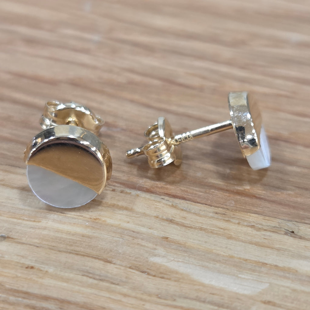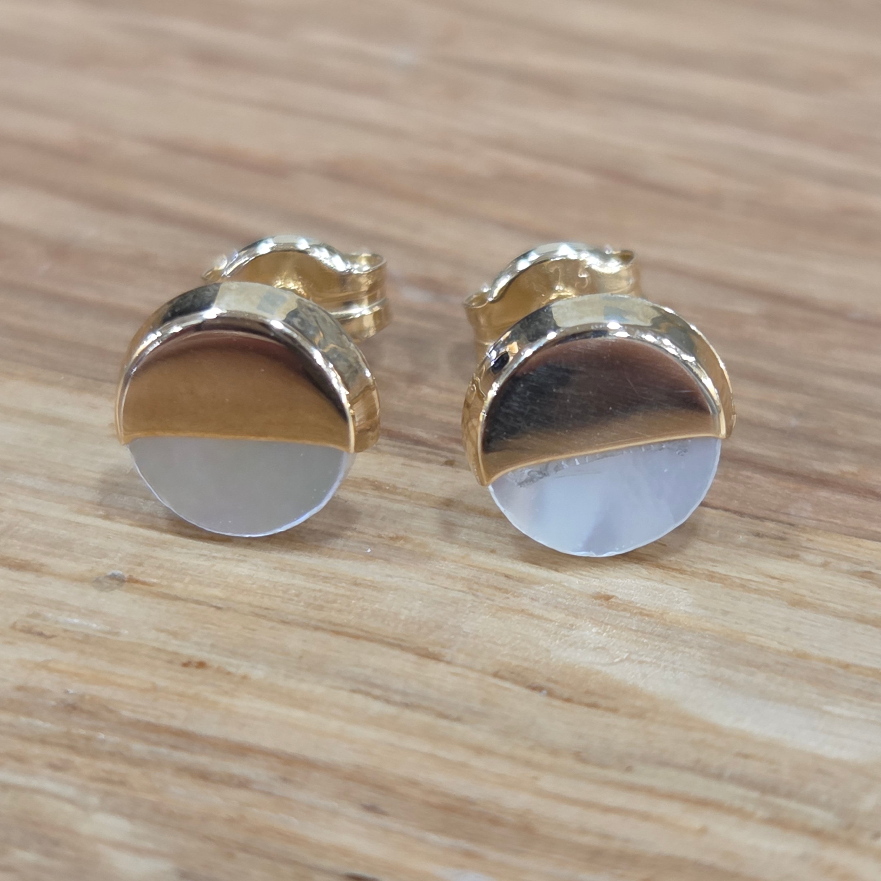 These stud earrings feature a chic circle design, crafted with half shimmering mother of pearl and half 9-carat gold, offering a refined and elegant touch to any outfit.
