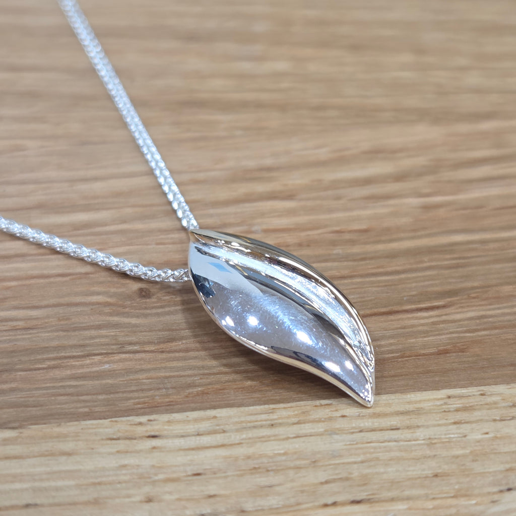 Embrace understated sophistication with this captivating wave pendant, expertly crafted from 9 carat gold and silver in perfect harmony. The flowing design exudes contemporary charm whilst the dual-metal composition guarantees enduring beauty and wearability. Transform your jewellery wardrobe by layering this pendant with our complementary earrings for an instantly polished, coordinated aesthetic.