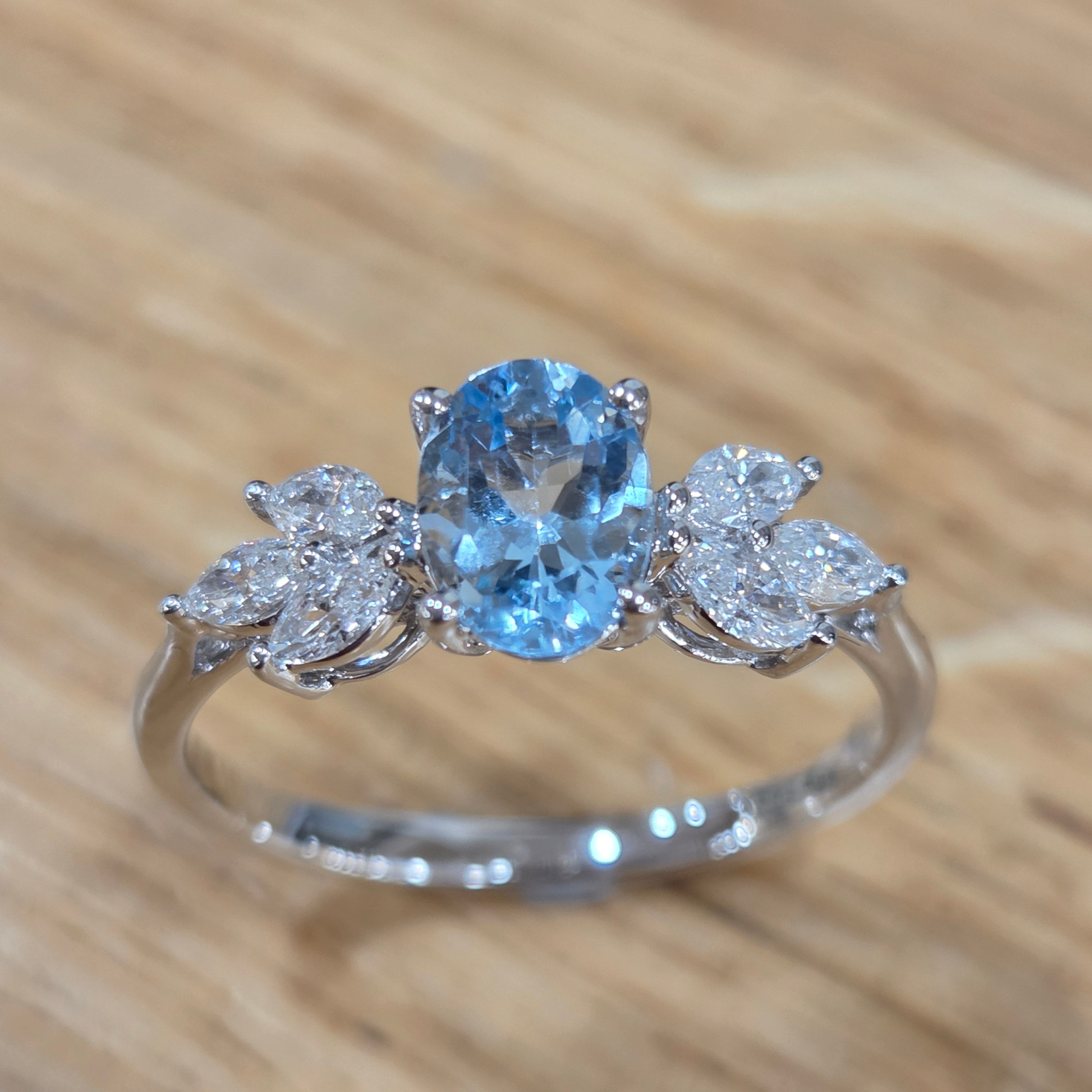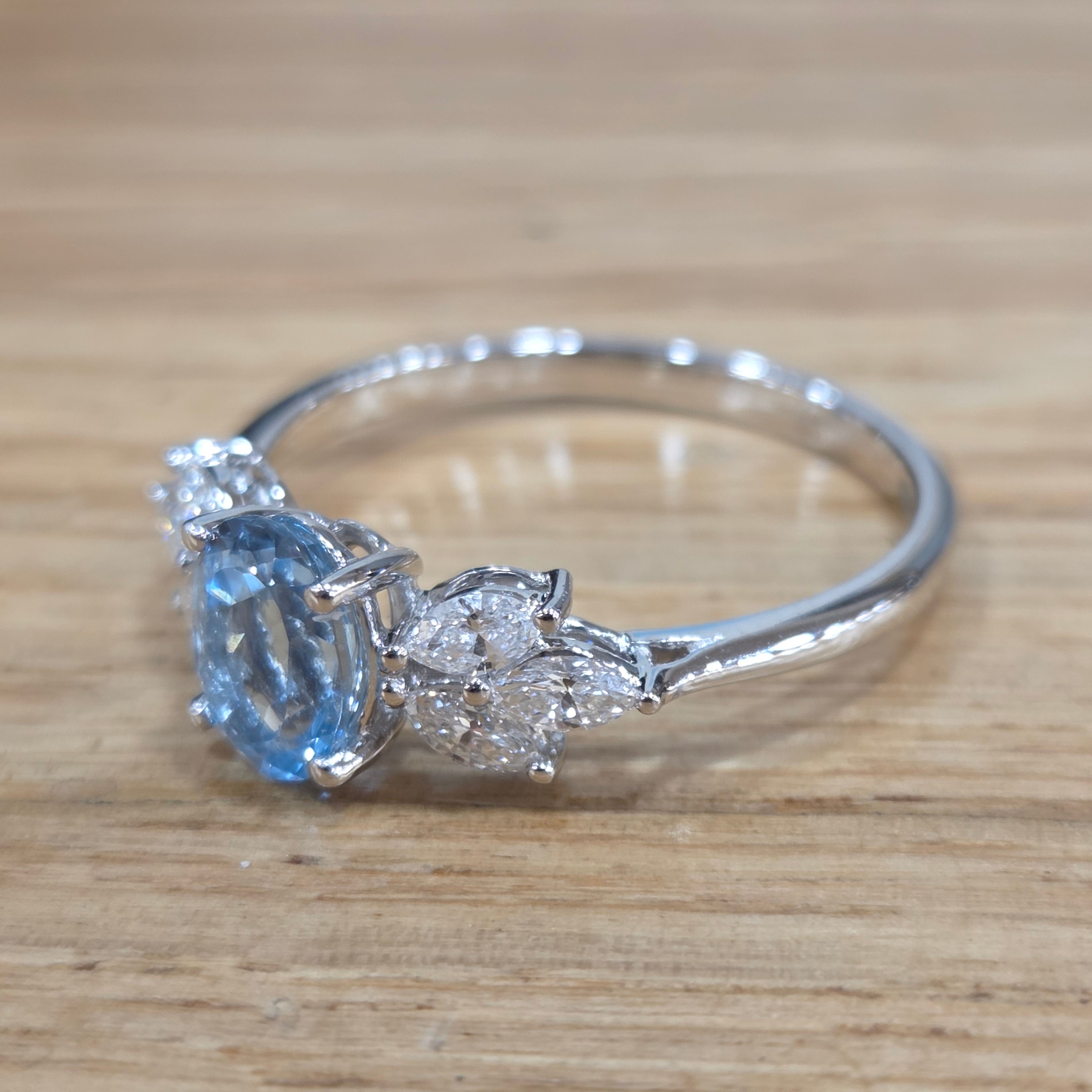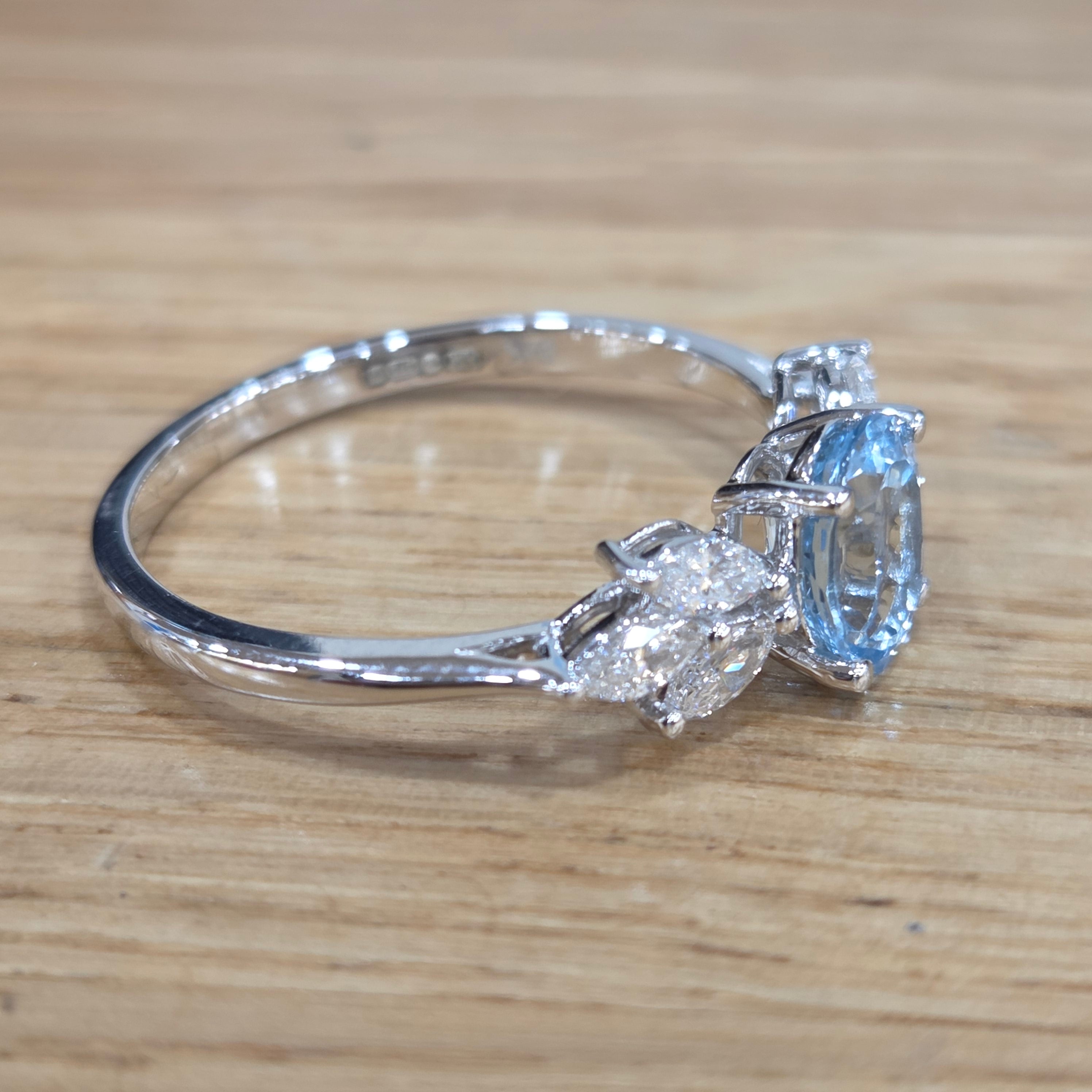 This exquisite 9ct white gold ring showcases a captivating oval aquamarine complemented by elegant marquise-cut diamonds, creating a truly breath-taking statement piece. Perfect for those seeking a distinctive and radiant design that celebrates timeless sophistication and natural beauty.
