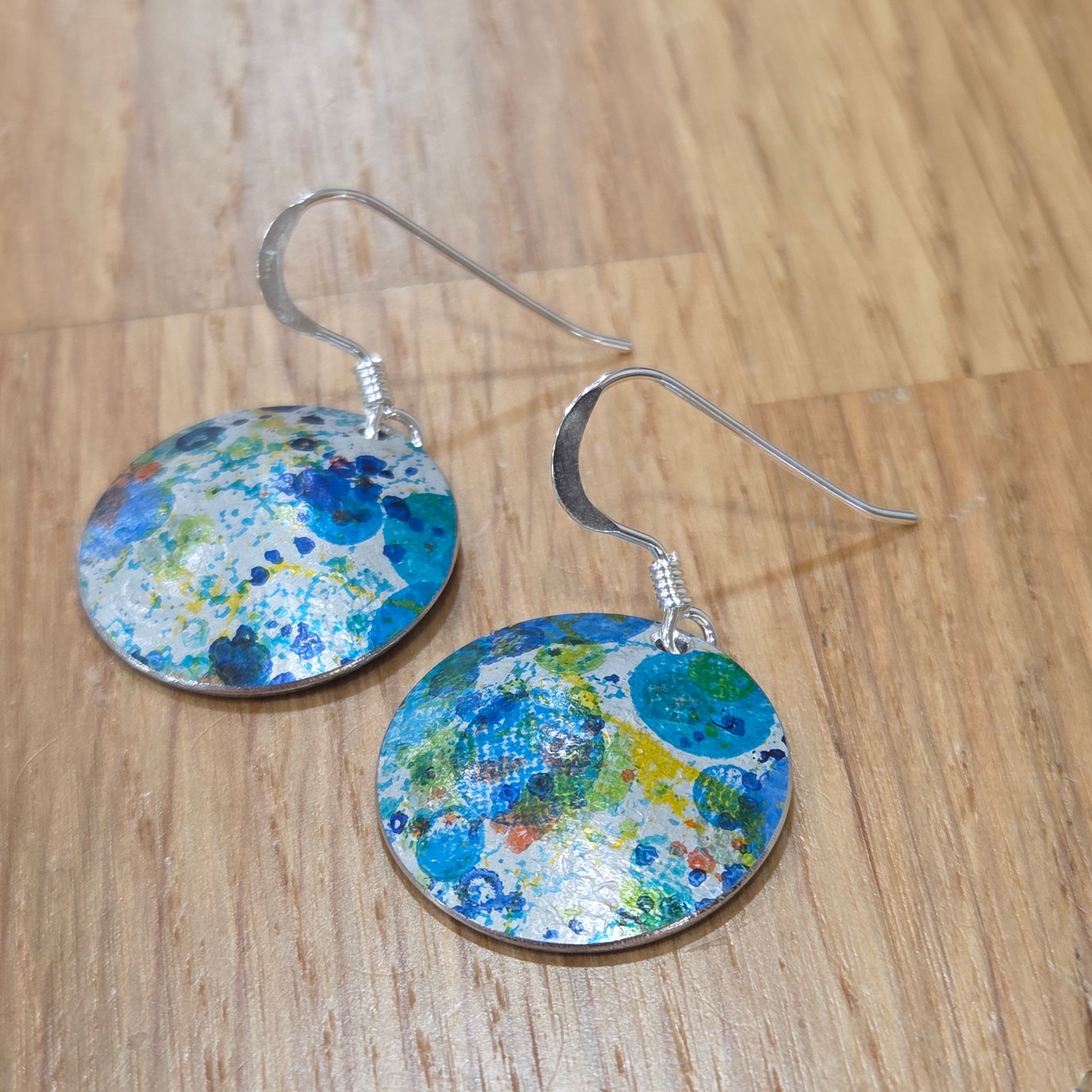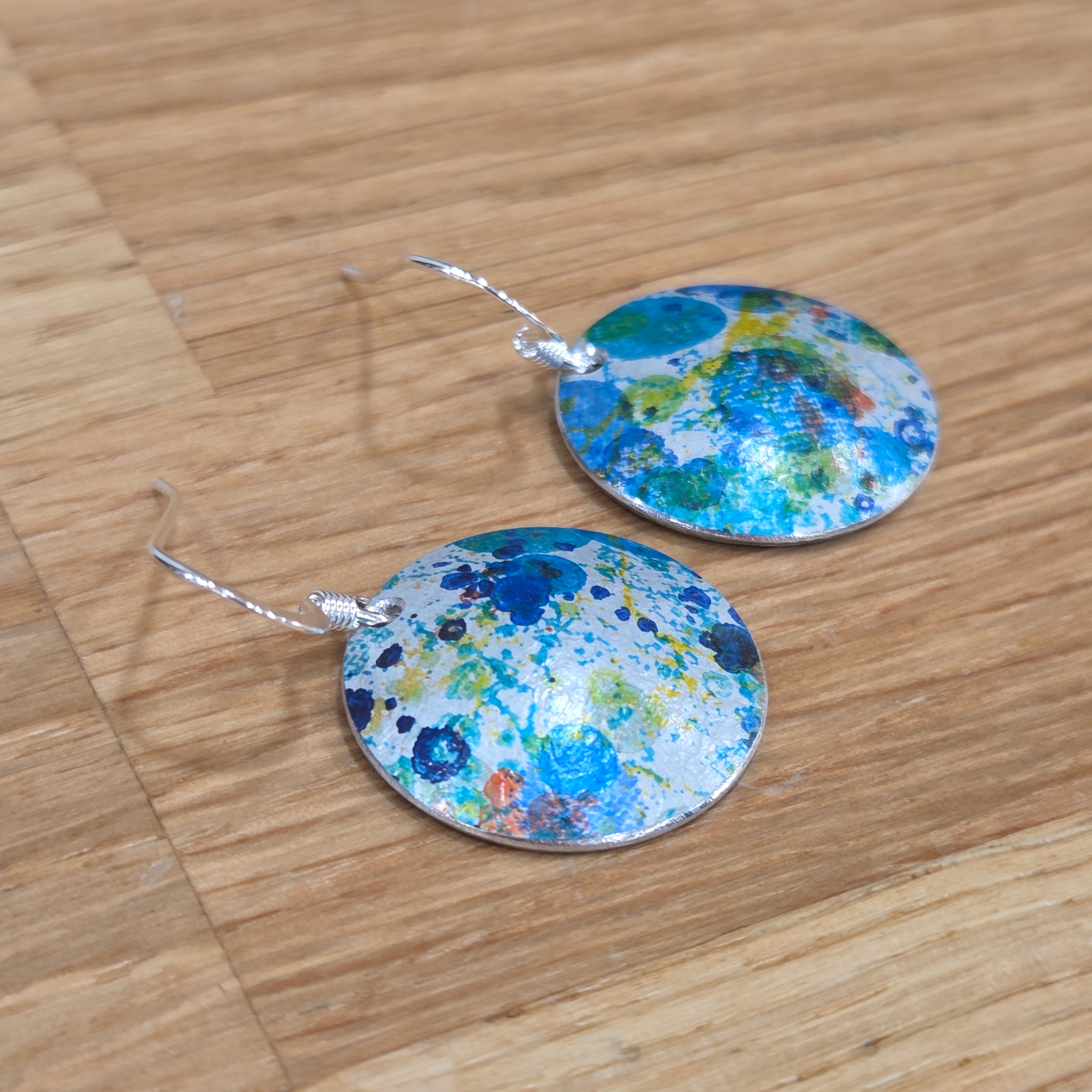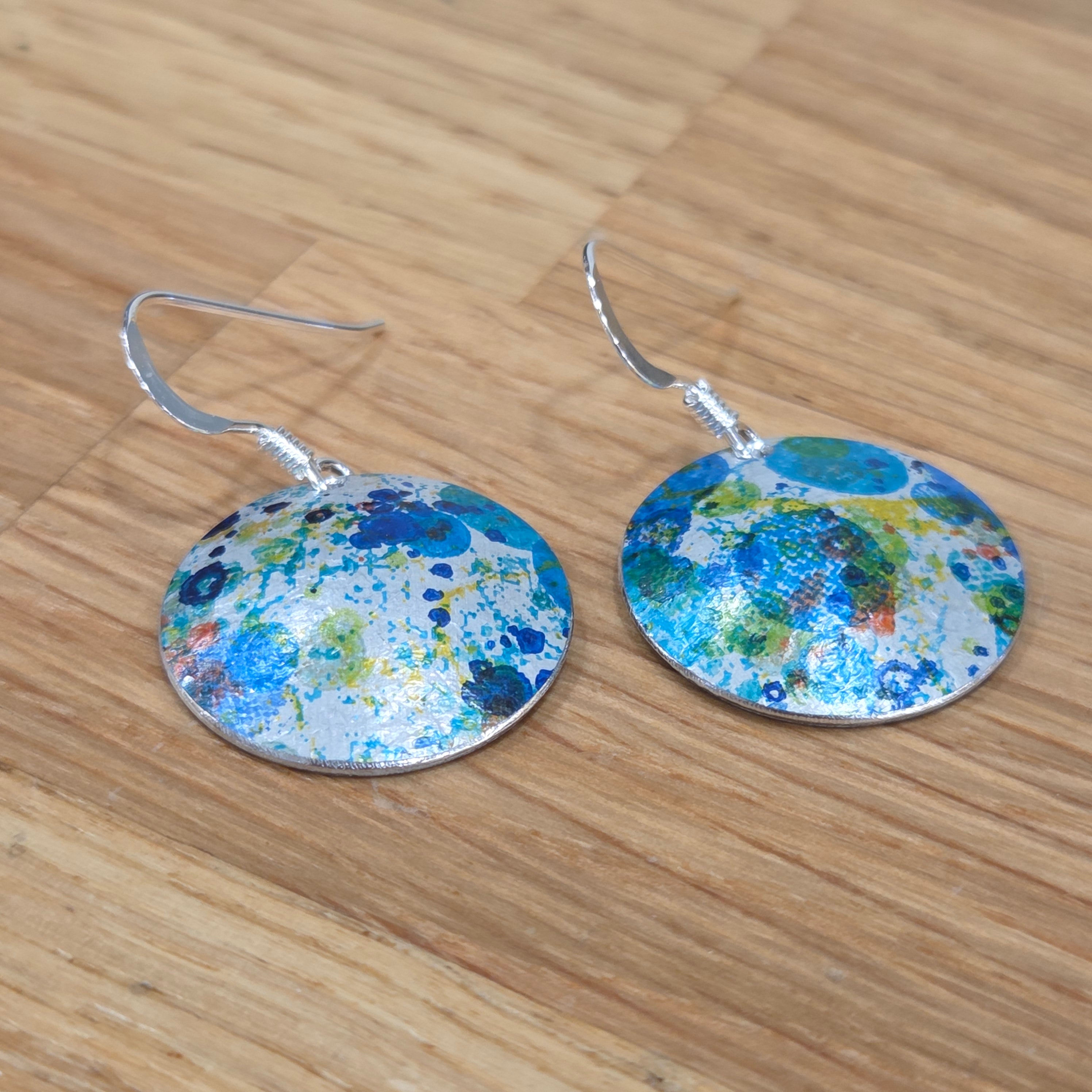 Handmade anodised aluminium small circle drop earrings in the pattern teal, a fun and colourful teal blue toned splatter design with a cool silver background. Mix and match with other pieces in the collection for a unique curated look.