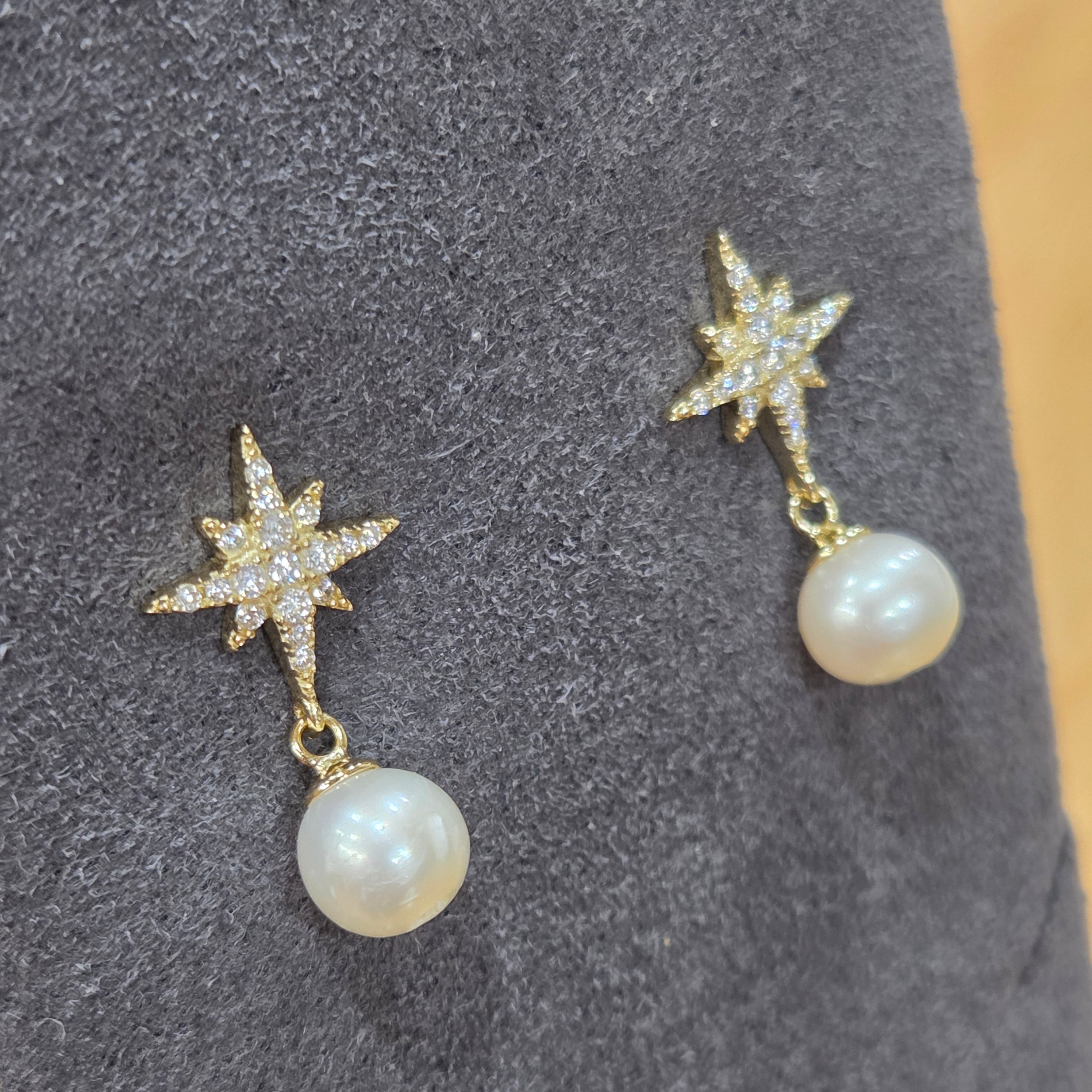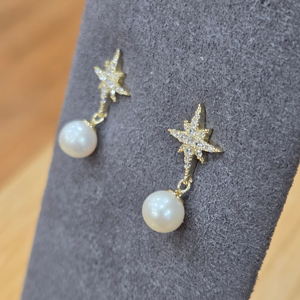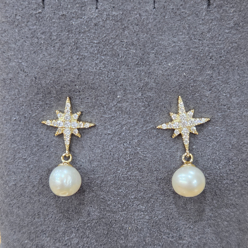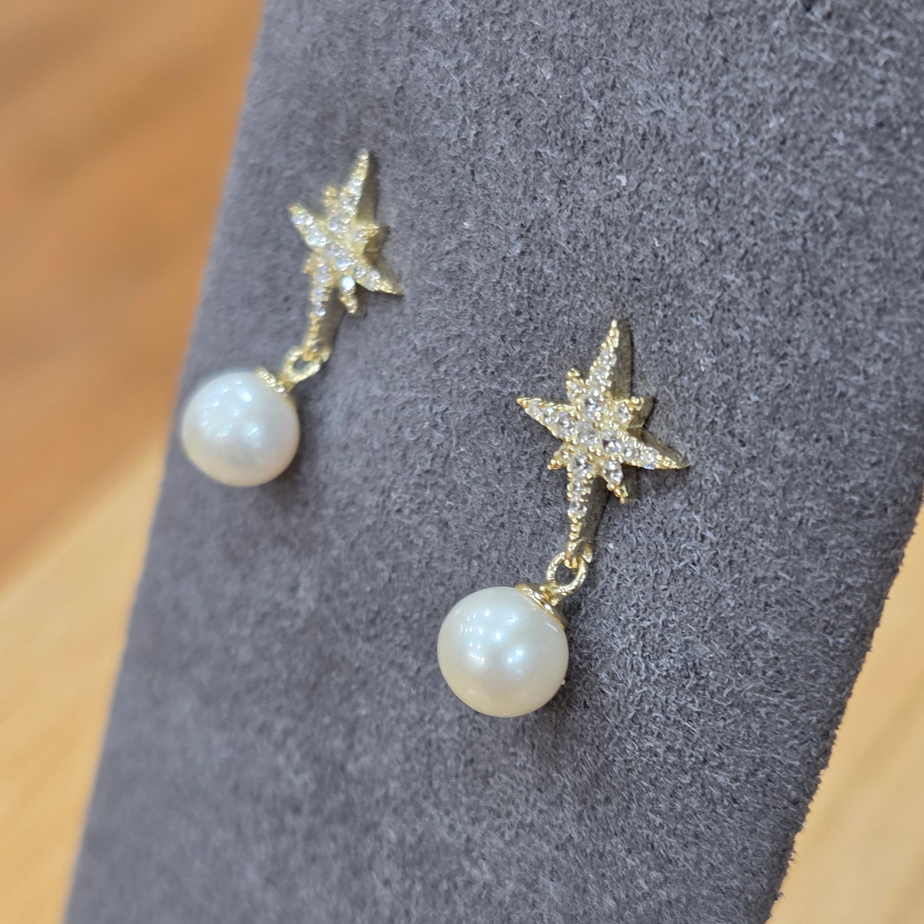 Elevate your jewellery collection with these enchanting gold plated star studs, where timeless elegance meets contemporary sparkle. Each earring features a lustrous freshwater pearl drop suspended beneath a star-shaped stud, adorned with glittering cubic zirconia stones that catch the light beautifully. Perfect for everyday wear or special occasions, these versatile pieces add a touch of celestial charm to any outfit. Complete your signature look by pairing them with the matching necklace for a coordinated, polished aesthetic that truly shines.