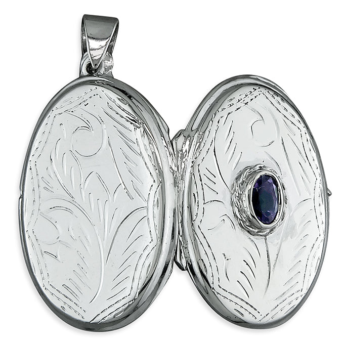 This exquisite silver locket combines timeless elegance with personal sentiment. The generous oval design features intricate engraving that catches the light beautifully, while a stunning oval-cut amethyst sits at its heart, adding a touch of regal purple sophistication. Perfect for keeping cherished memories close or gifting to someone special, this piece works as both a striking statement accessory and a meaningful keepsake. The quality craftsmanship ensures it becomes a treasured heirloom you'll reach for again and again.