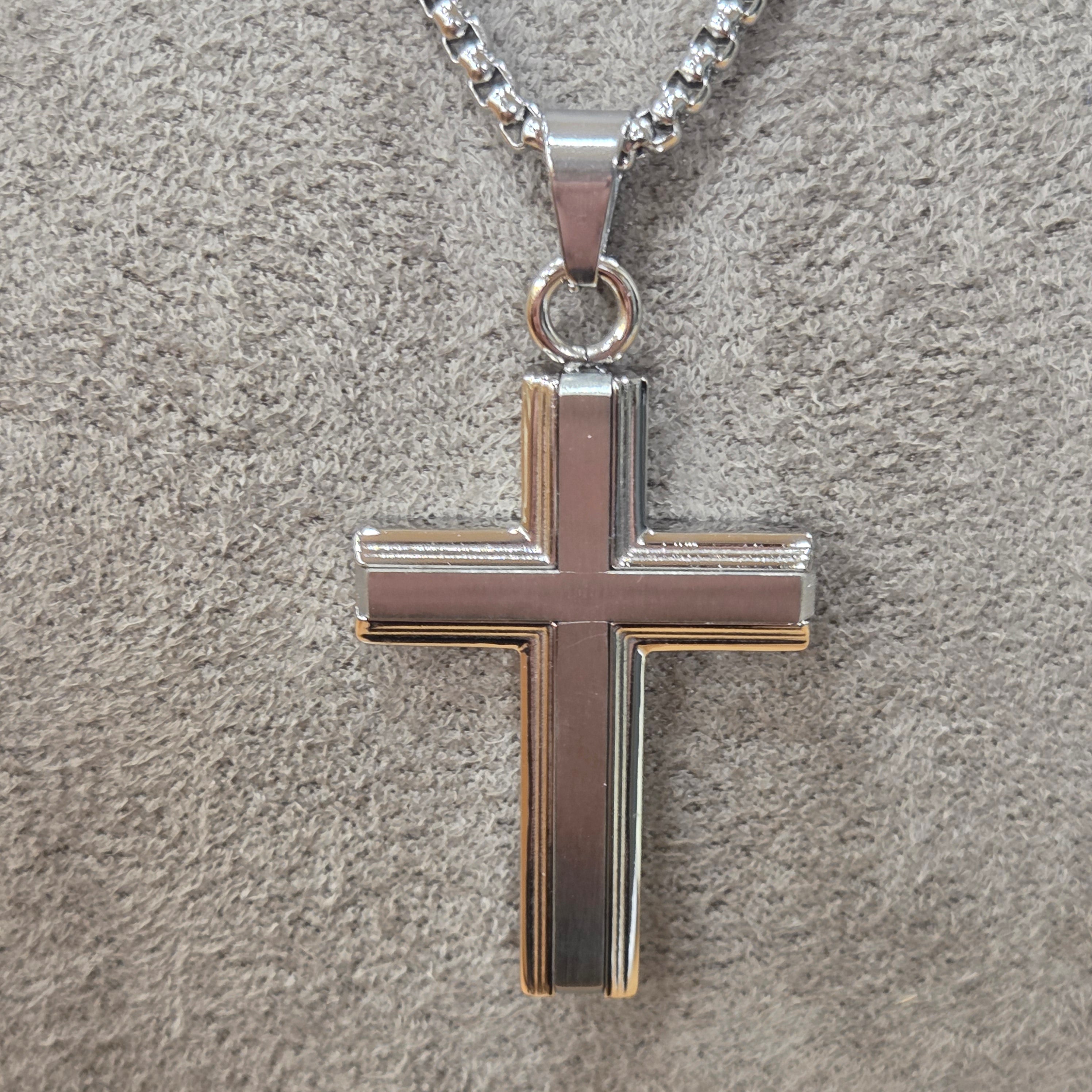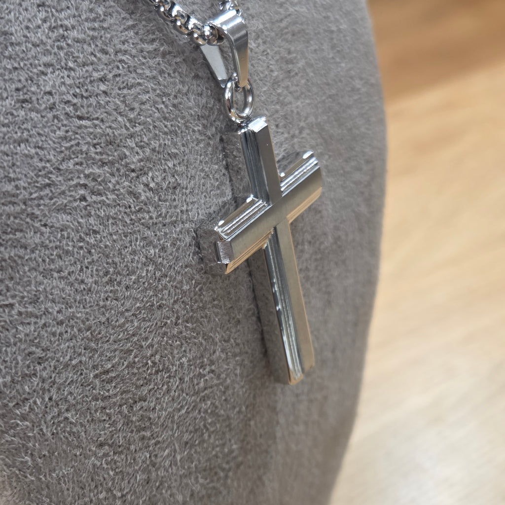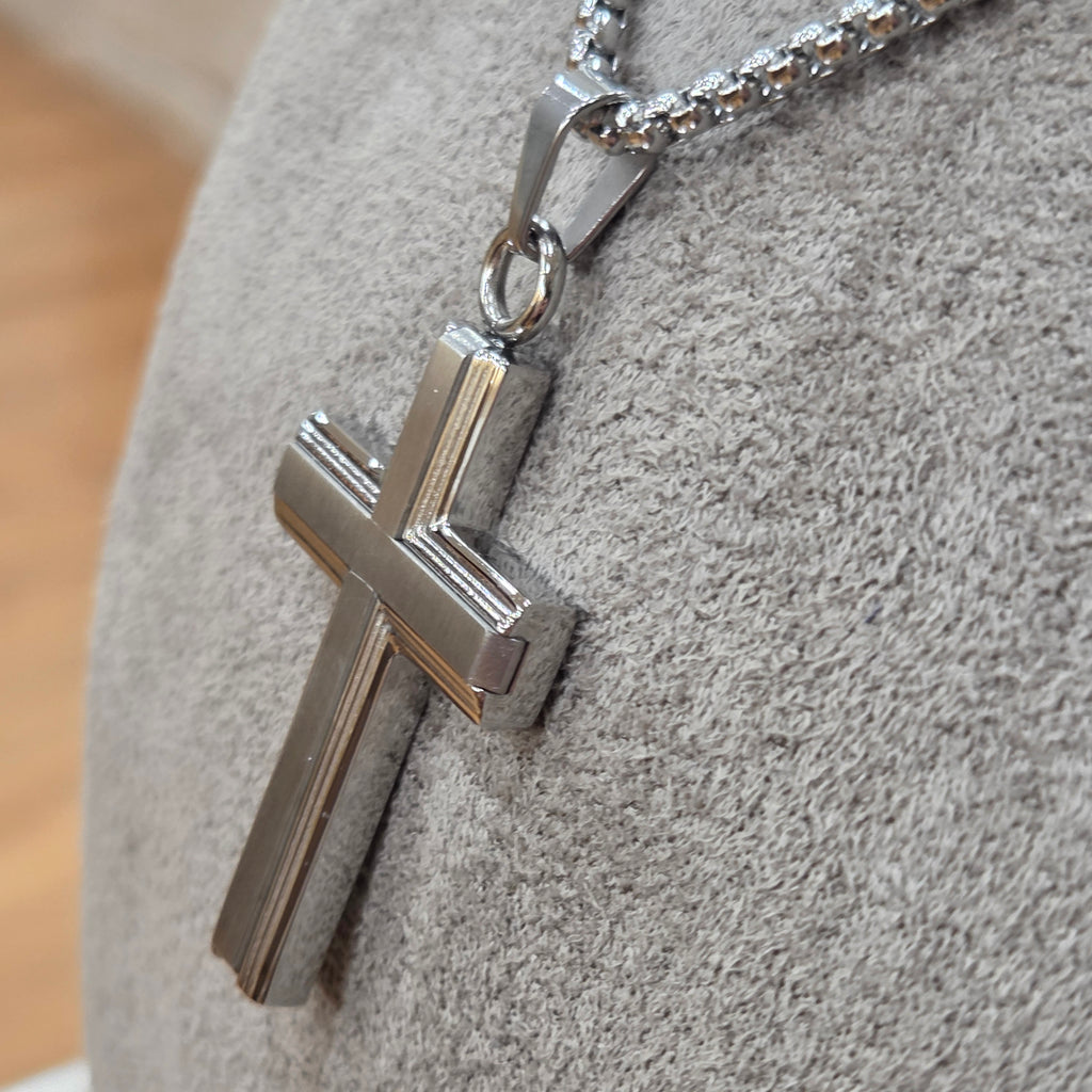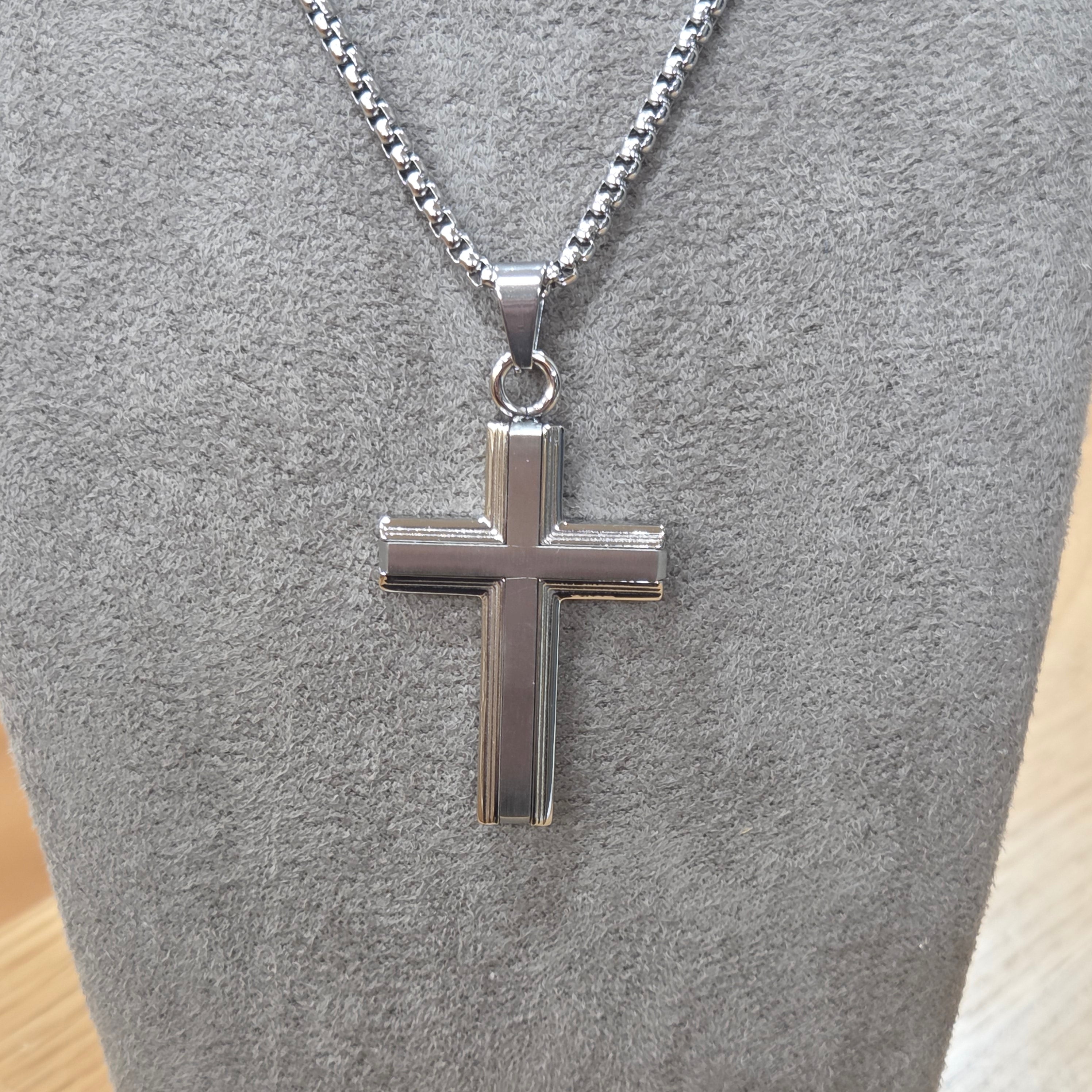 Make a confident statement with this commanding men's cross necklace, expertly fashioned from premium stainless steel. The expertly balanced combination of matte and polished textures creates visual depth and modern sophistication. At a substantial size, this piece demands attention while maintaining refined elegance. Arrives complete with a 50cm chain, offering immediate wearability for the discerning man who values quality and presence.