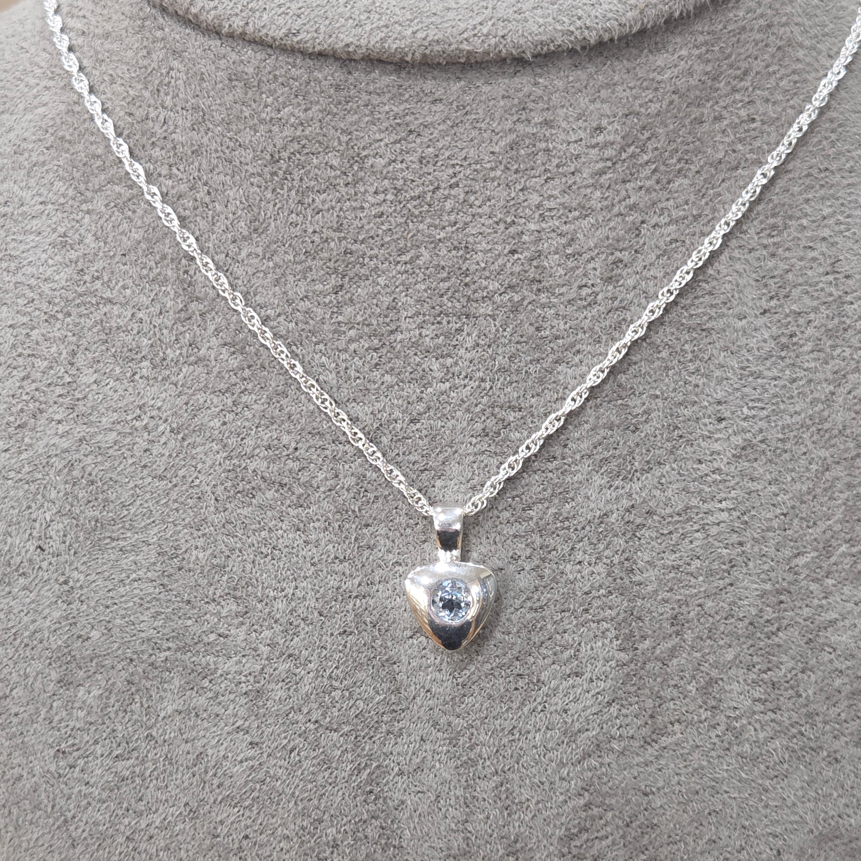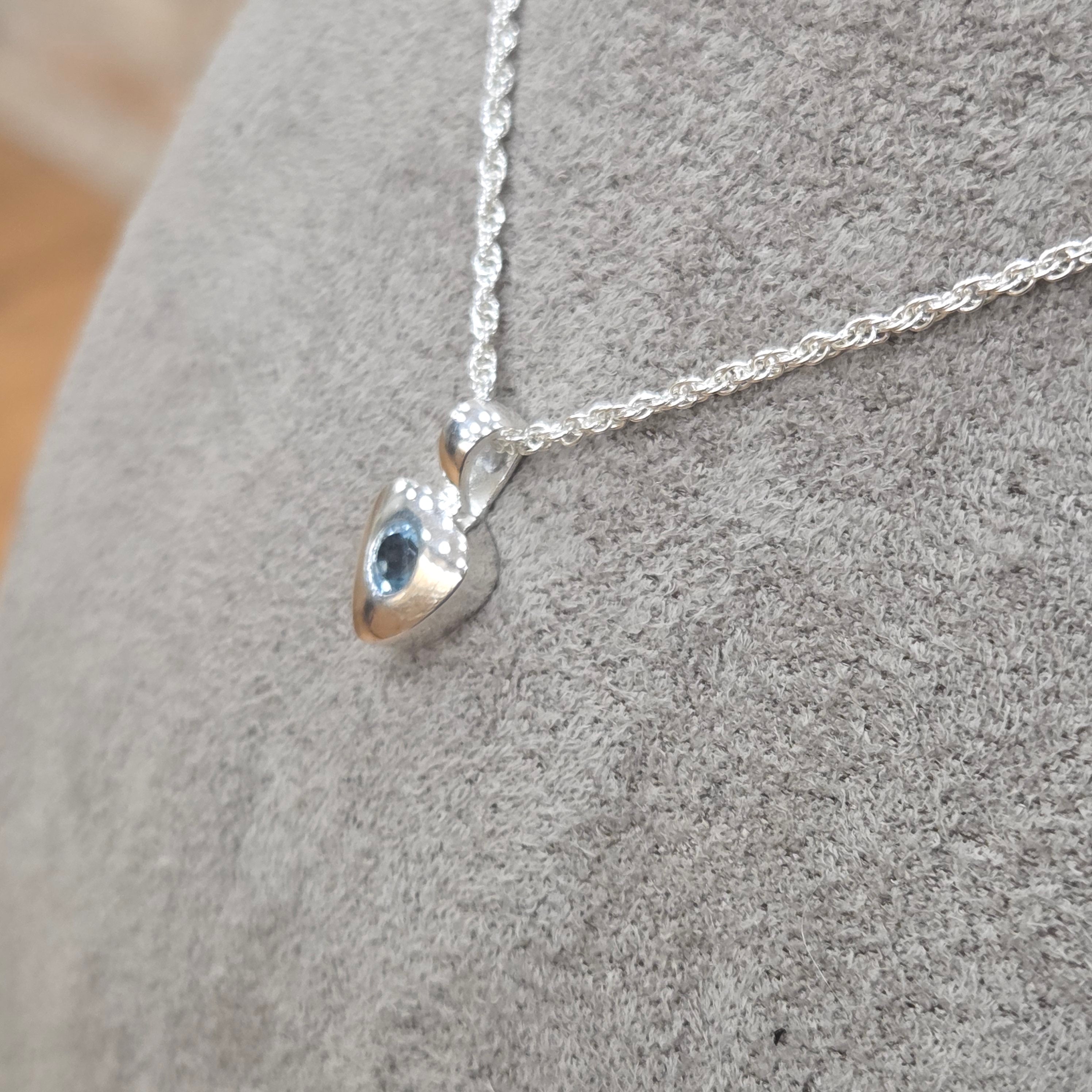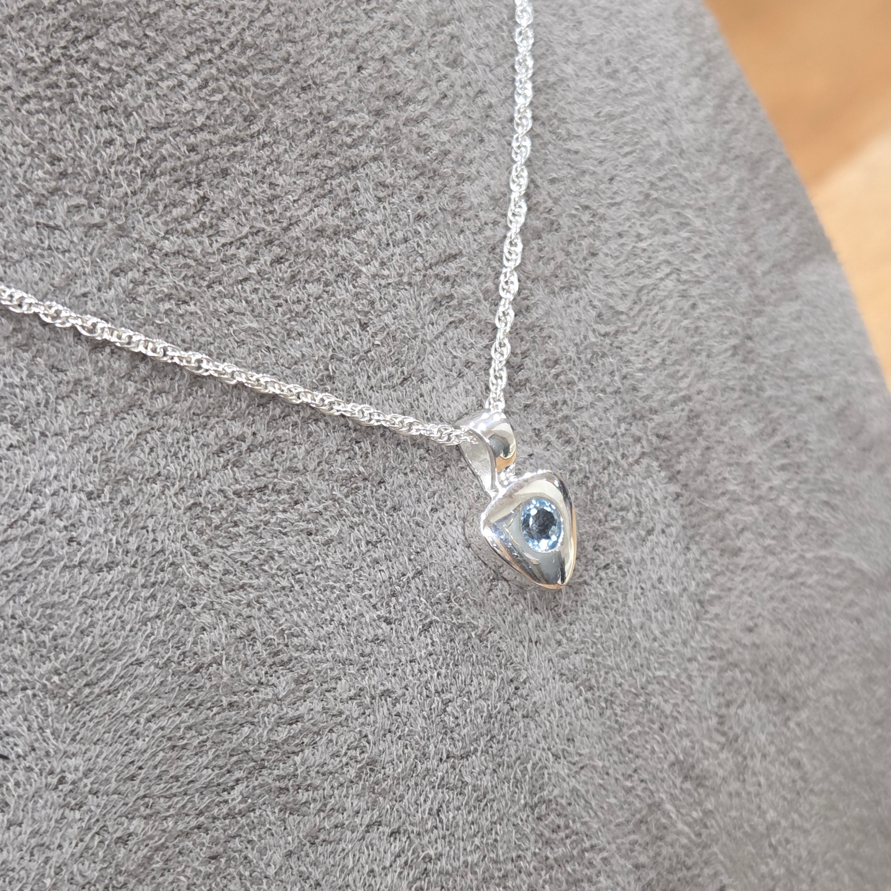 Celebrate understated elegance with this striking sterling silver pendant. The clean triangular silhouette frames a radiant blue topaz gemstone, its brilliant facets catching the light beautifully. This minimalist design lets the stone's captivating blue hue take centre stage, creating a timeless piece that effortlessly elevates any look with natural sophistication and charm.