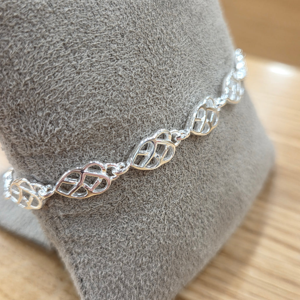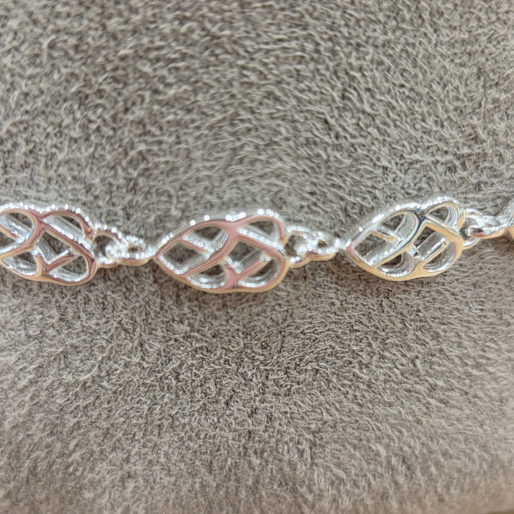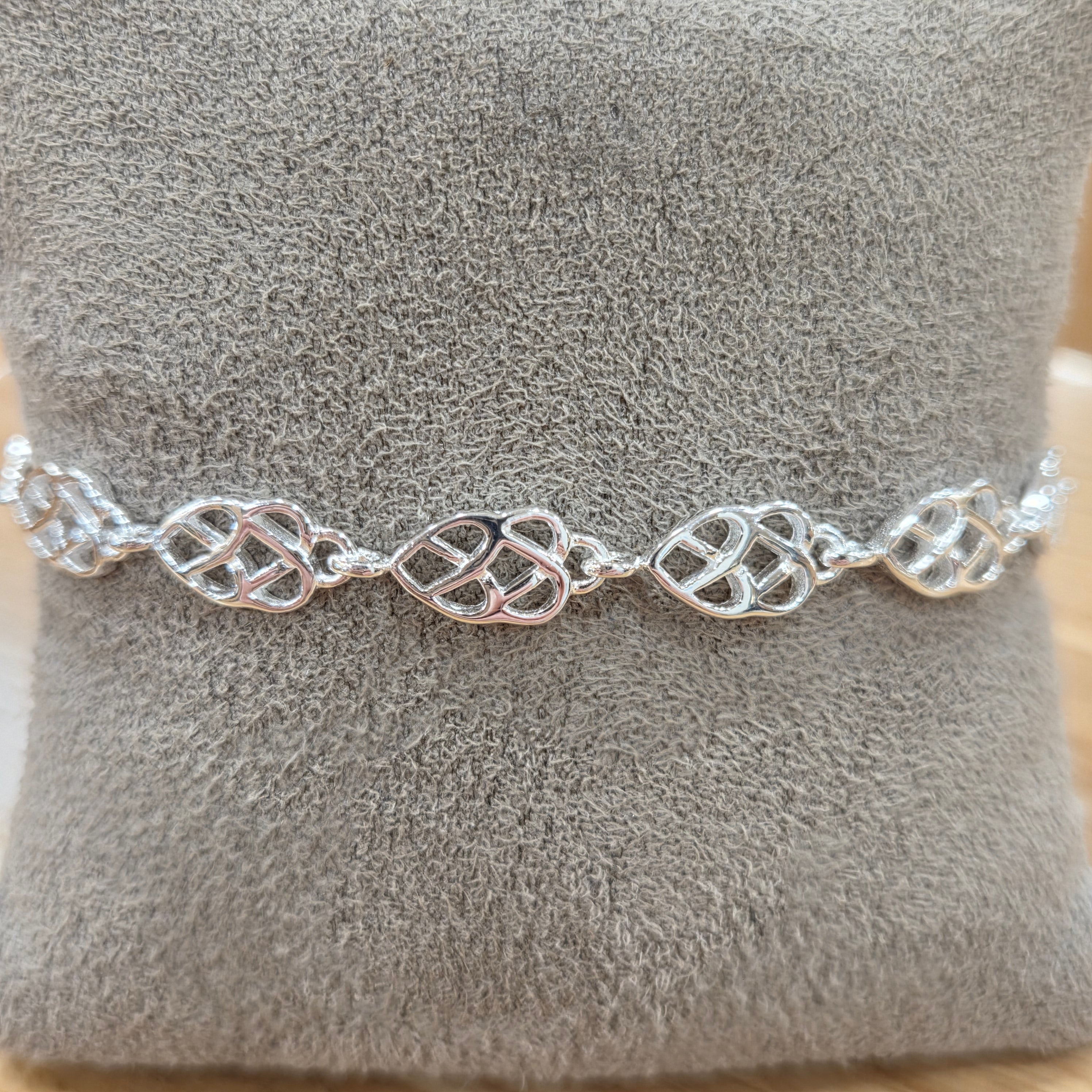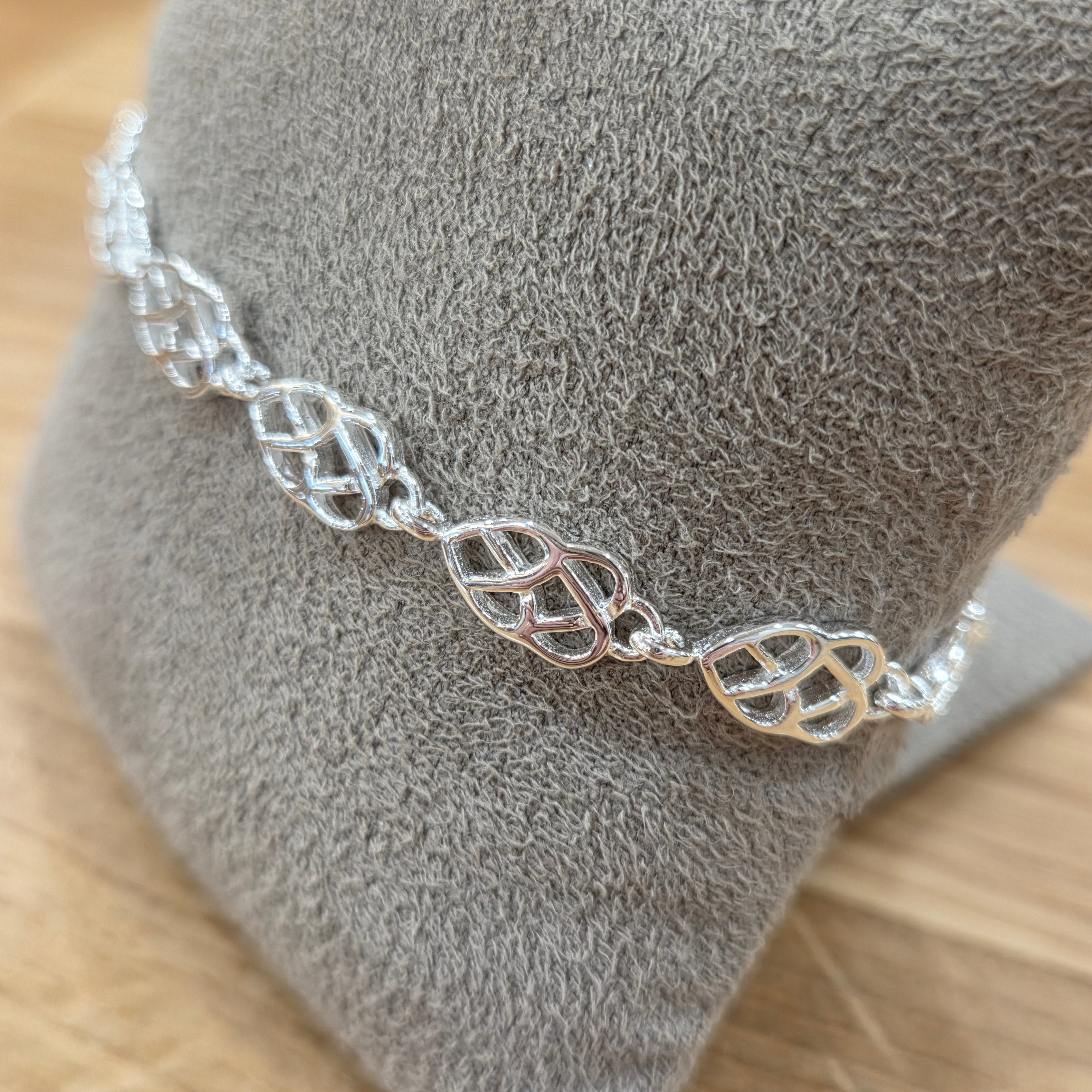Embrace timeless Celtic heritage with this striking sterling silver link bracelet, where intricate knot designs weave together tradition and contemporary elegance. Each carefully crafted link showcases the symbolic beauty of Celtic patterns.  Perfect for those who appreciate meaningful jewellery with depth and character, this bracelet effortlessly transitions from everyday wear to special occasions.