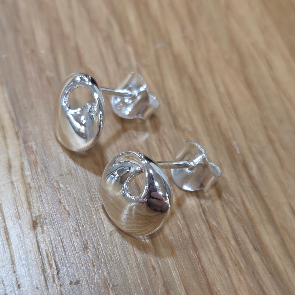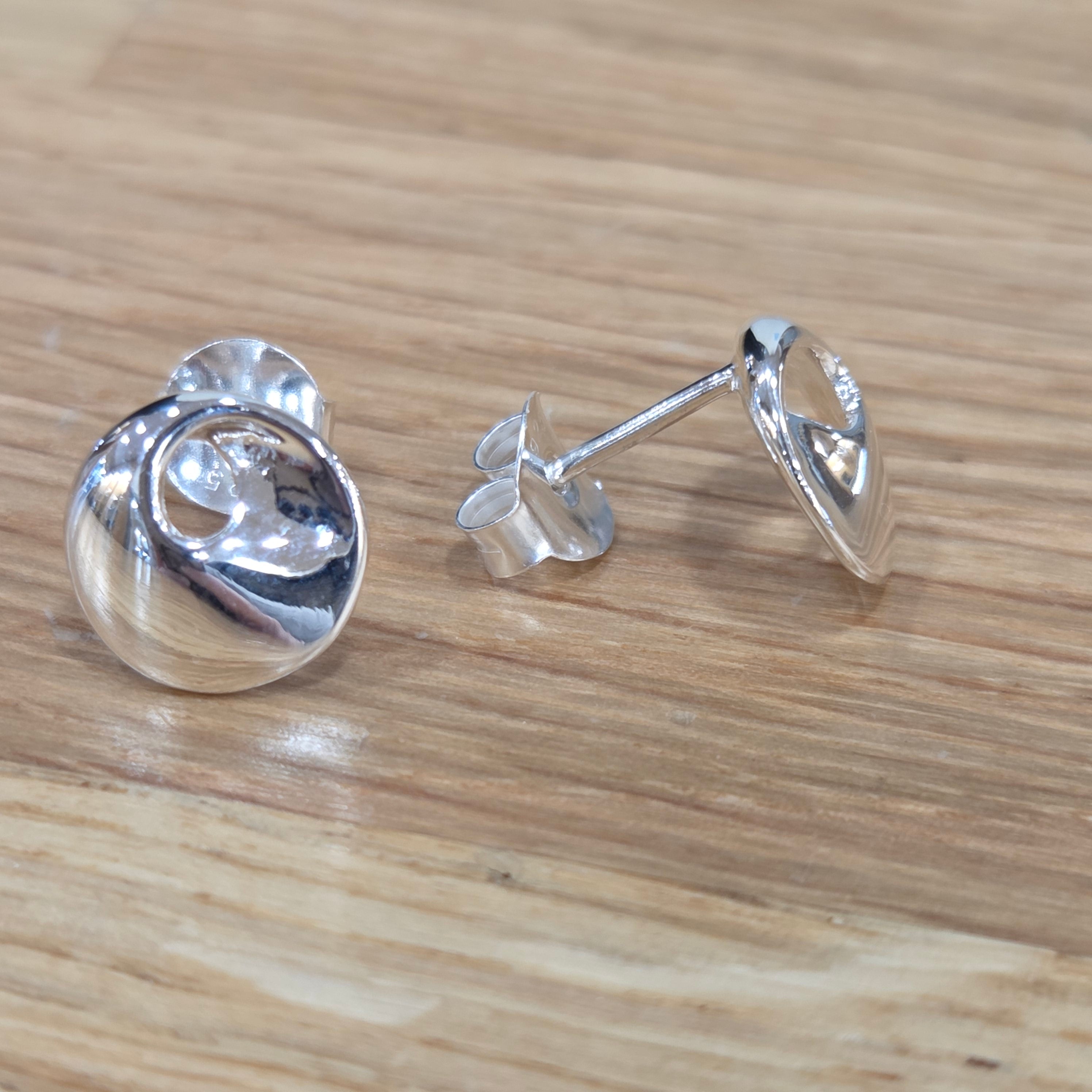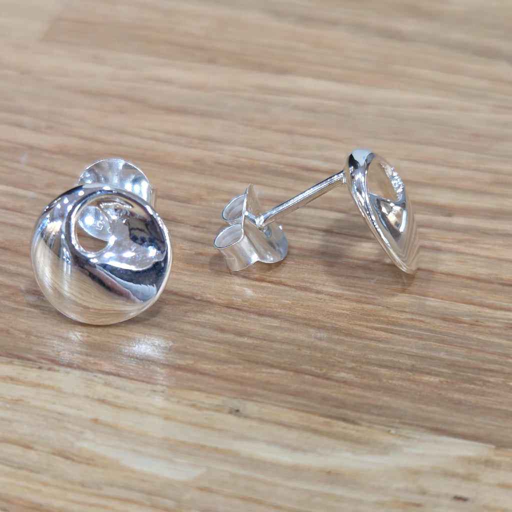 These sterling silver stud earrings feature a sleek curved Mobius design with a shiny, polished surface, perfect for adding a modern touch to any outfit.