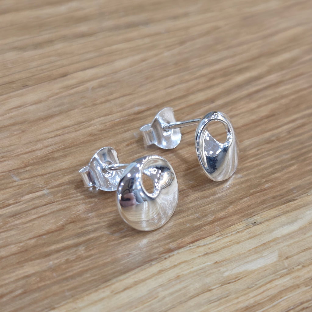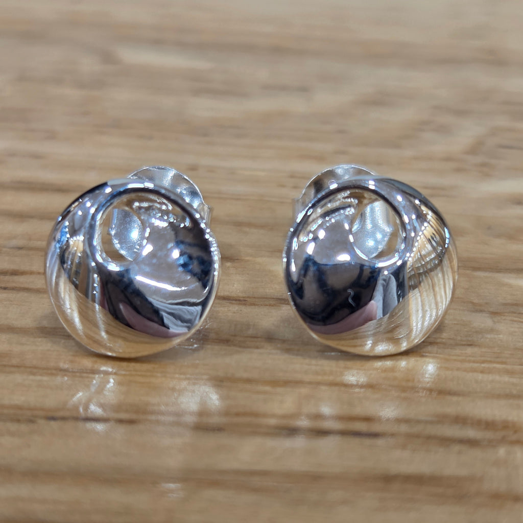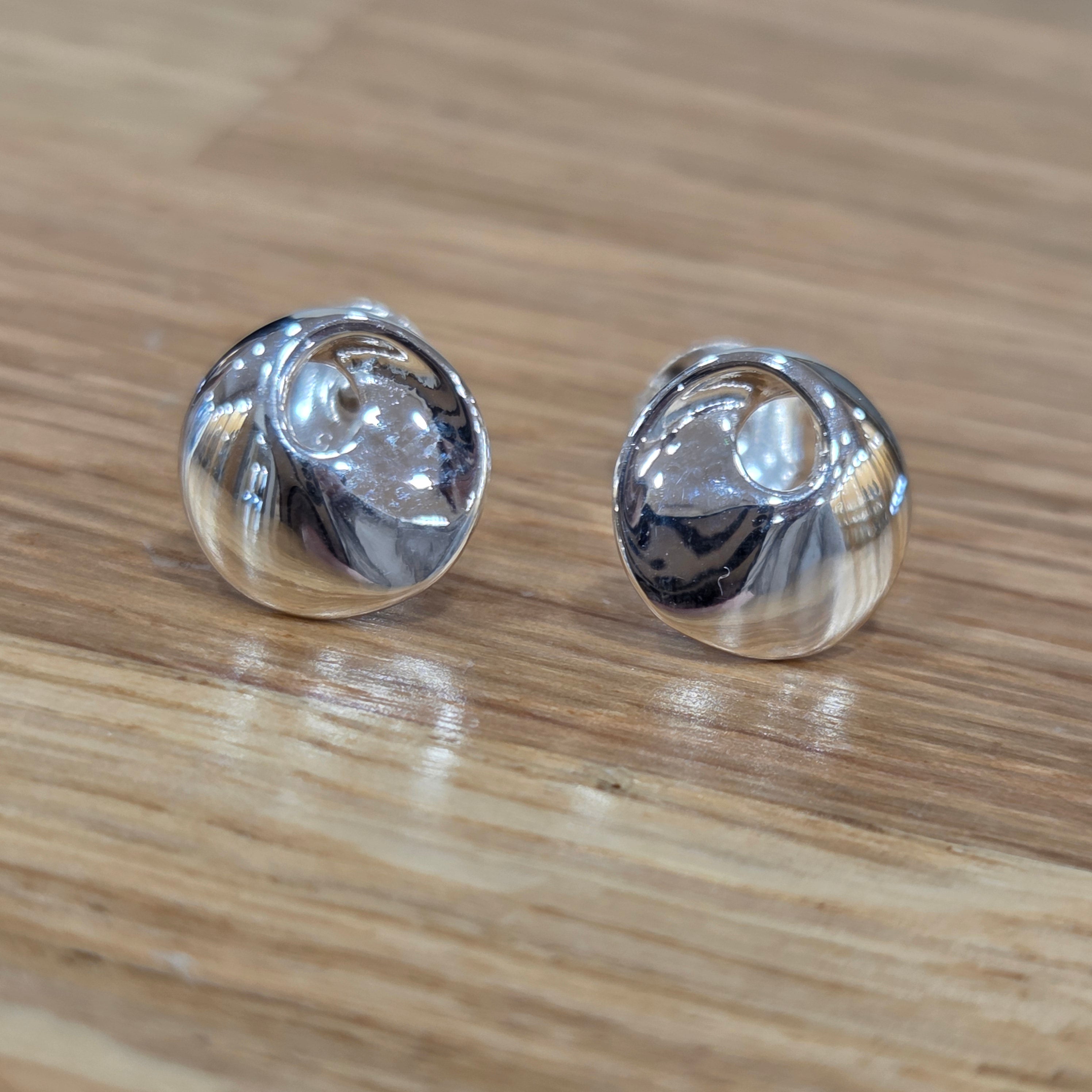 These sterling silver stud earrings feature a sleek curved Mobius design with a shiny, polished surface, perfect for adding a modern touch to any outfit.