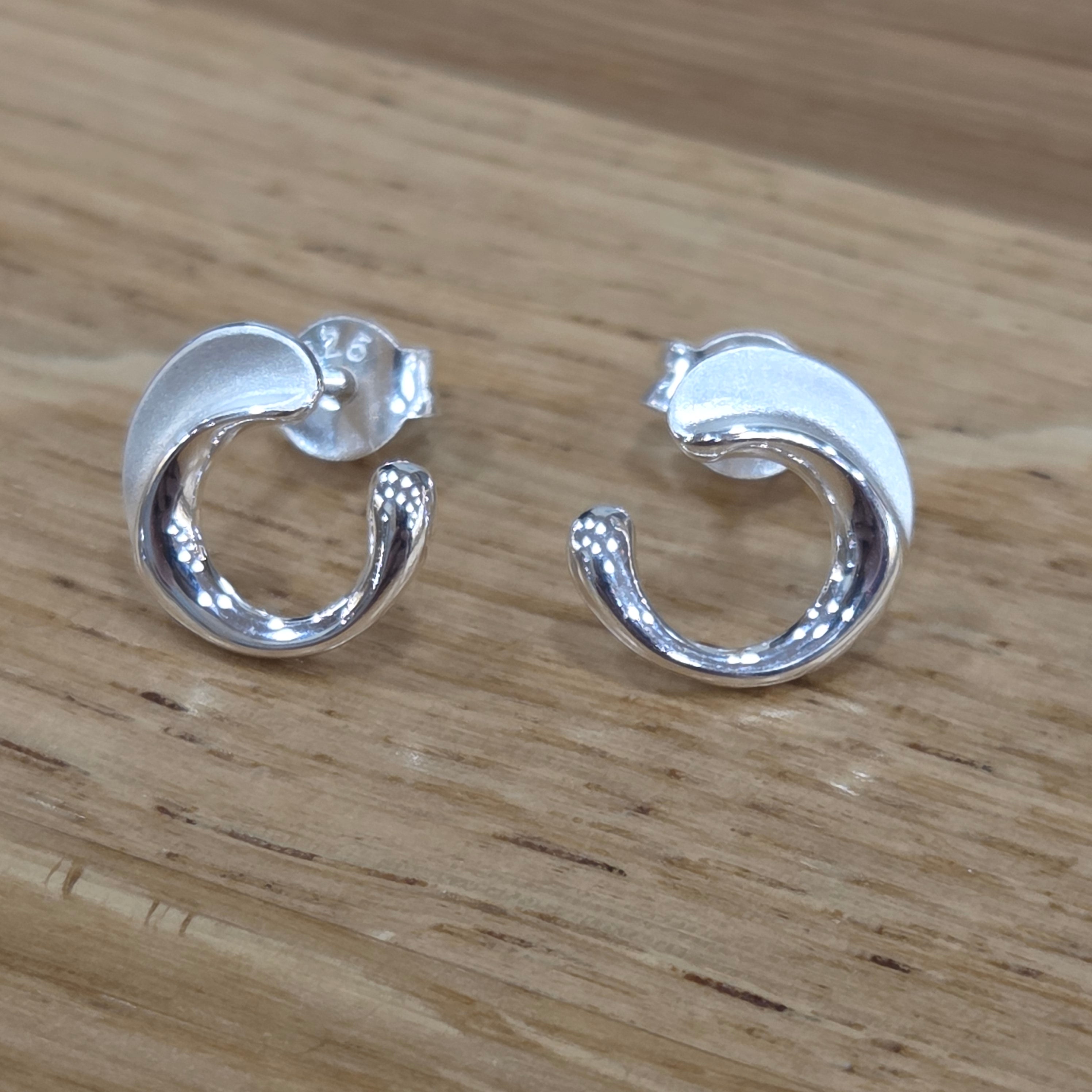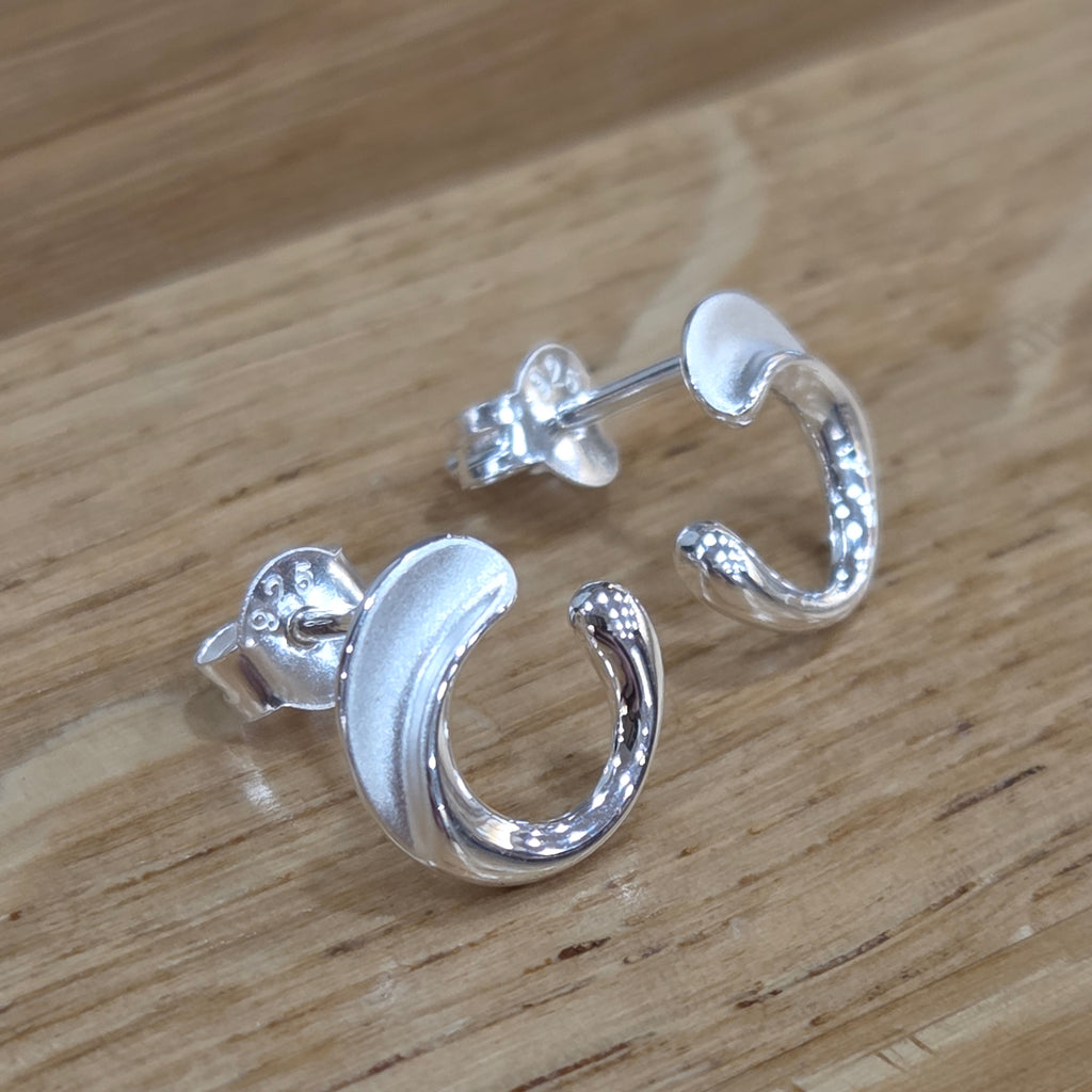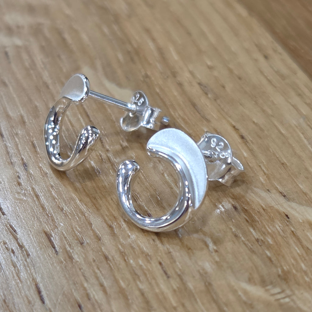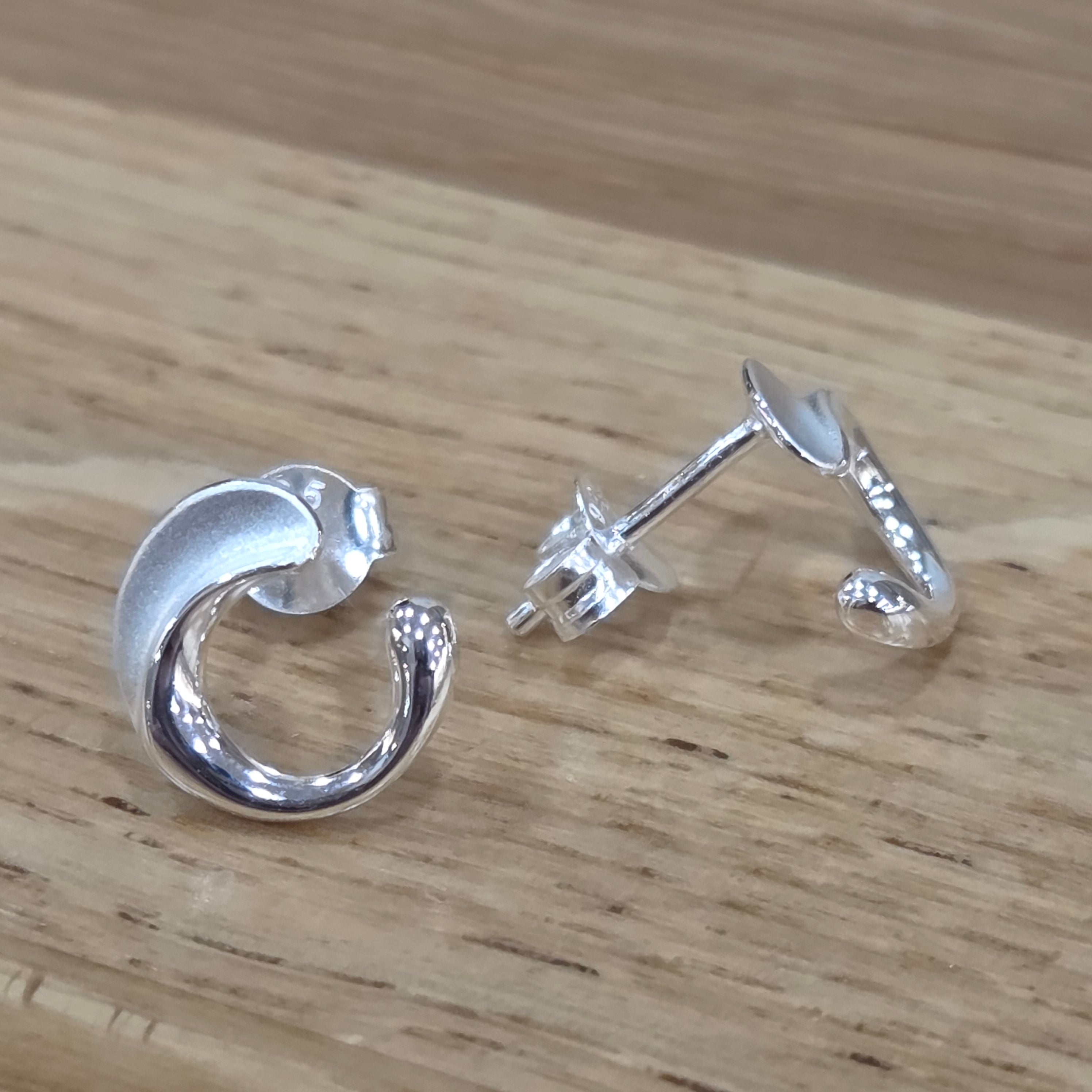 Discover the understated elegance of these silver curved studs, where delicate graduation meets contemporary design. Each earring features a flattened profile and striking contrast between soft matt and gleaming polished surfaces, creating visual depth that catches the light beautifully. Perfect for everyday wear or layering with other pieces, these versatile studs offer timeless sophistication in a compact, wearable form.