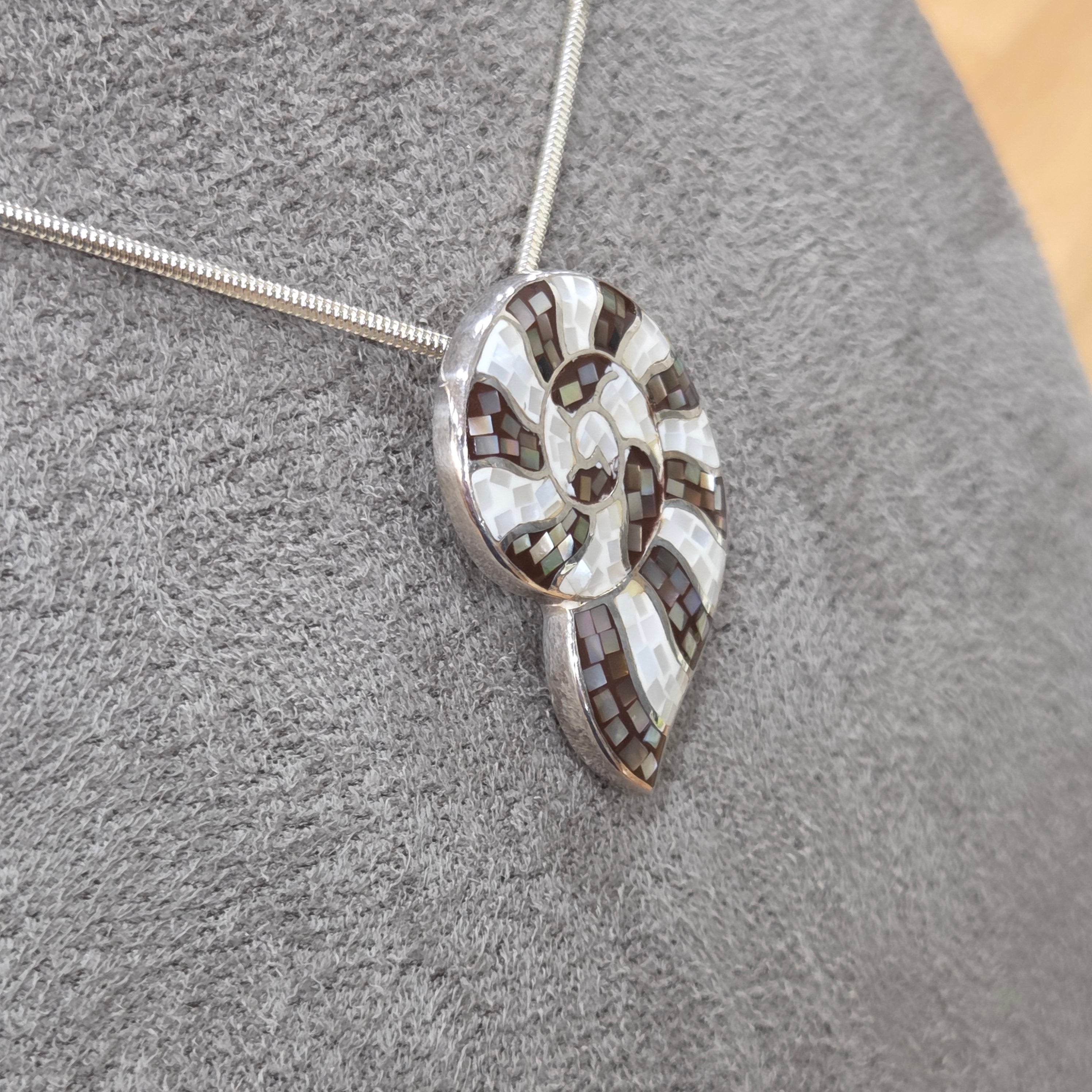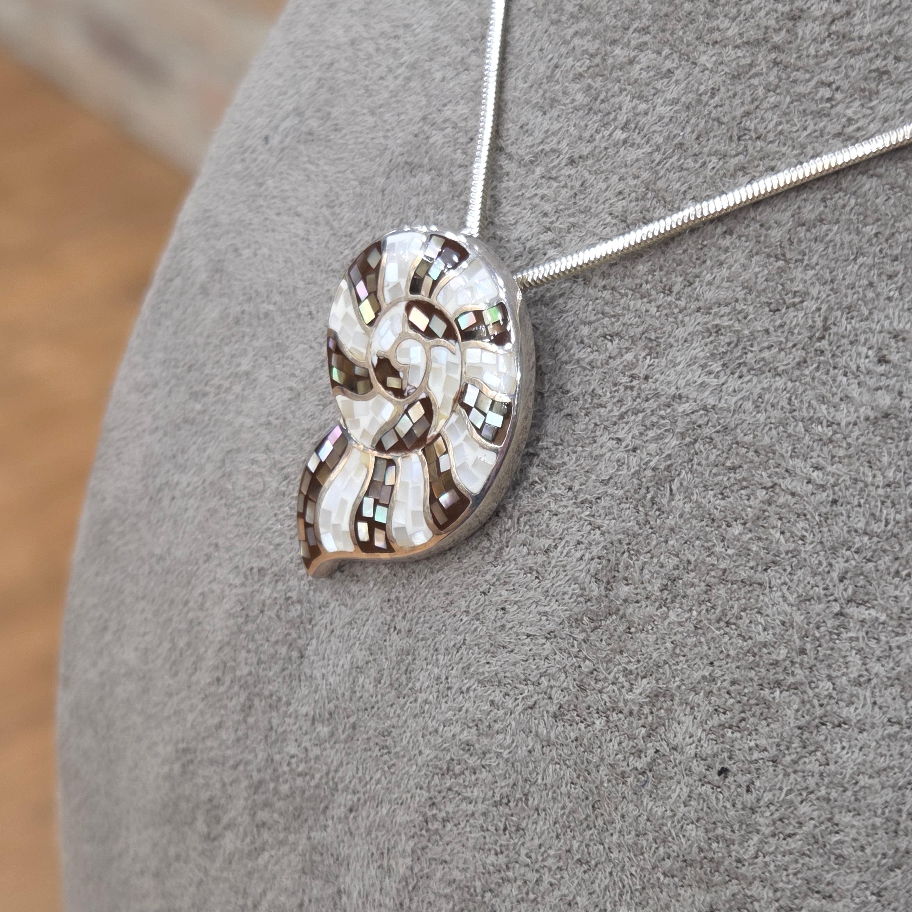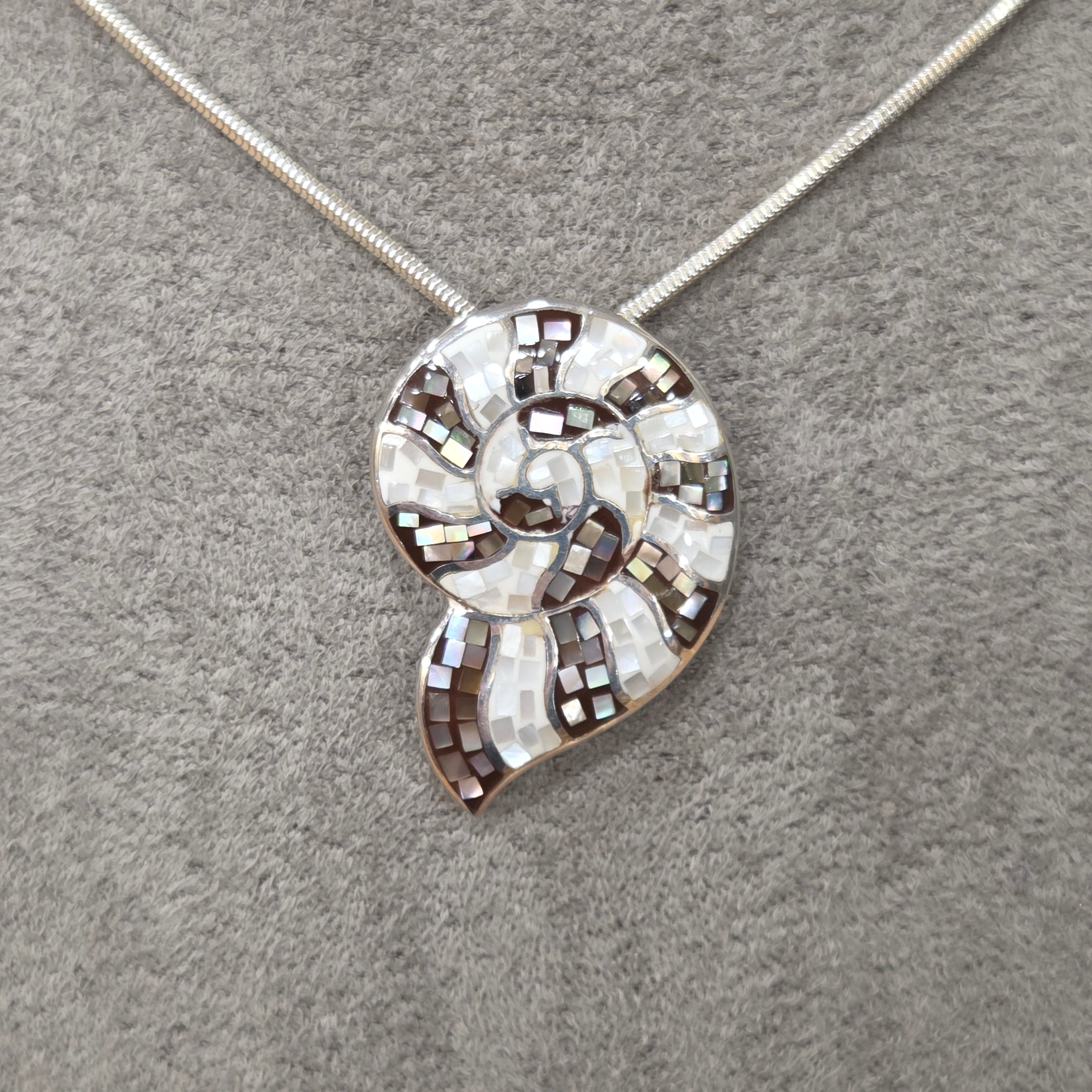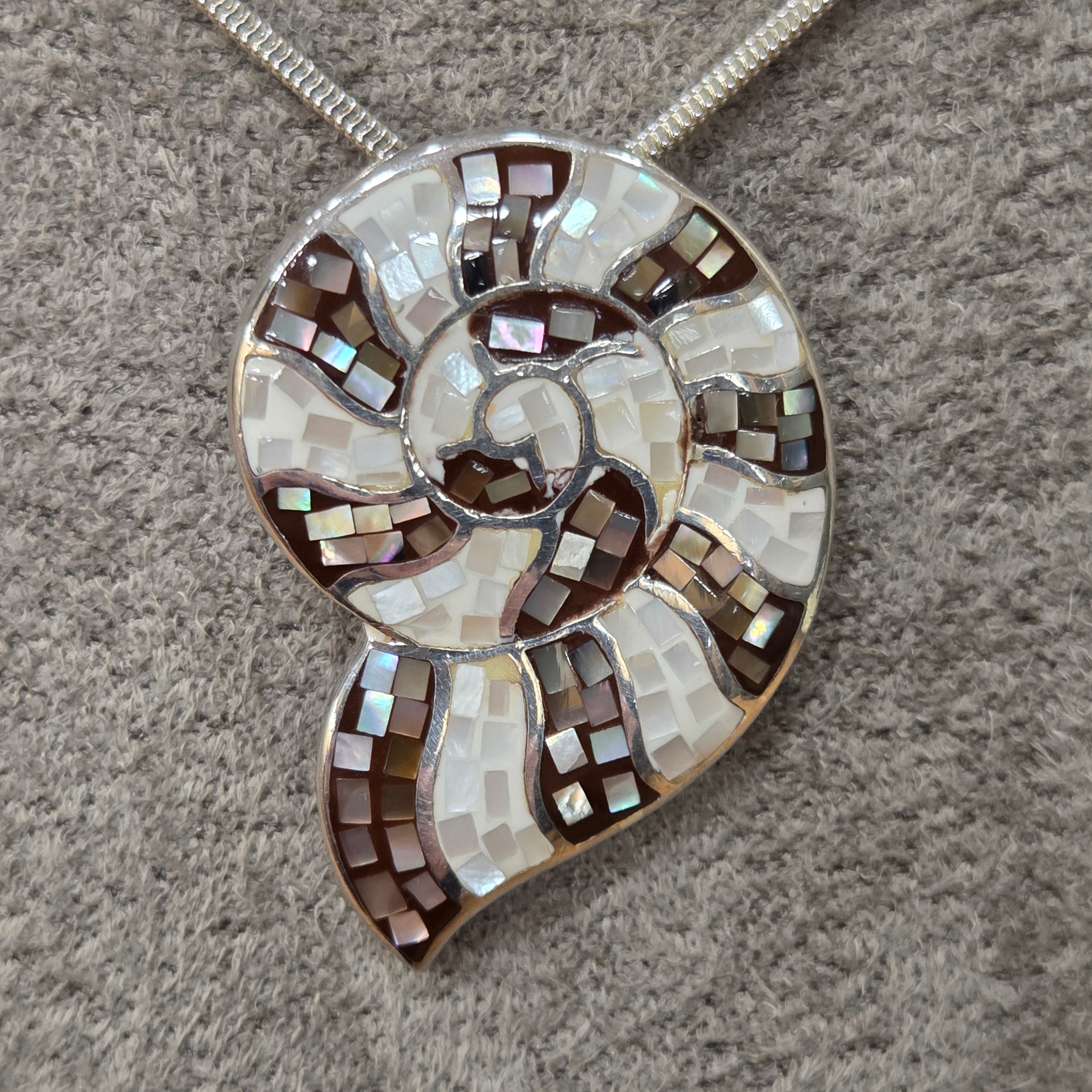 Crafted from gleaming sterling silver, this captivating pendant celebrates the natural beauty of mother of pearl through an intricate mosaic design. Delicate fragments are thoughtfully arranged to create a distinctive shell silhouette, each piece catching the light to reveal shimmering iridescence. A truly special accessory that brings together artisanal craftsmanship and timeless elegance.