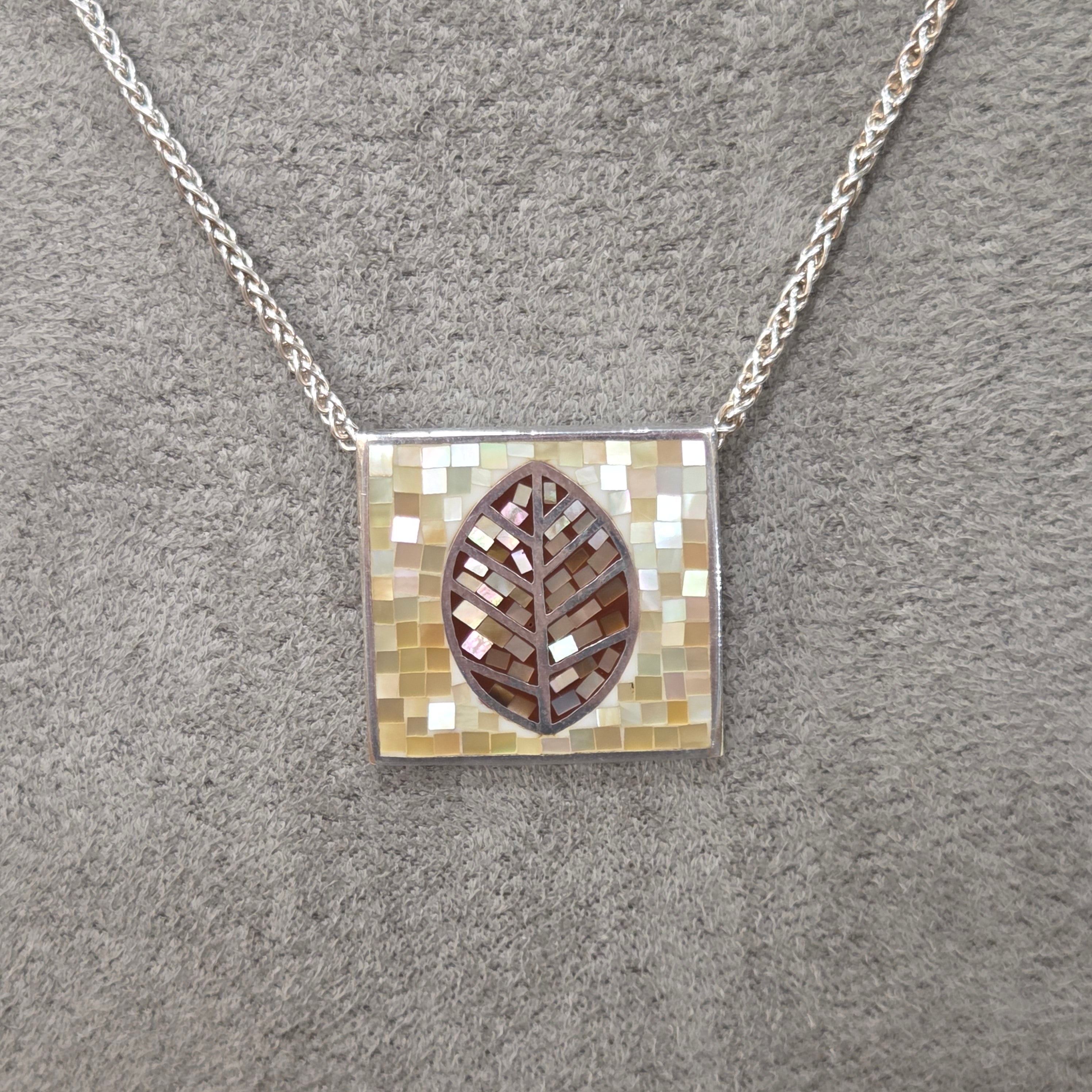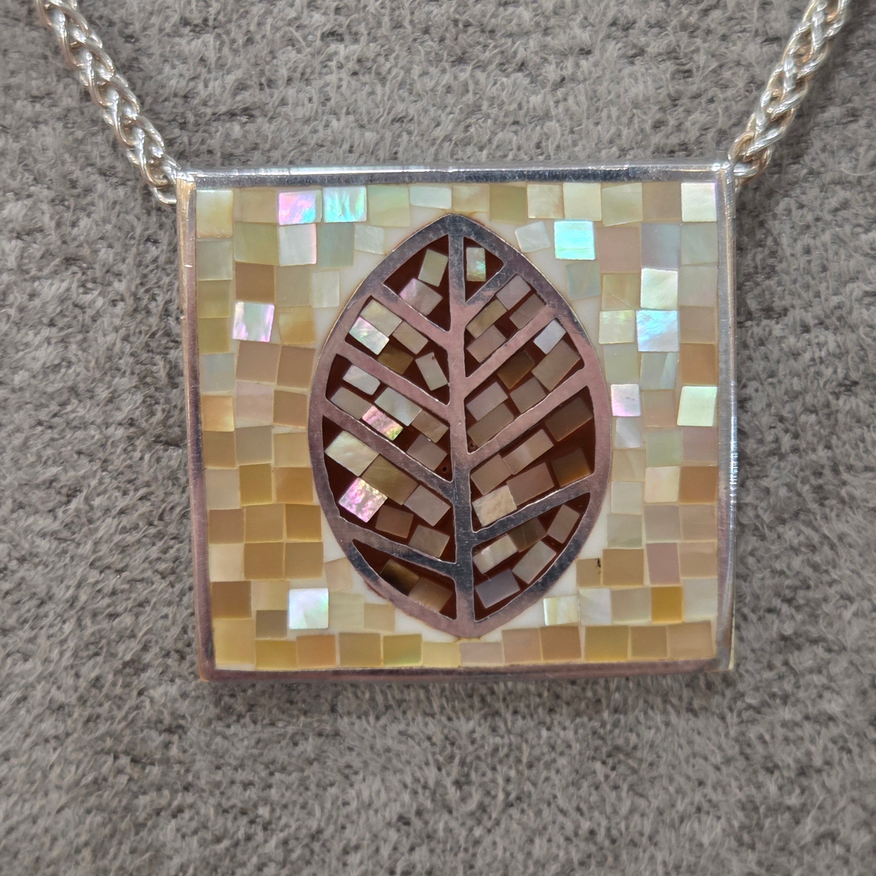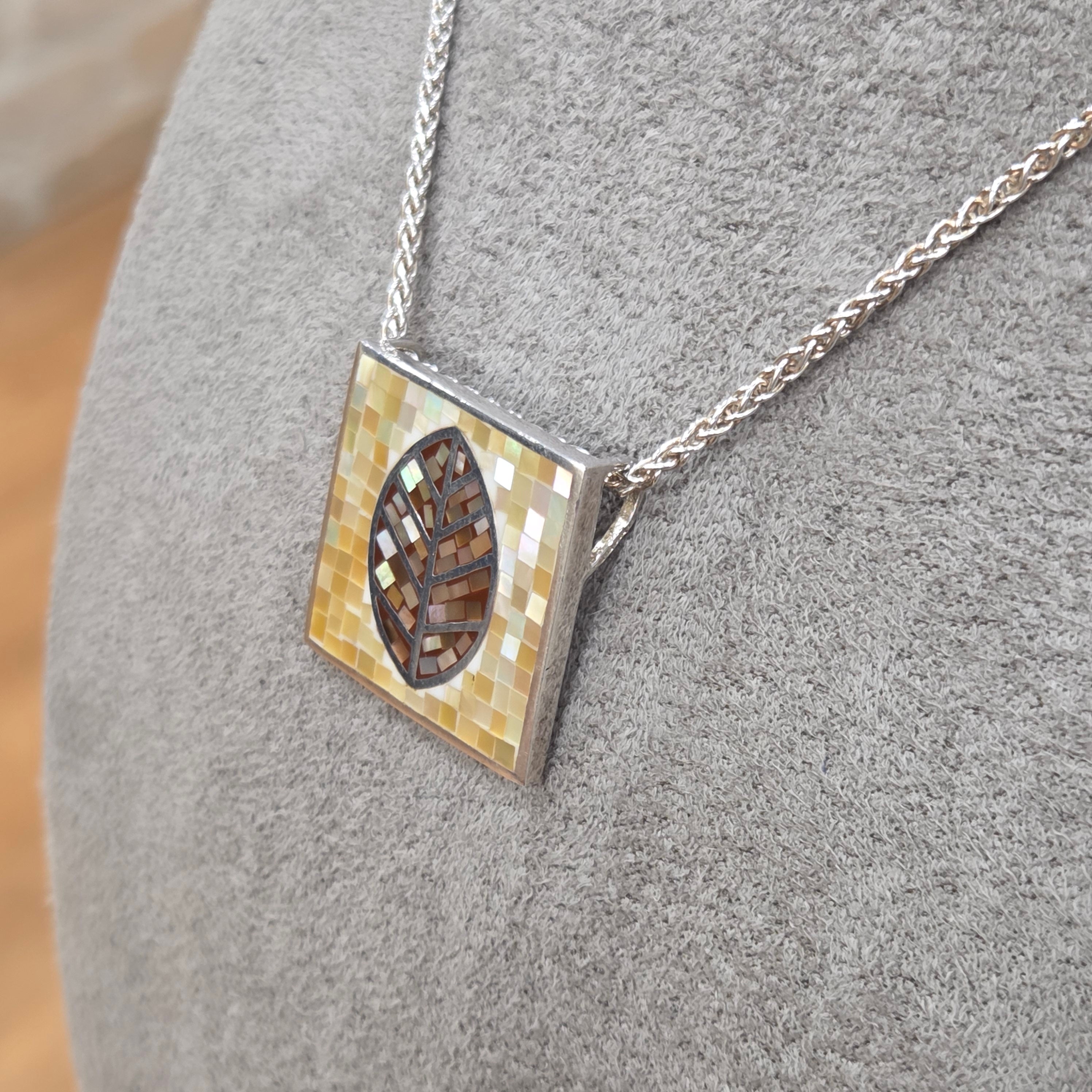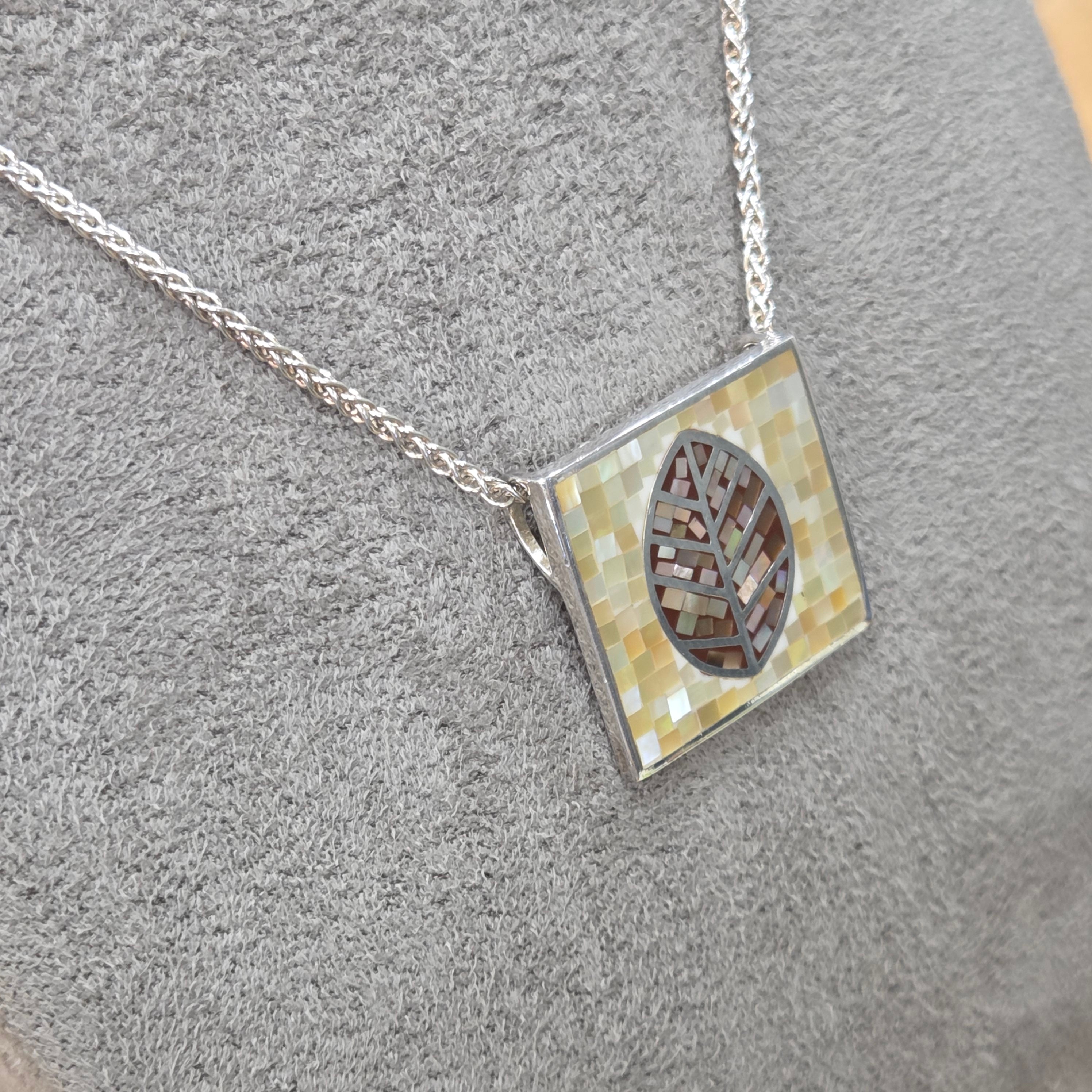 Delicate mother of pearl fragments come together in this captivating pendant, creating an intricate leaf design that catches the light beautifully. The square tile silhouette showcases masterful craftsmanship, with each iridescent piece perfectly positioned to form a harmonious natural motif. A truly distinctive accessory that brings elegance and artistry to any collection.
