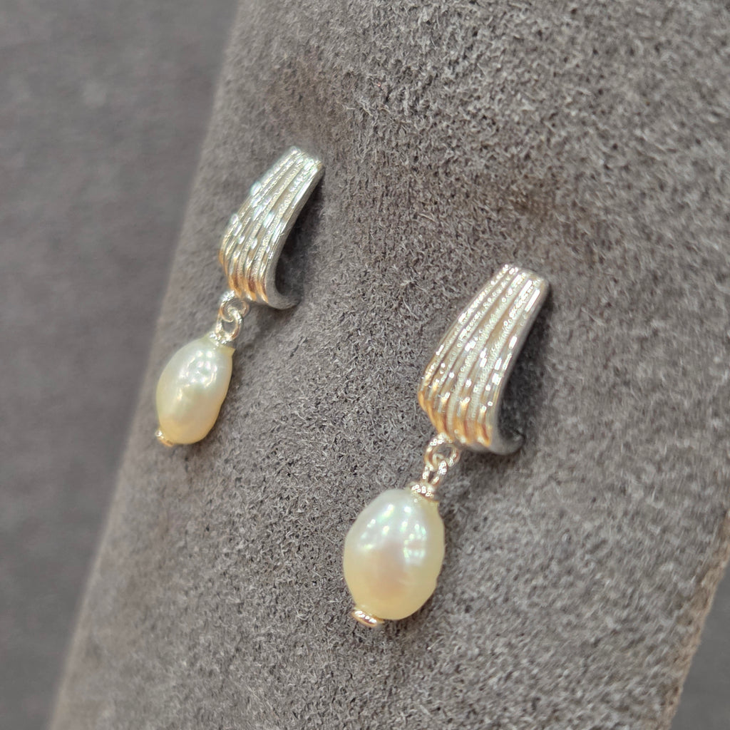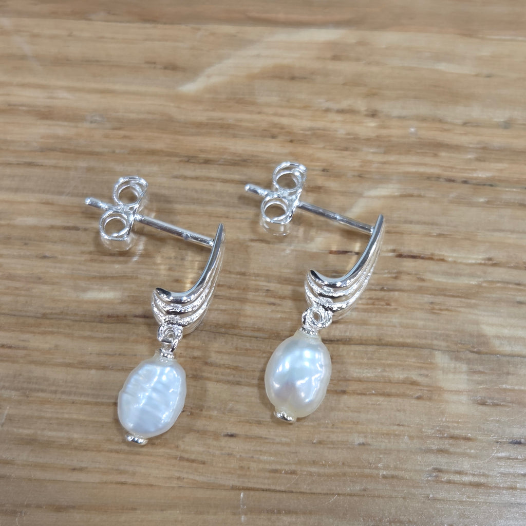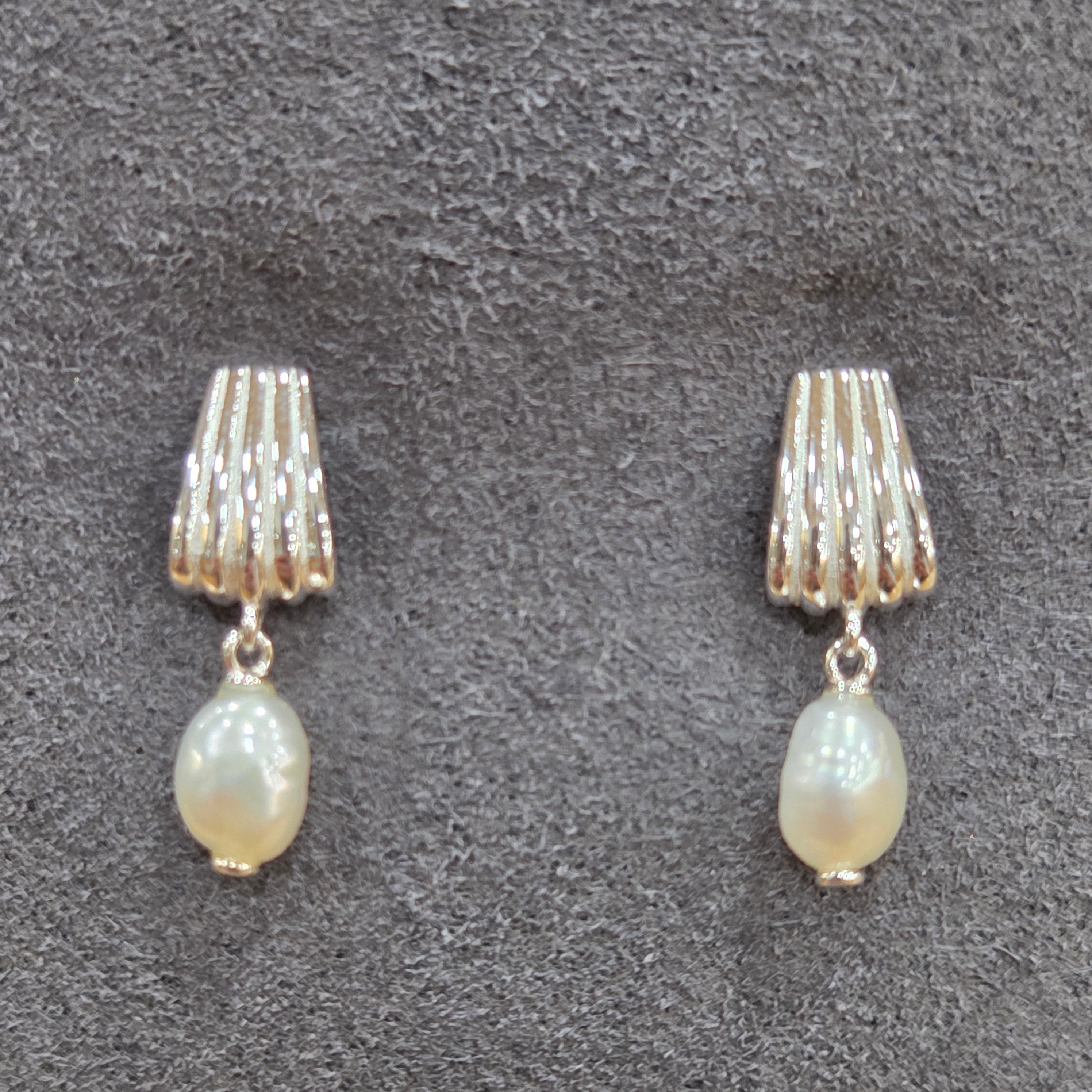 These silver drop earrings feature a vintage shell-inspired design paired with lustrous freshwater pearls, creating a timeless and elegant accessory. A coordinating pendant is also offered to perfectly complement these earrings.