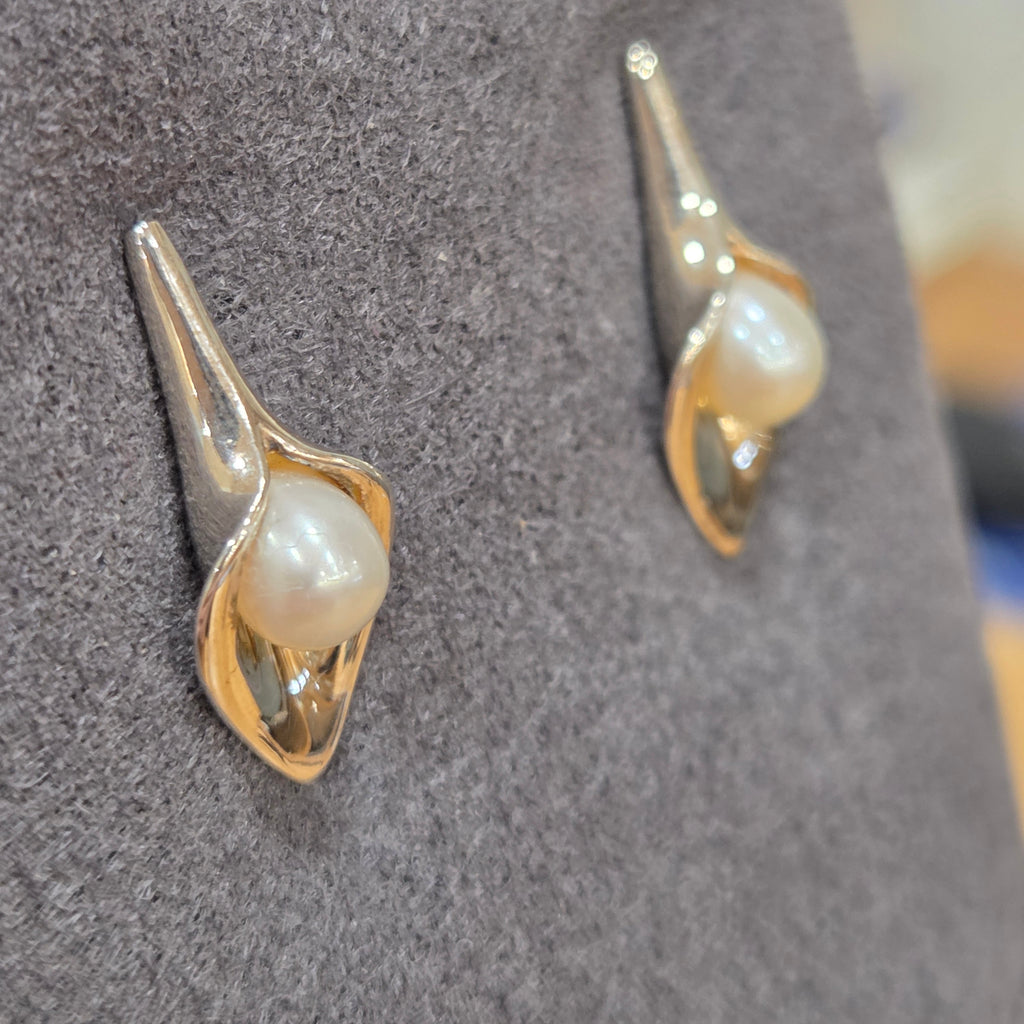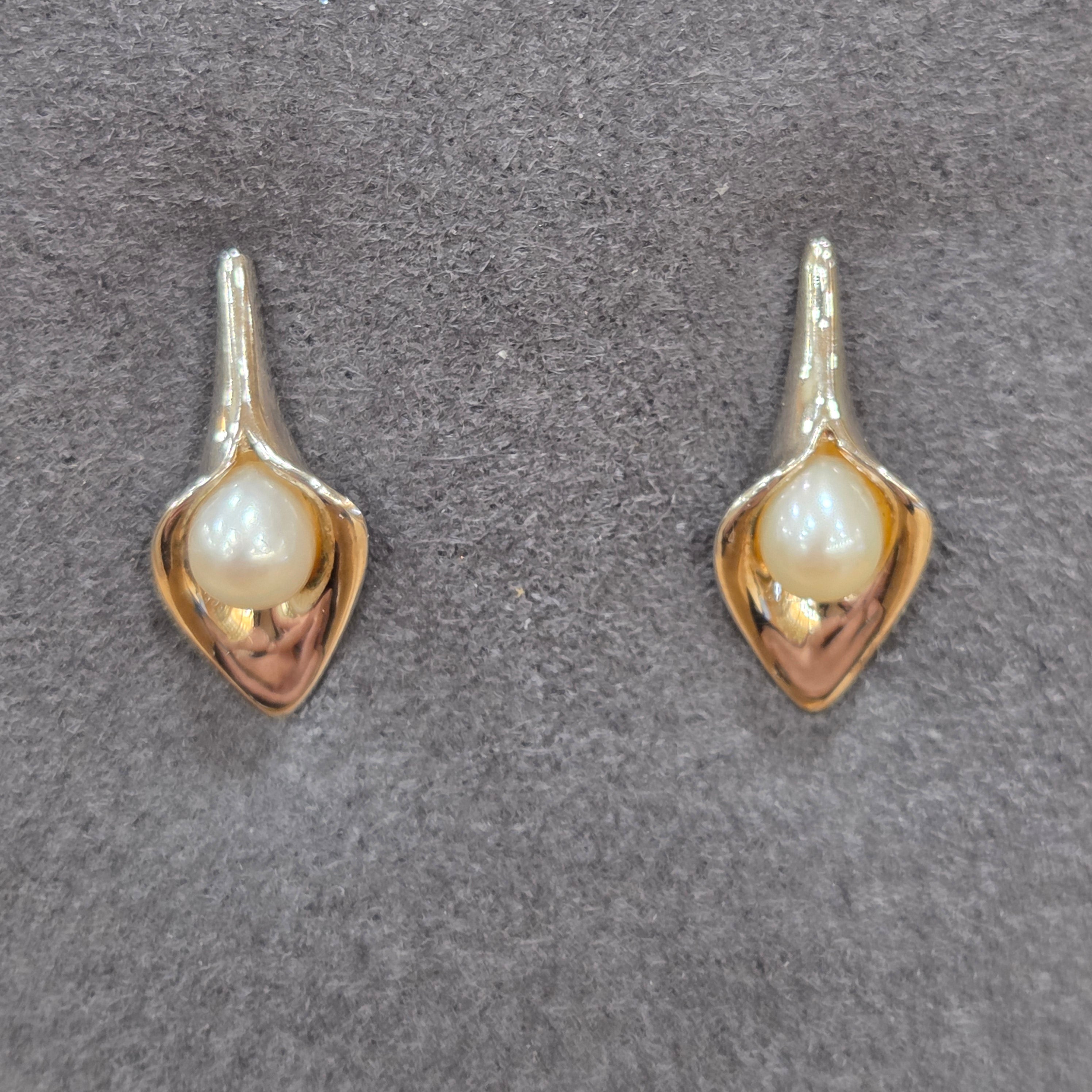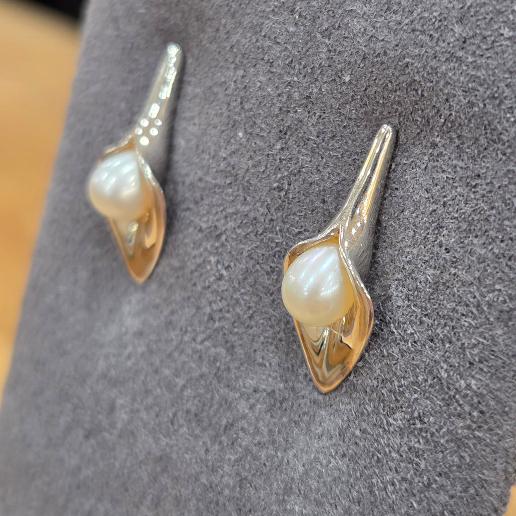 Handmade sterling silver and white freshwater pearl small Calla Lily design stud earrings, pair with the matching pendant to complete the look.