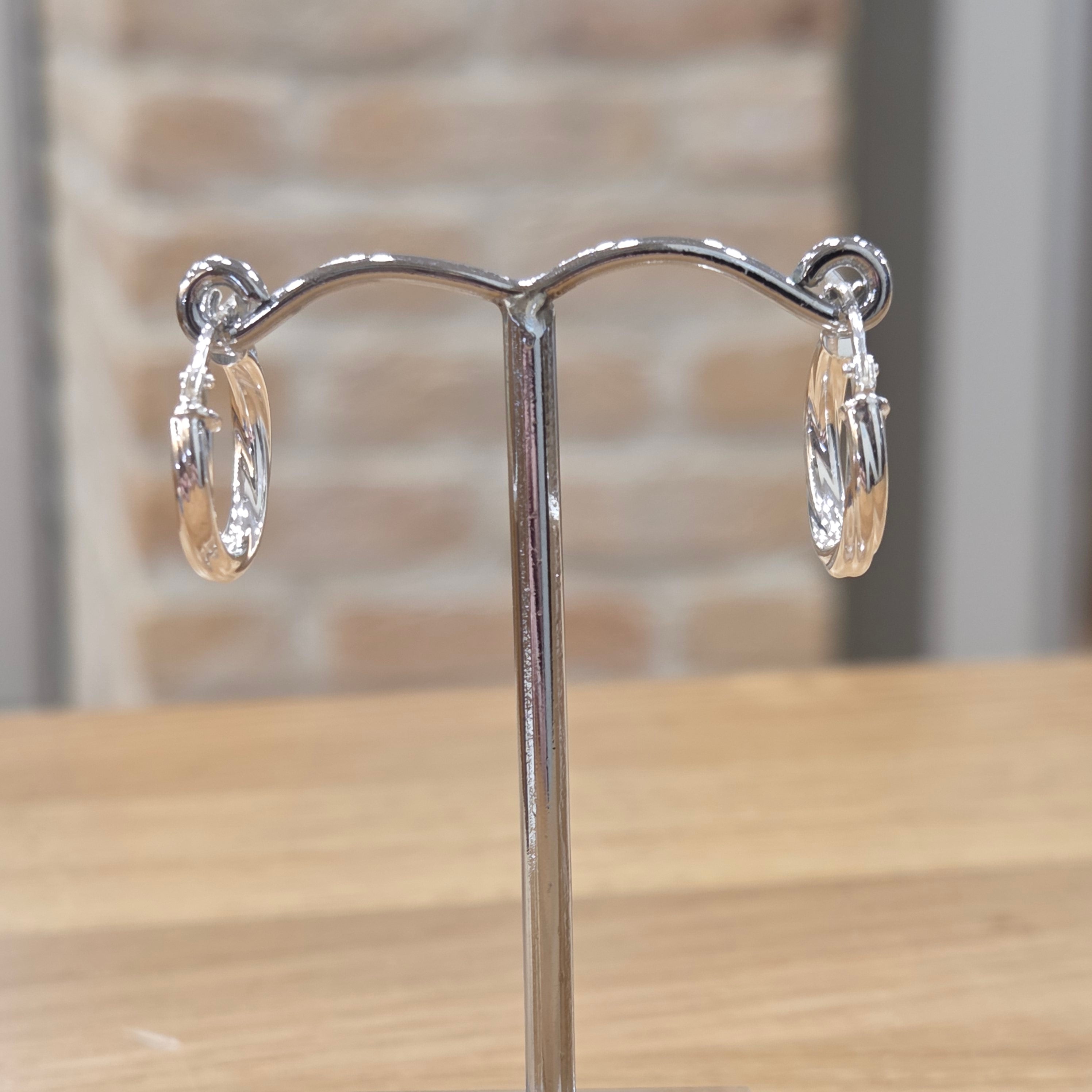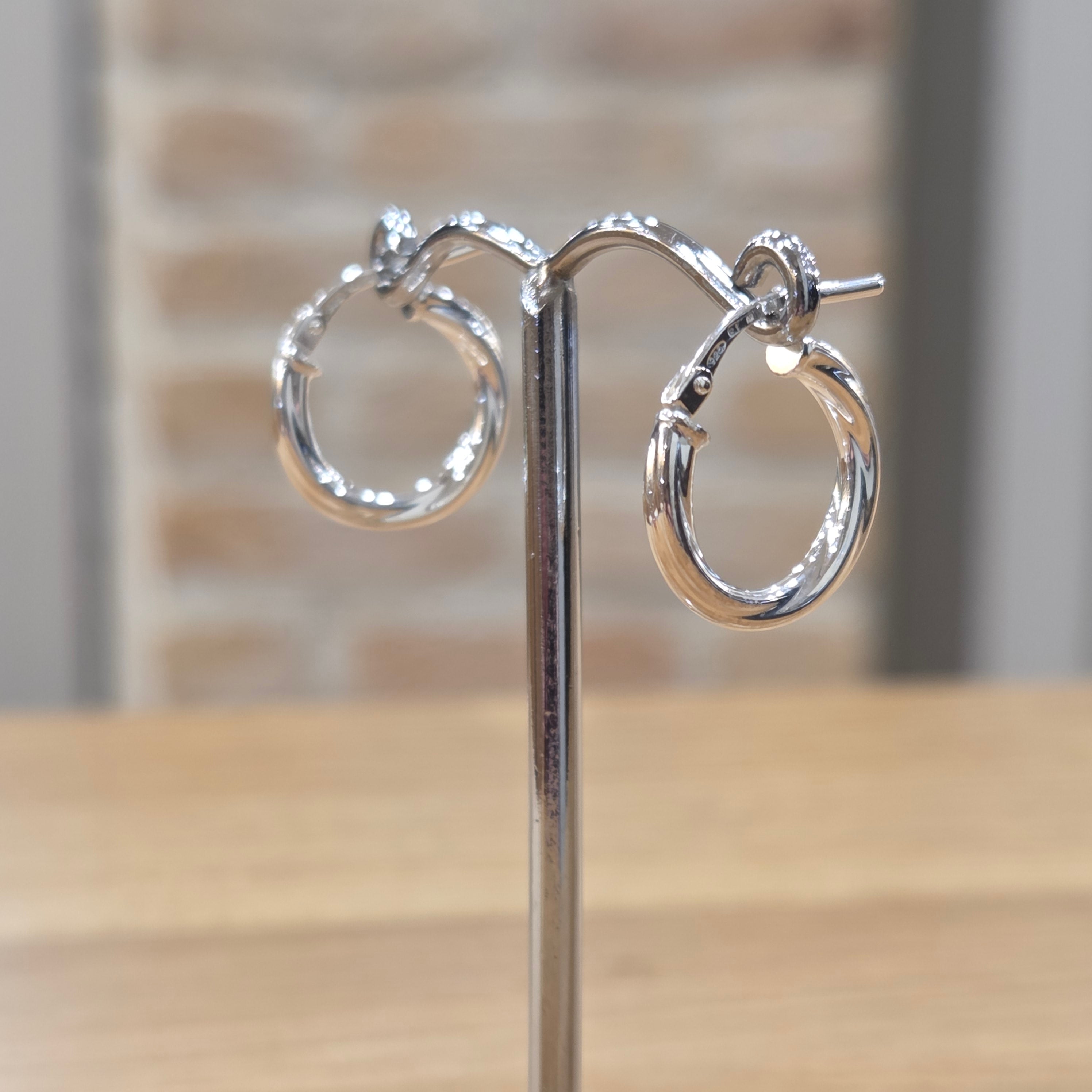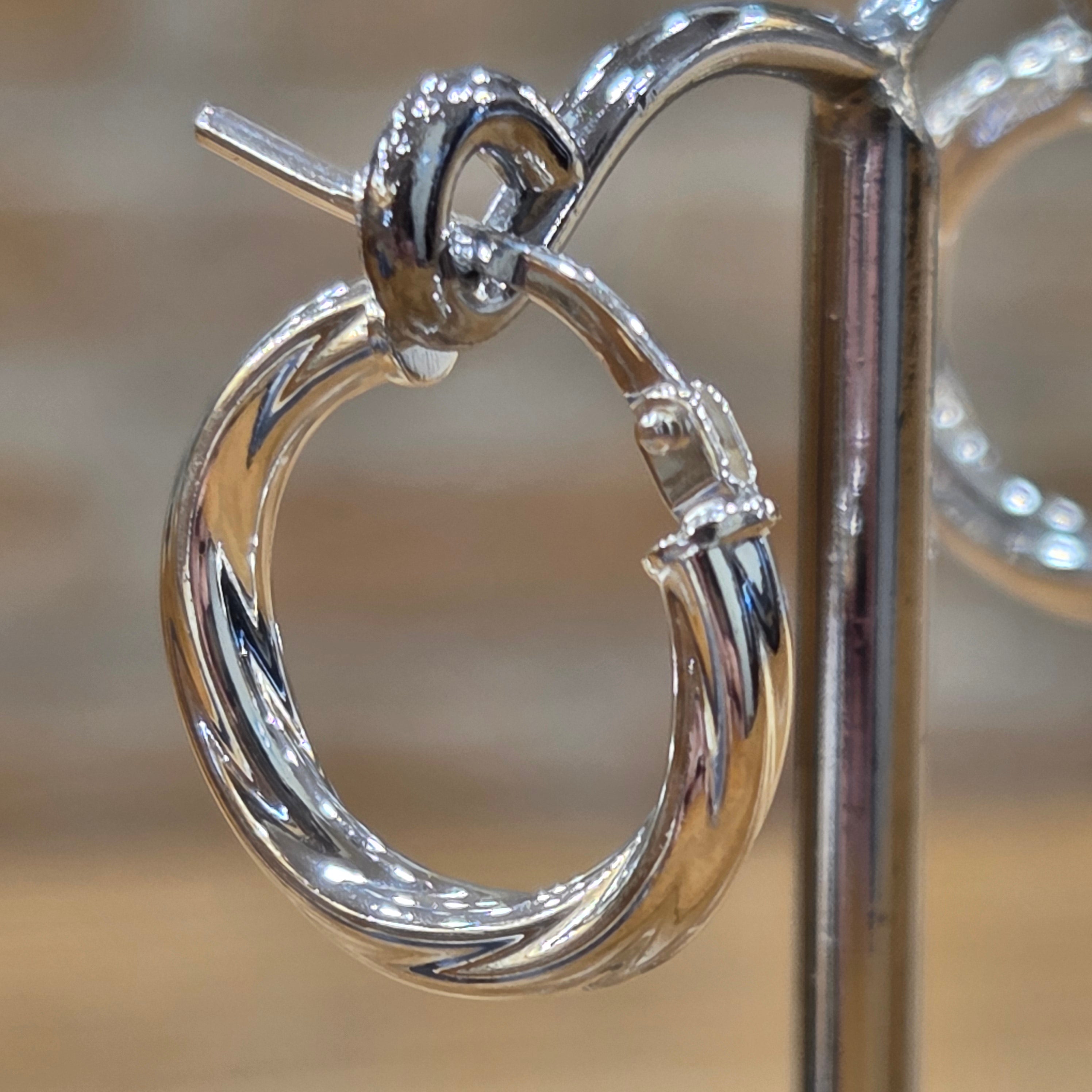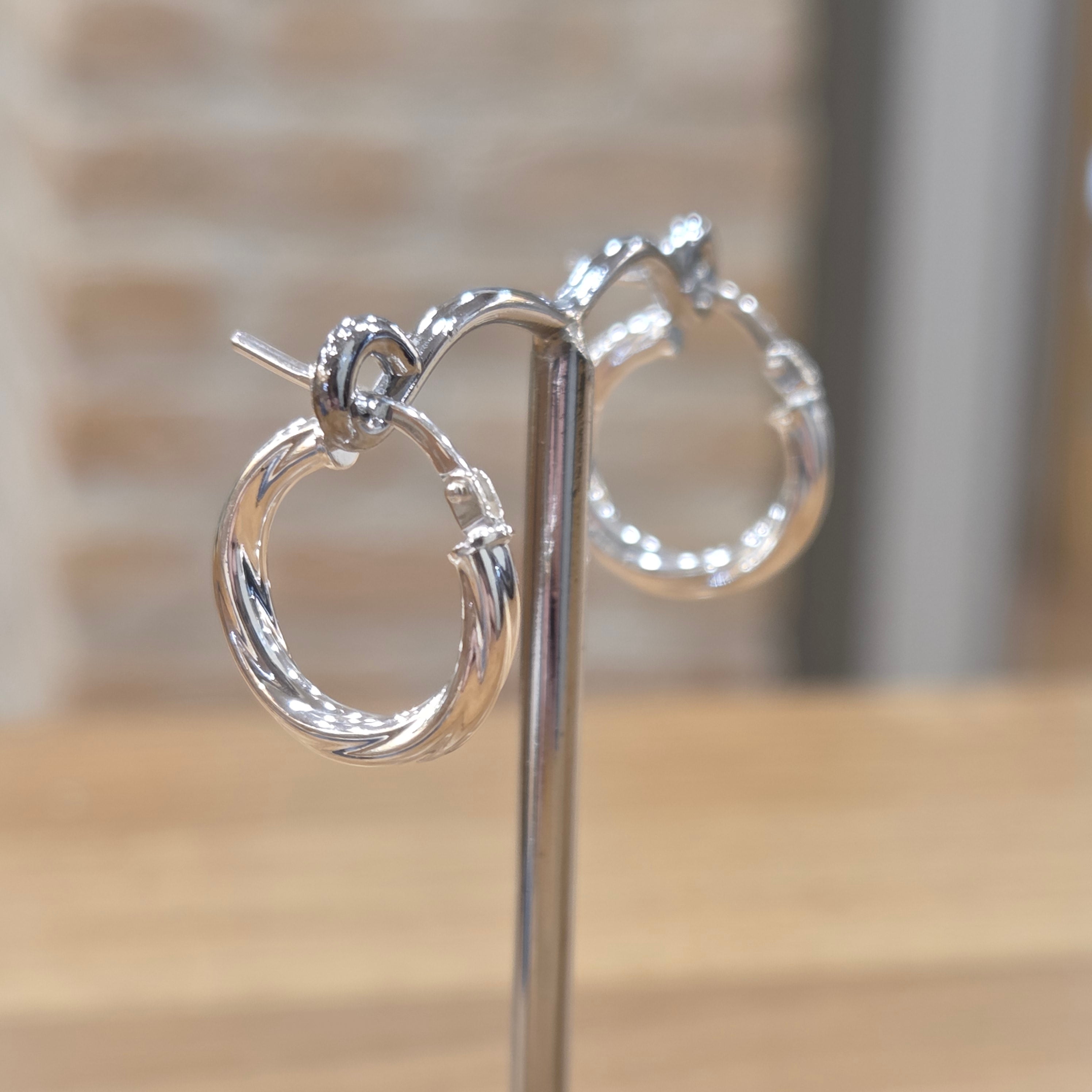 Delicate twisted silver hoops that add understated elegance to any look. Crafted from sterling silver, these petite earrings feature a subtle spiral design that catches the light beautifully. At 10mm diameter, they're perfectly sized for everyday wear or layering with other pieces. Timeless and versatile, they complement both casual and dressed-up styles effortlessly.