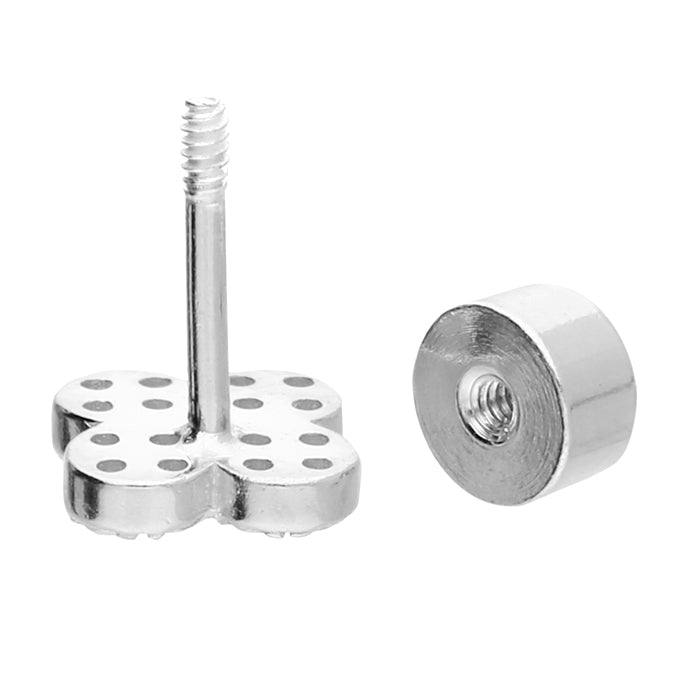Single rhodium plated sterling silver earring, cubic zirconia quatrefoil with labret stud. Labret studs were originally designed for use in lip piercing, but this is now a term now also commonly applied to studs used for a variety of ear piercings, from earlobes to conch and upper ear piercings. Our studs are designed to be worn in the ear. They function in the same way as a butterfly back but are 'threaded' and screw-in which makes them very secure. Not recommended for new piercings.