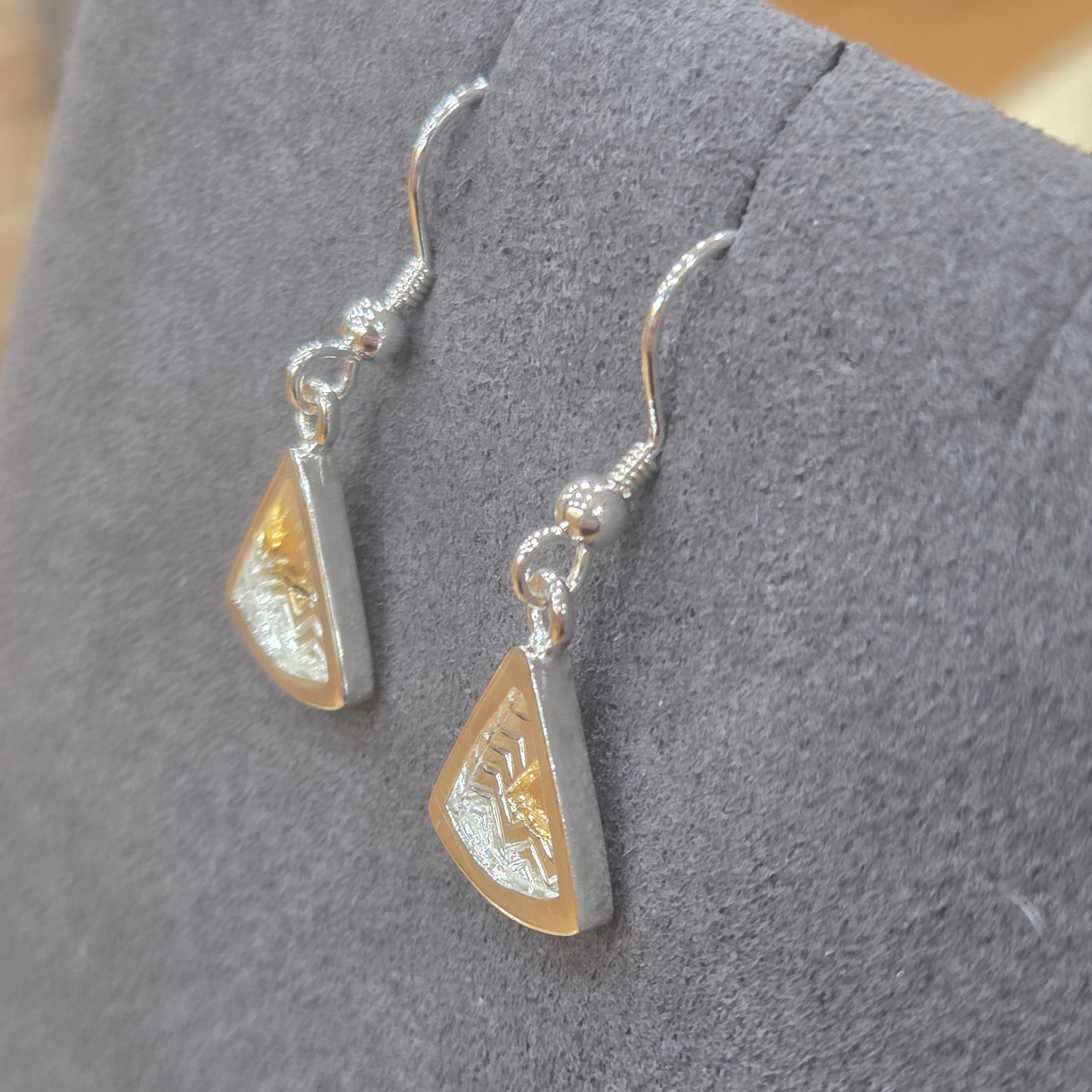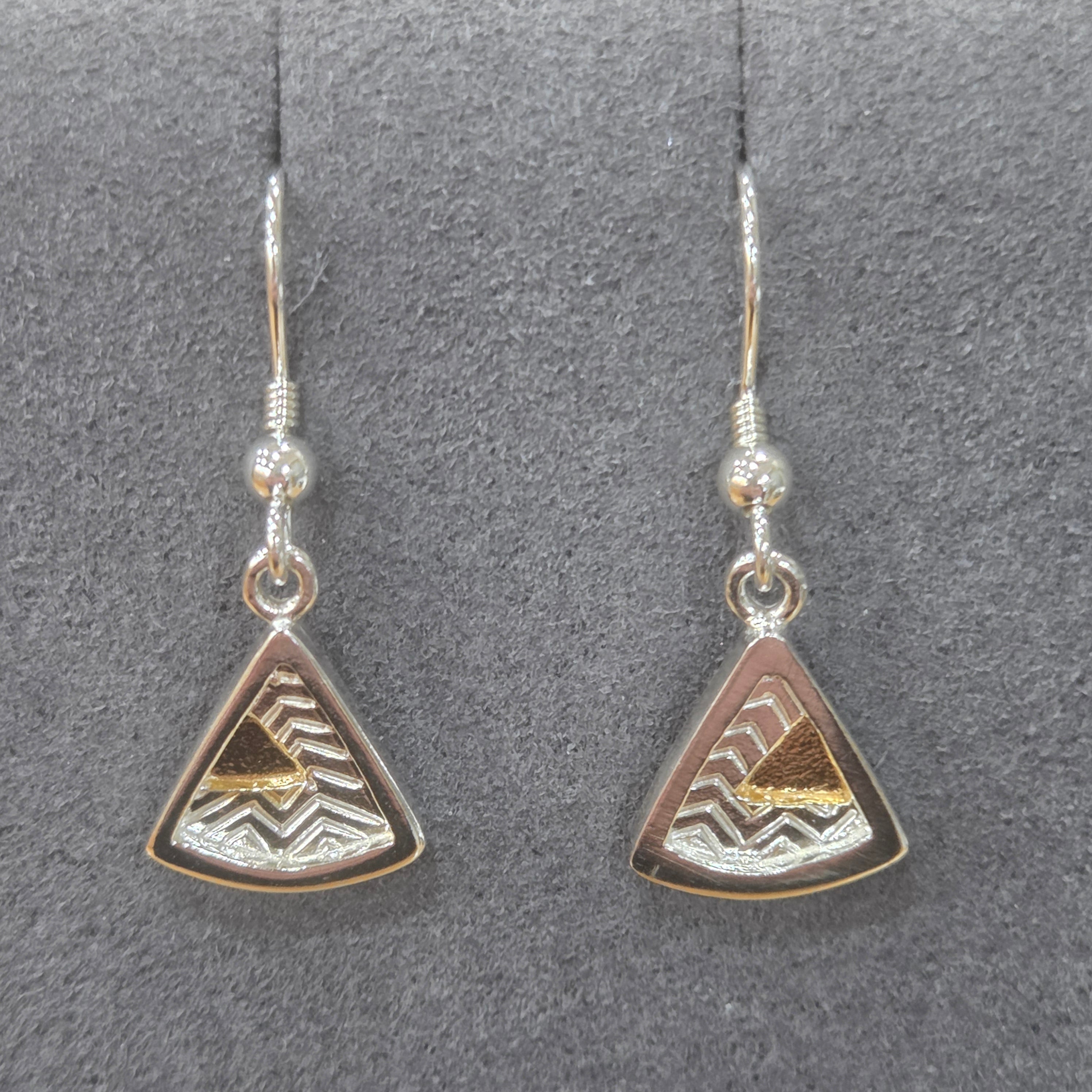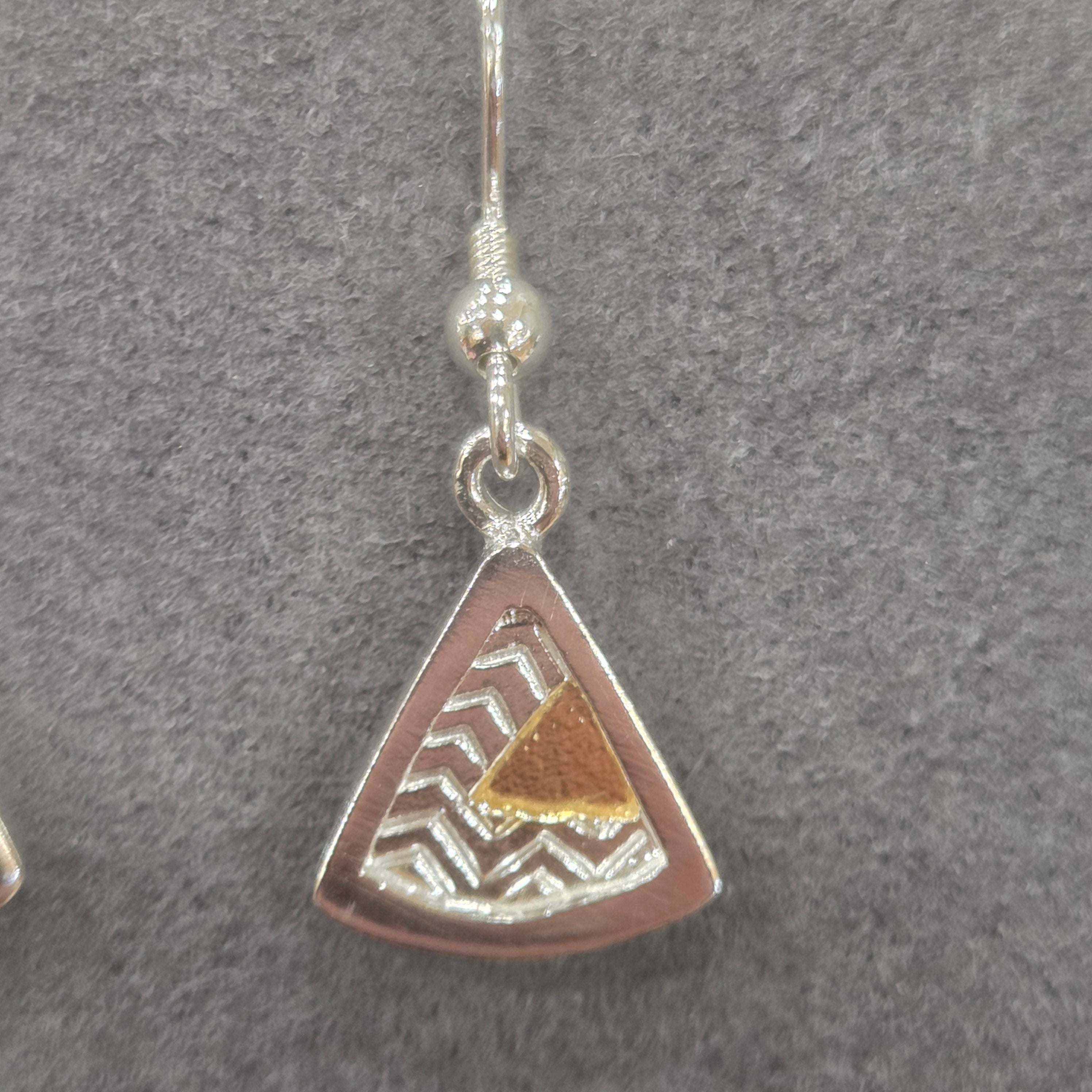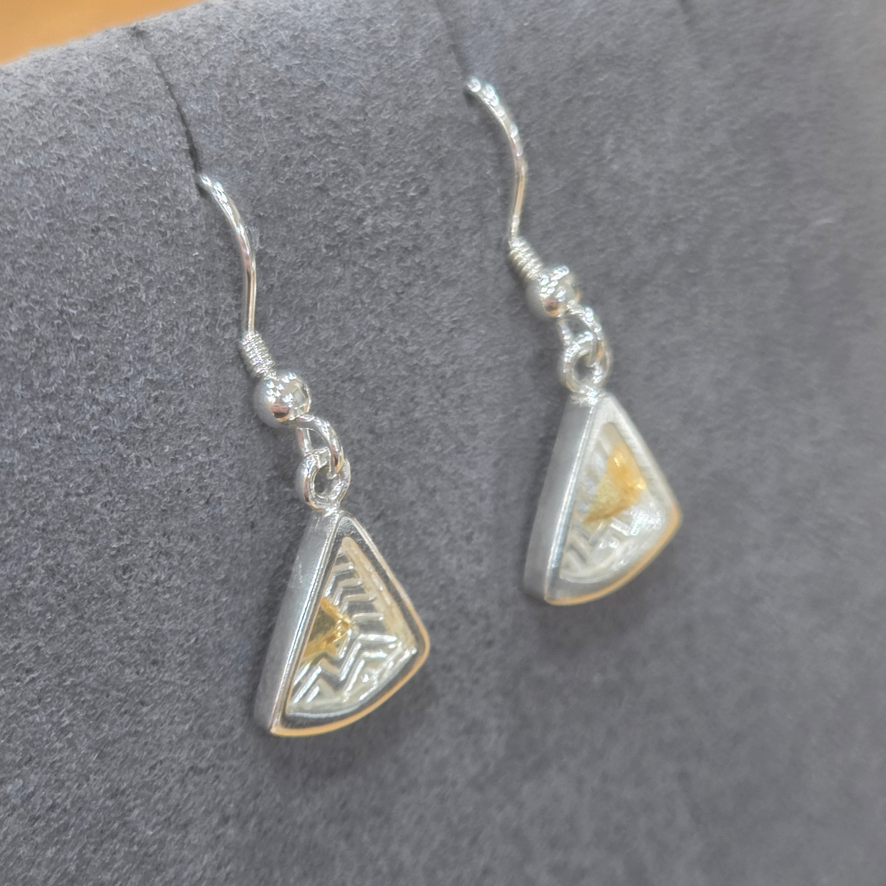 Elevate your everyday style with these handcrafted sterling silver drop earrings, featuring a striking triangular design inspired by the Tri Chosan aesthetic. Each piece showcases a delicate textured finish that catches the light beautifully, complemented by luxurious 18ct gold vermeil accents. The geometric silhouette offers modern sophistication, while the artisanal craftsmanship ensures a truly unique addition to your jewellery collection. Perfect for those who appreciate contemporary design with a touch of understated elegance.