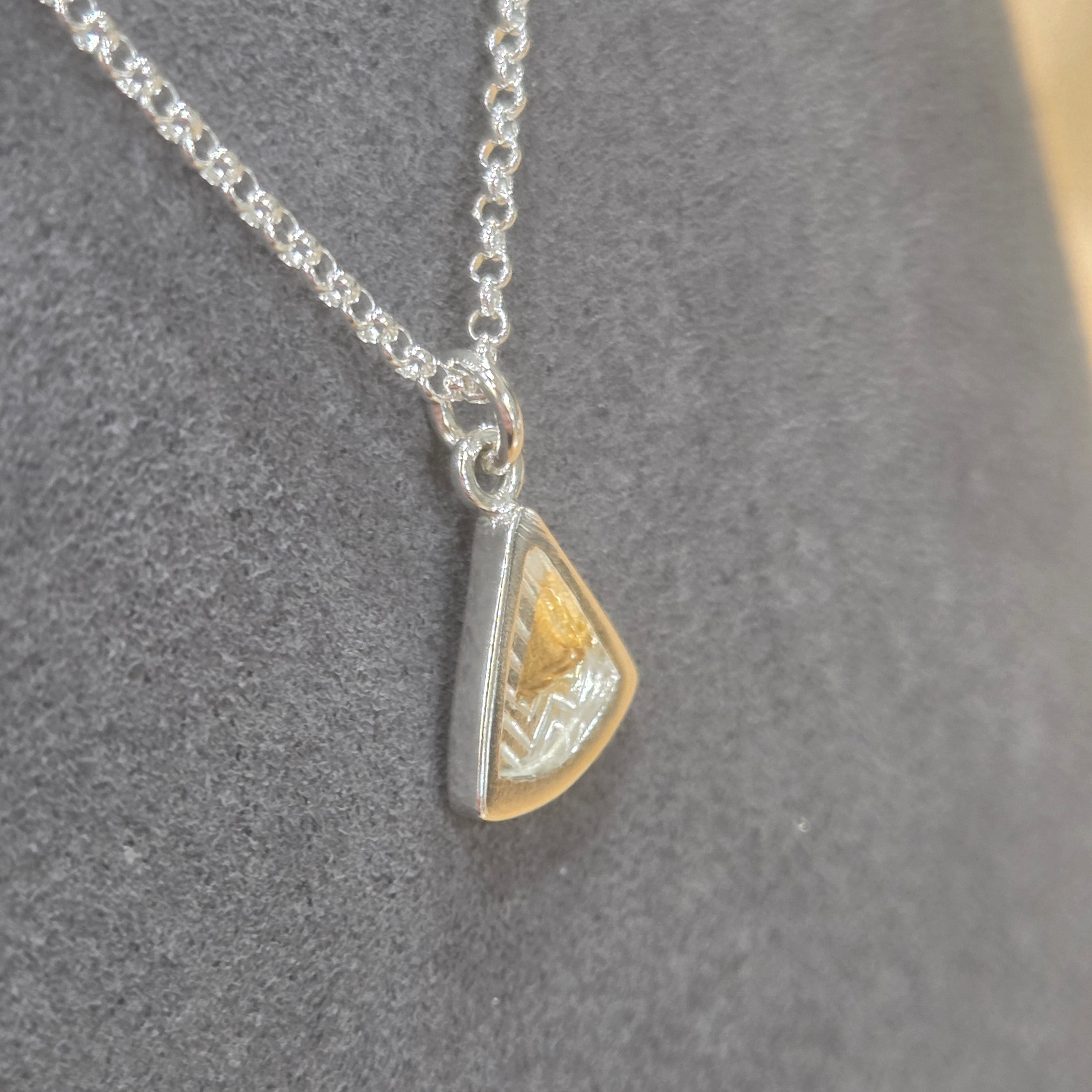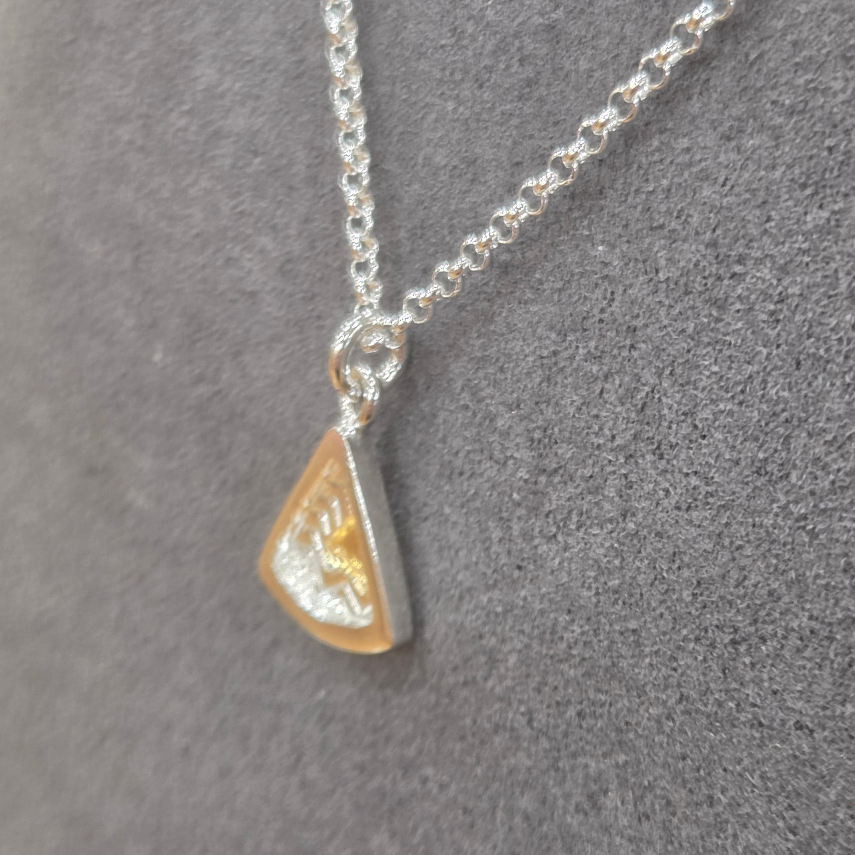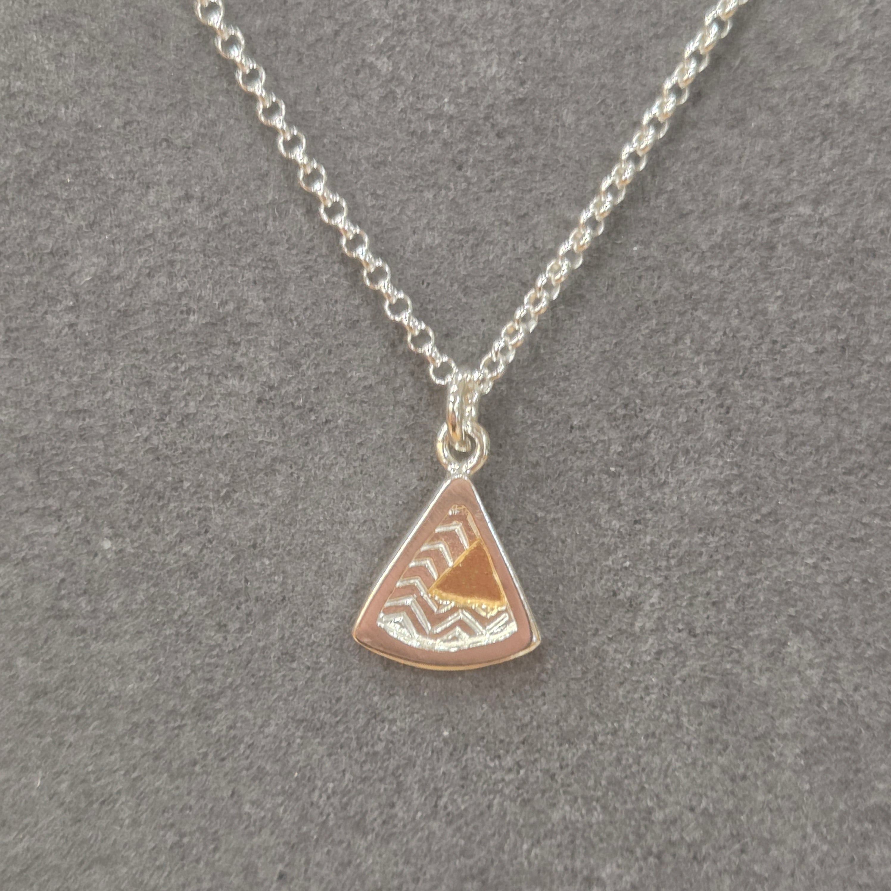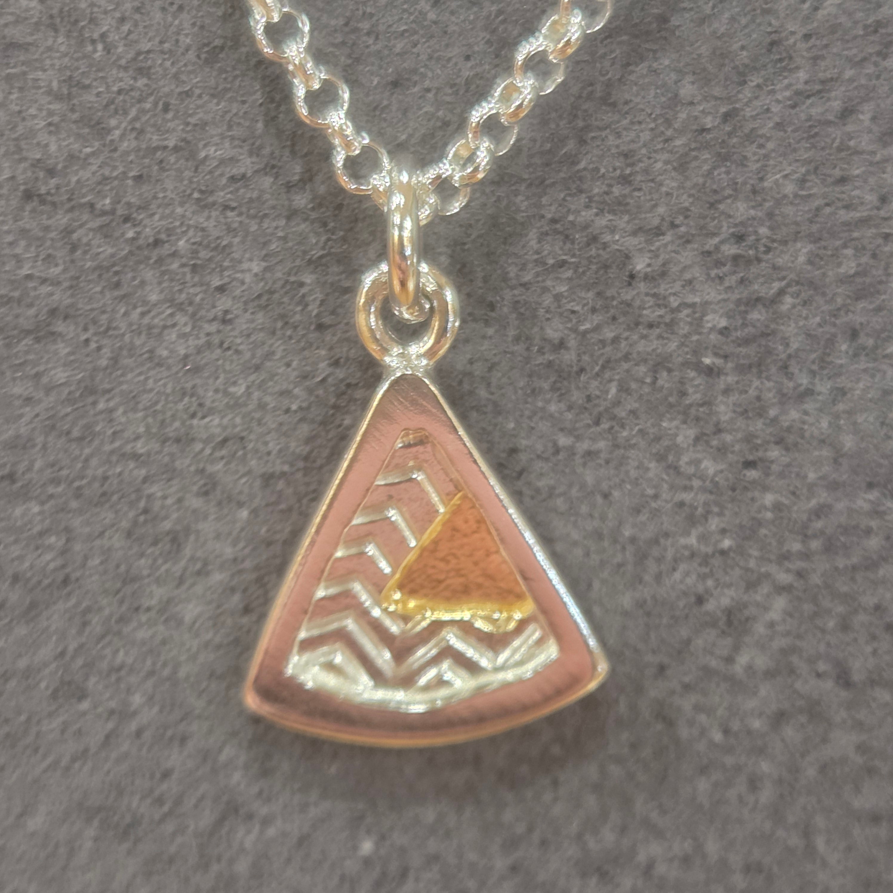 Handmade sterling silver pendant featuring the Tri Chosan design—a striking triangular form with textured detailing and 18ct gold vermeil accents. Each piece is individually crafted to showcase the interplay between polished silver and warm gold tones. Arrives complete with an 18" silver chain, ready to wear.