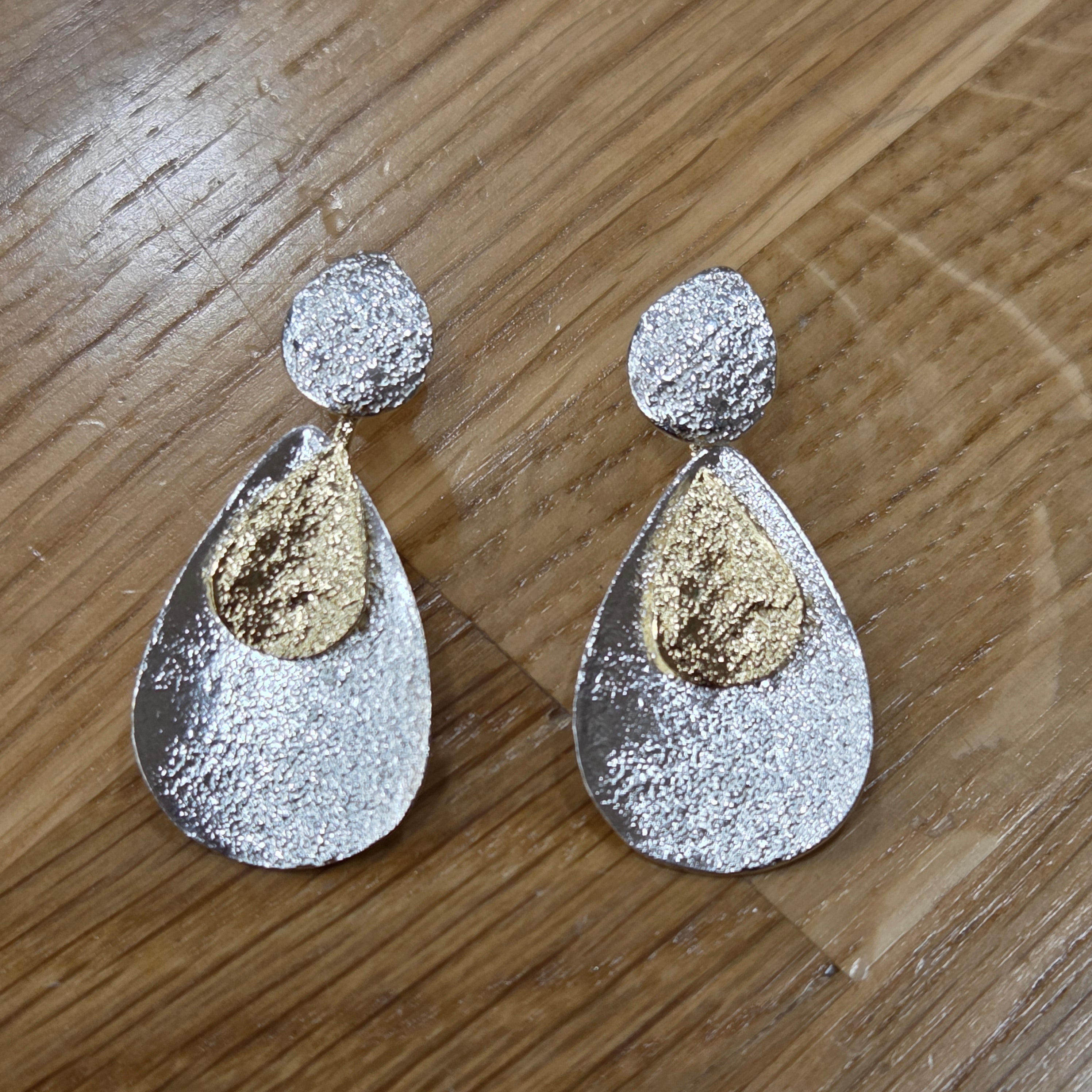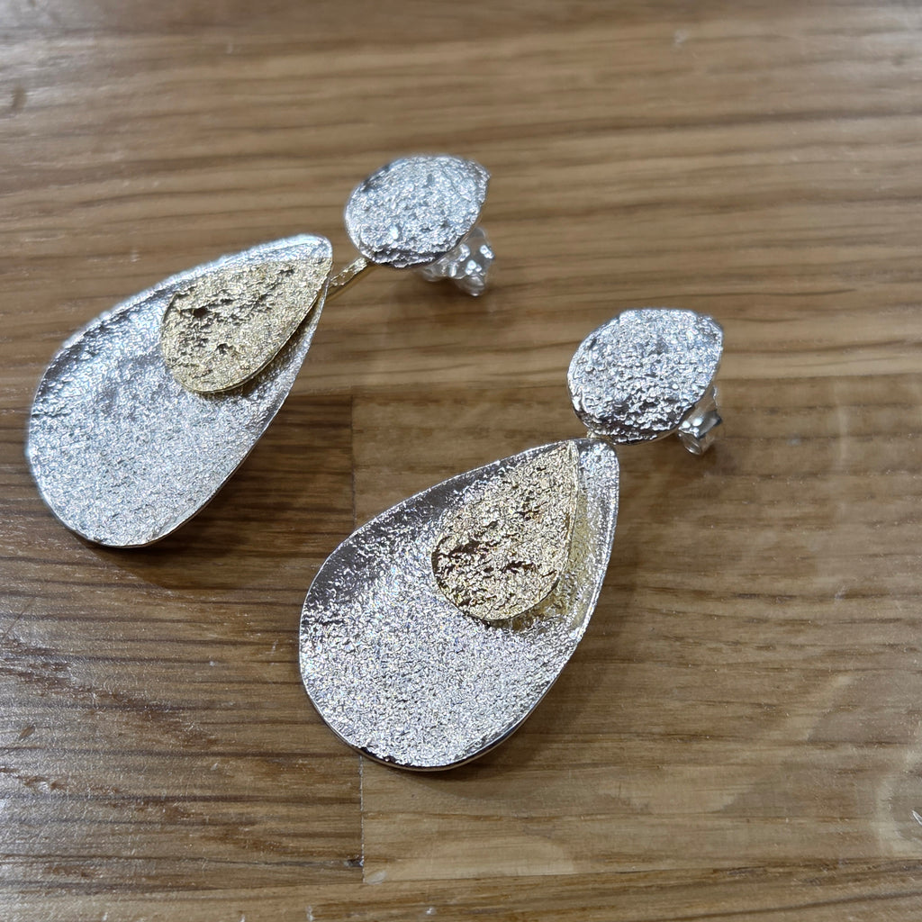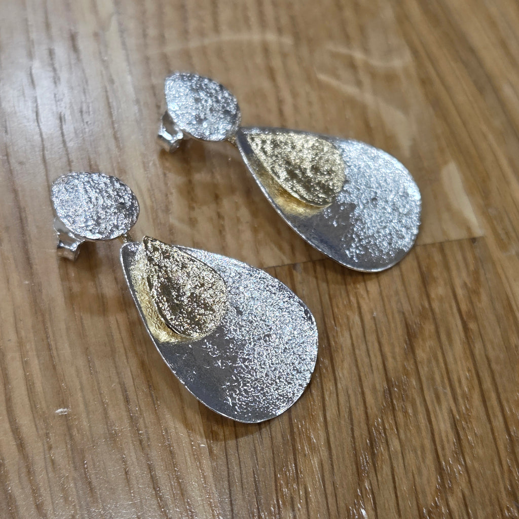 Experience the allure of mixed metallics with these exquisite articulated drop earrings. Crafted with a graceful teardrop shape, they seamlessly blend sterling  silver and gold plating to create a sophisticated two-tone aesthetic. The textured scratch finish adds contemporary dimension and visual interest, while the articulated design ensures fluid, eye-catching movement. Perfect for those who appreciate refined elegance, these versatile earrings transition effortlessly from day to evening, making them an essential addition to any jewellery collection.