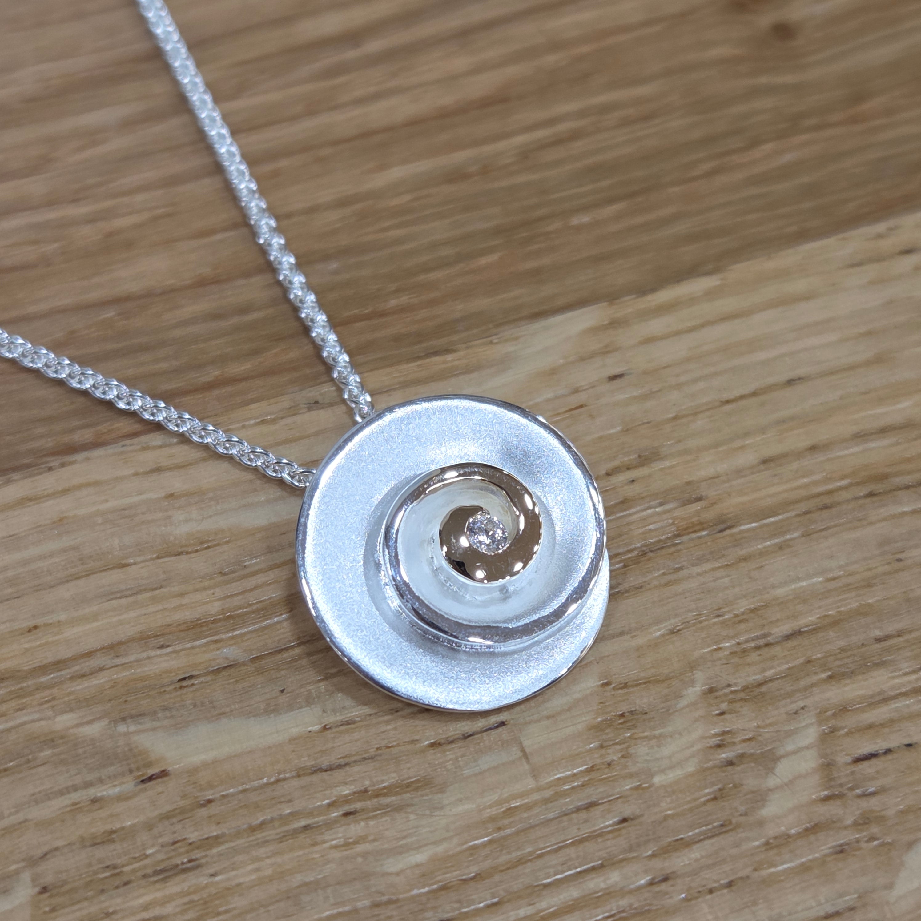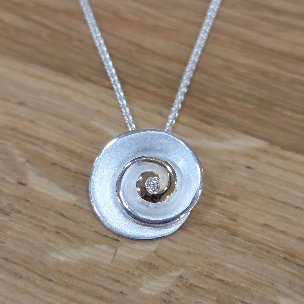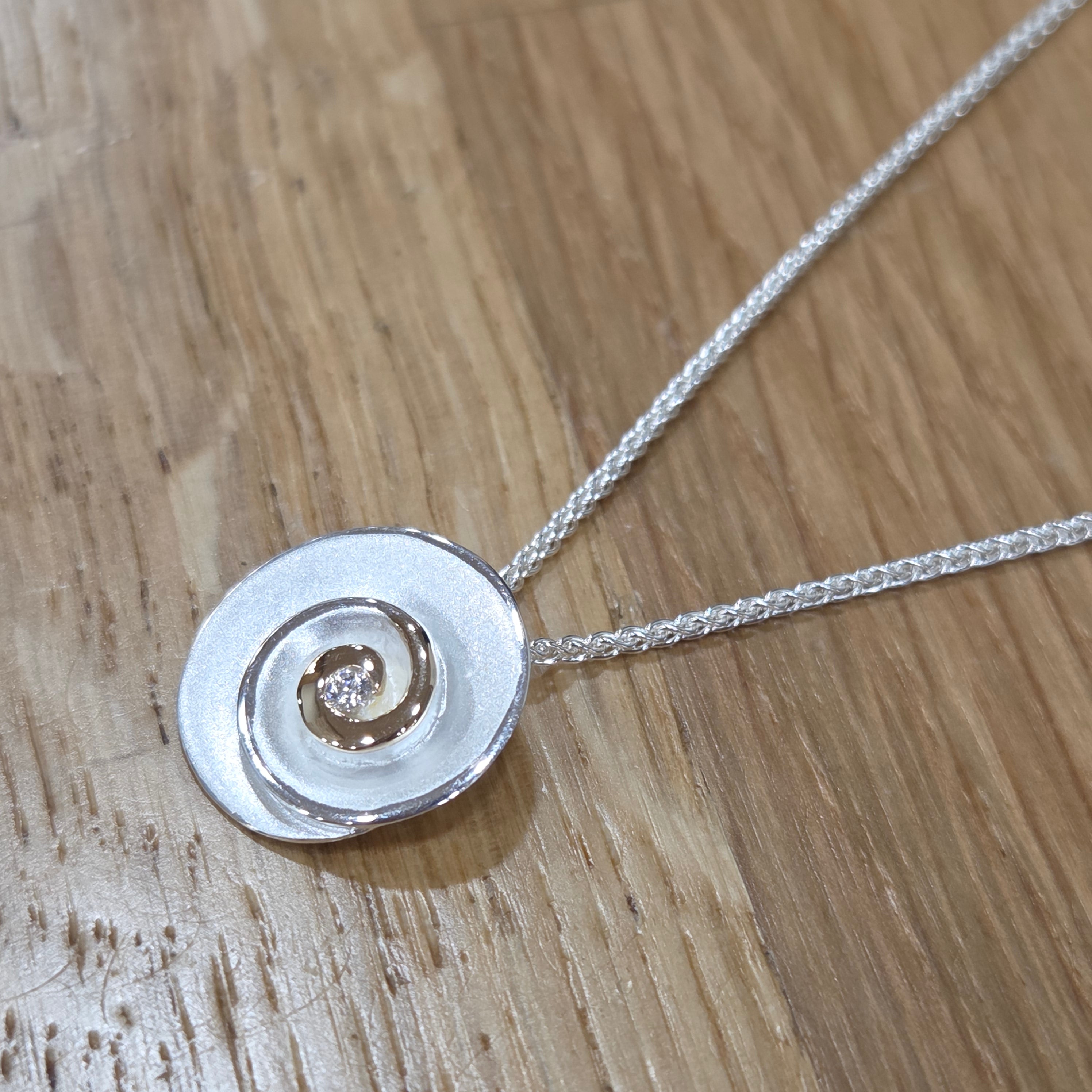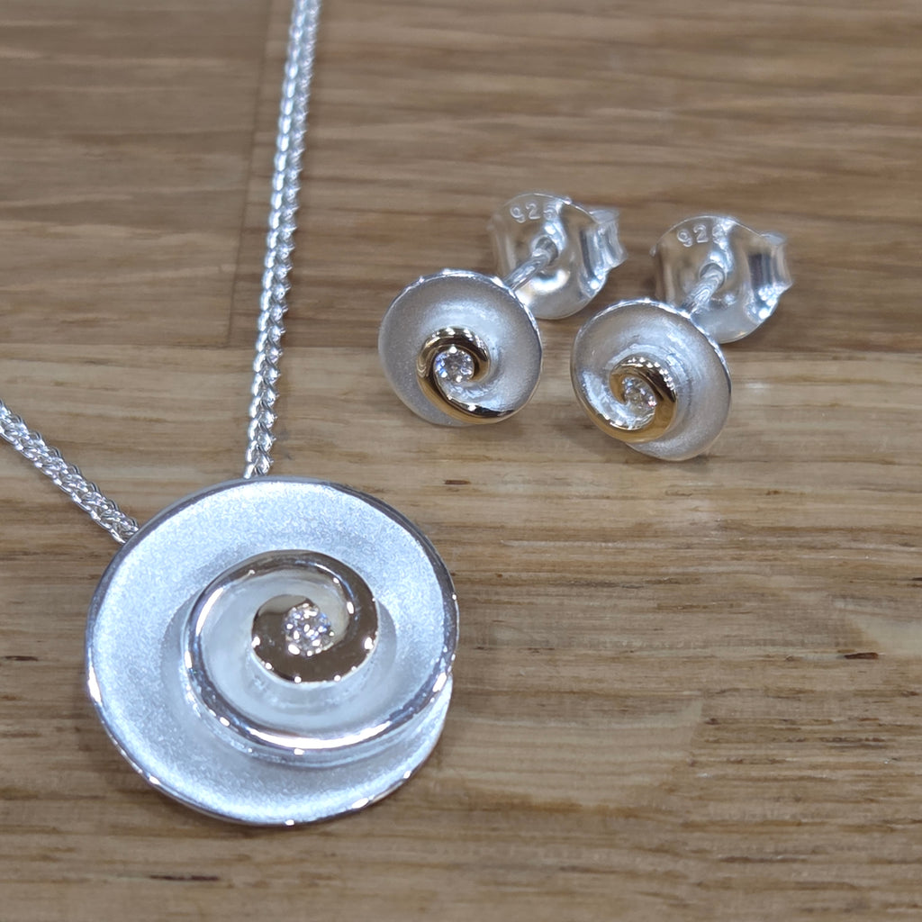 Stunning two-tone pendant in shell design with tiny diamond and 9 carat gold detailing on a sterling silver matt and polished finish.  Pair with the matching studs to finish the look.